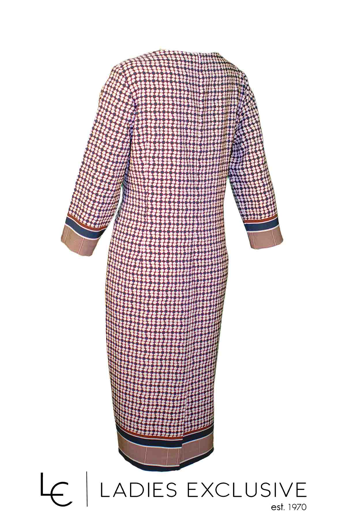 BELLA P. Φόρεμα εμπριμέ σε αποχρώσεις καφέ κρεπ σε ίσια γραμμή με μανίκι 3/4.