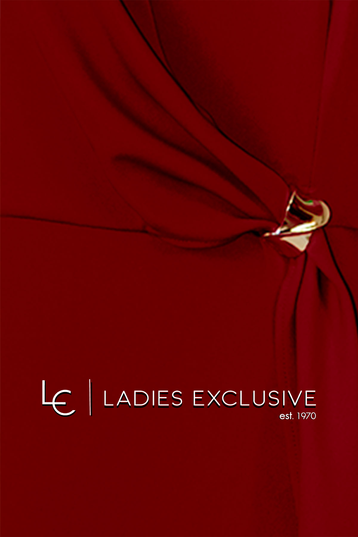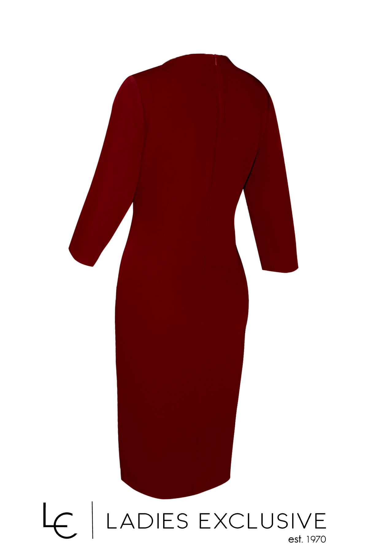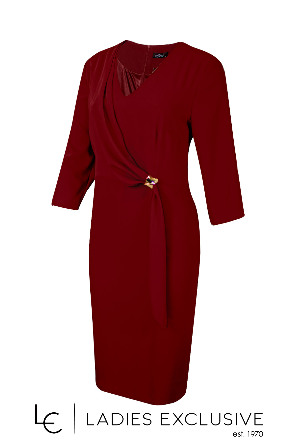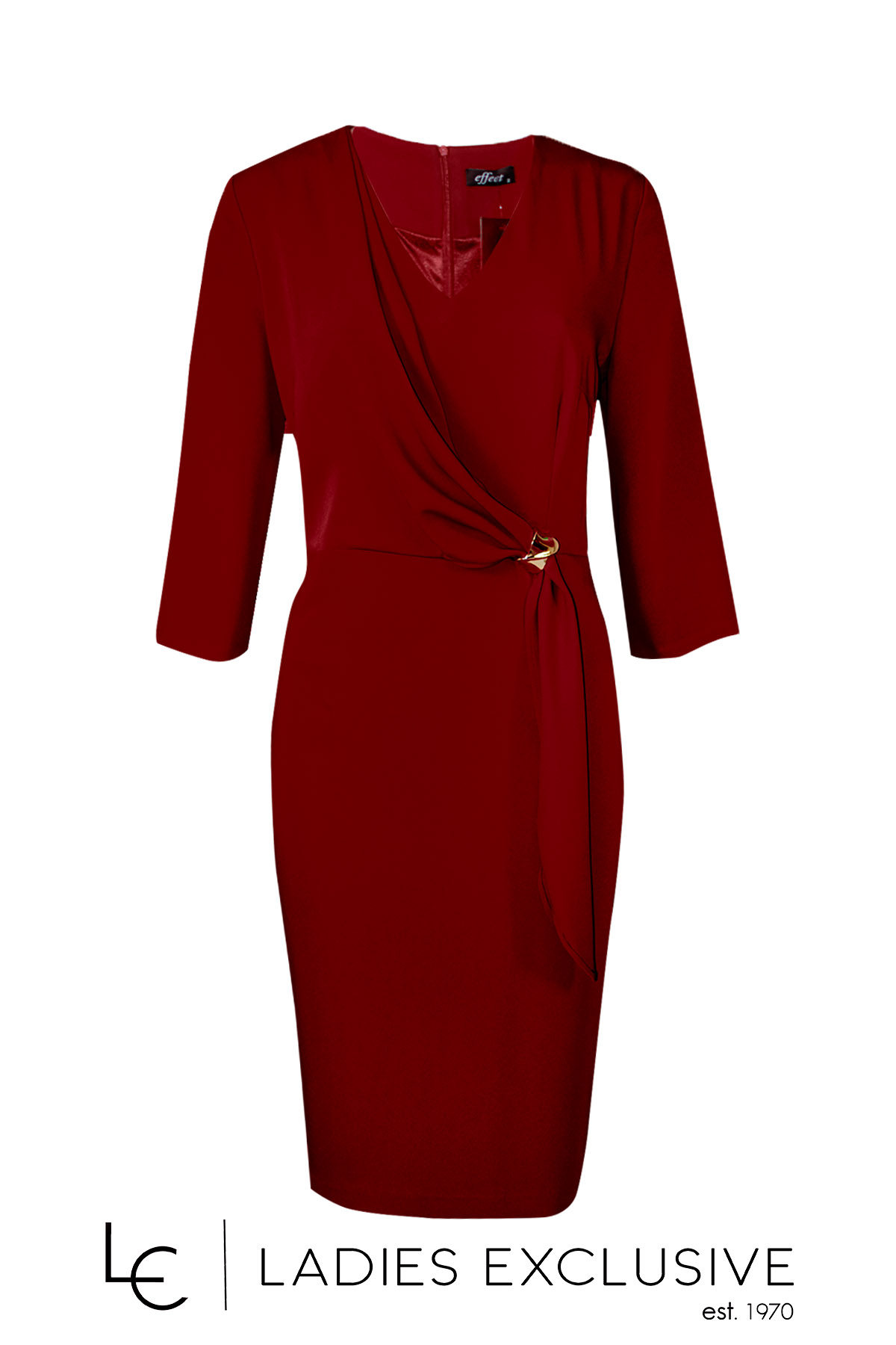 EFFECT Φόρεμα μπορντώ κρεπ με ντραπέ σχέδιο με μεταλλίκη λεπτομέρεια, άνοιγμα v και μανίκι 3/4.