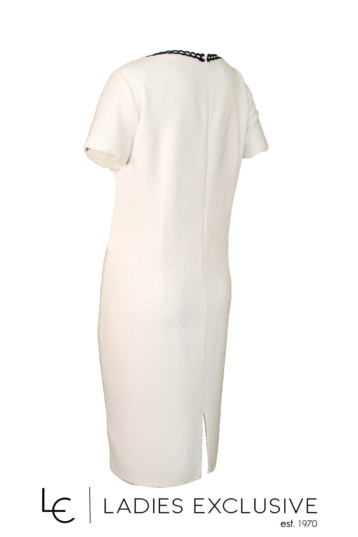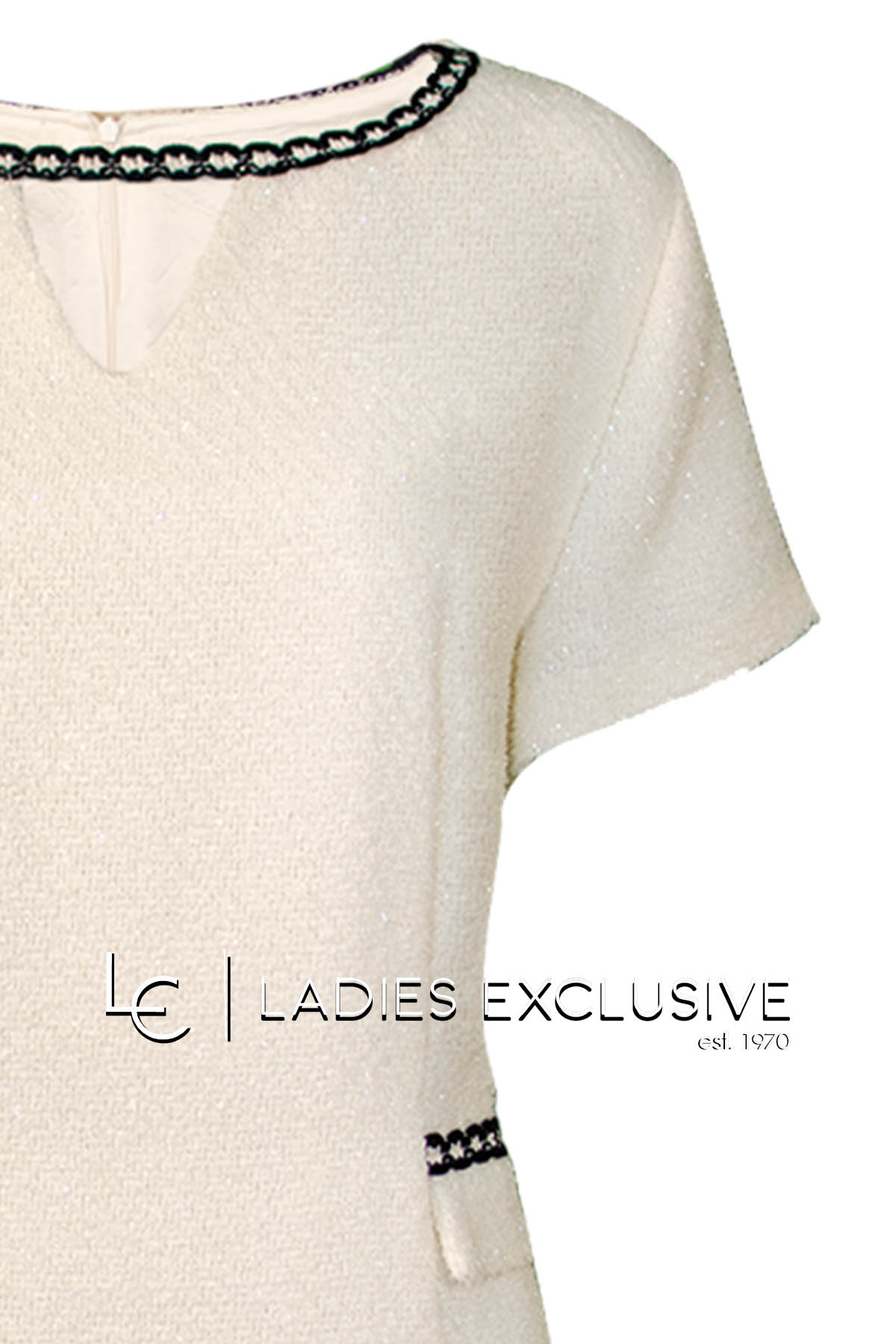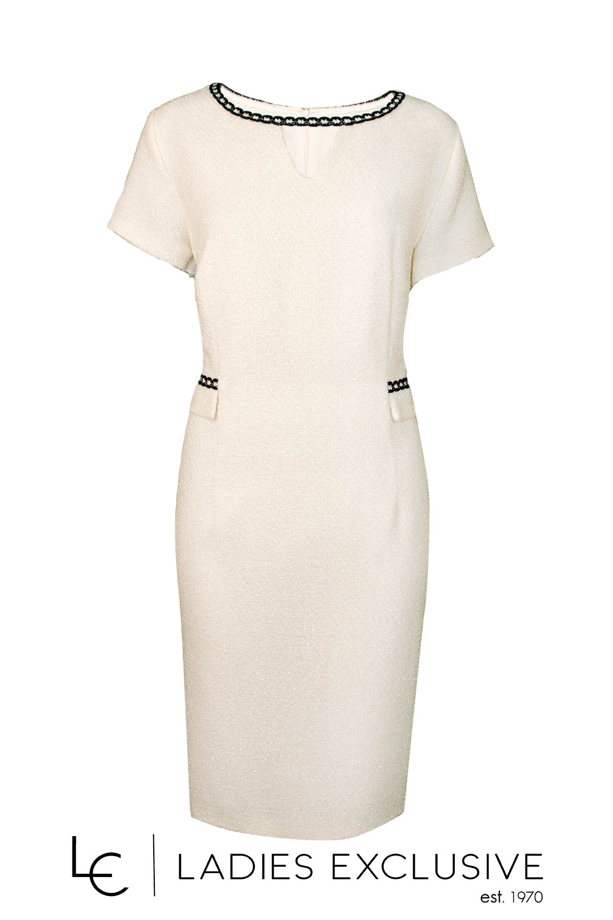 ESTEL Φόρεμα εκρού κοντομάνικο μπουκλέ με μαύρη τρέσα λεπτομέρεια. ΔΙΝΕΤΑΙ ΜΟΝΟ ΣΑΝ ΣΕΤ με το σακάκι με κωδικό 08552-00.24.