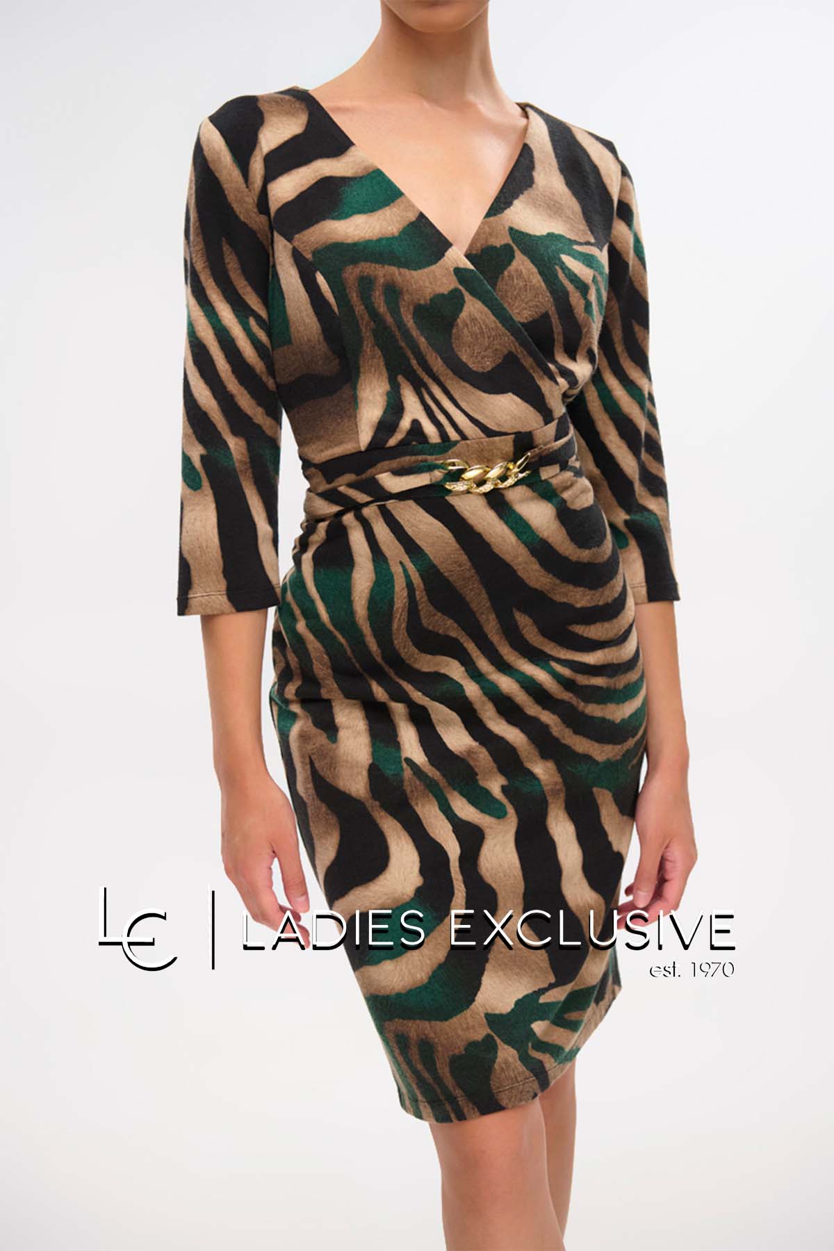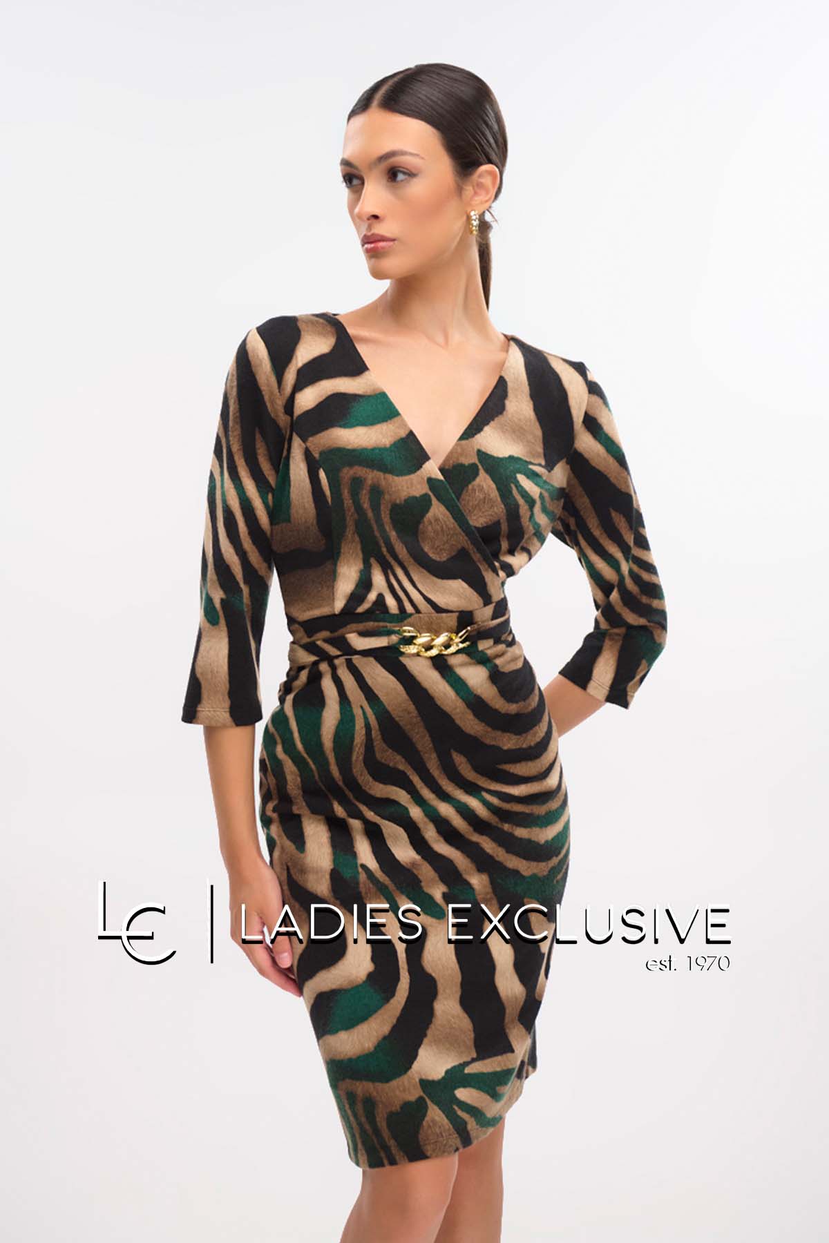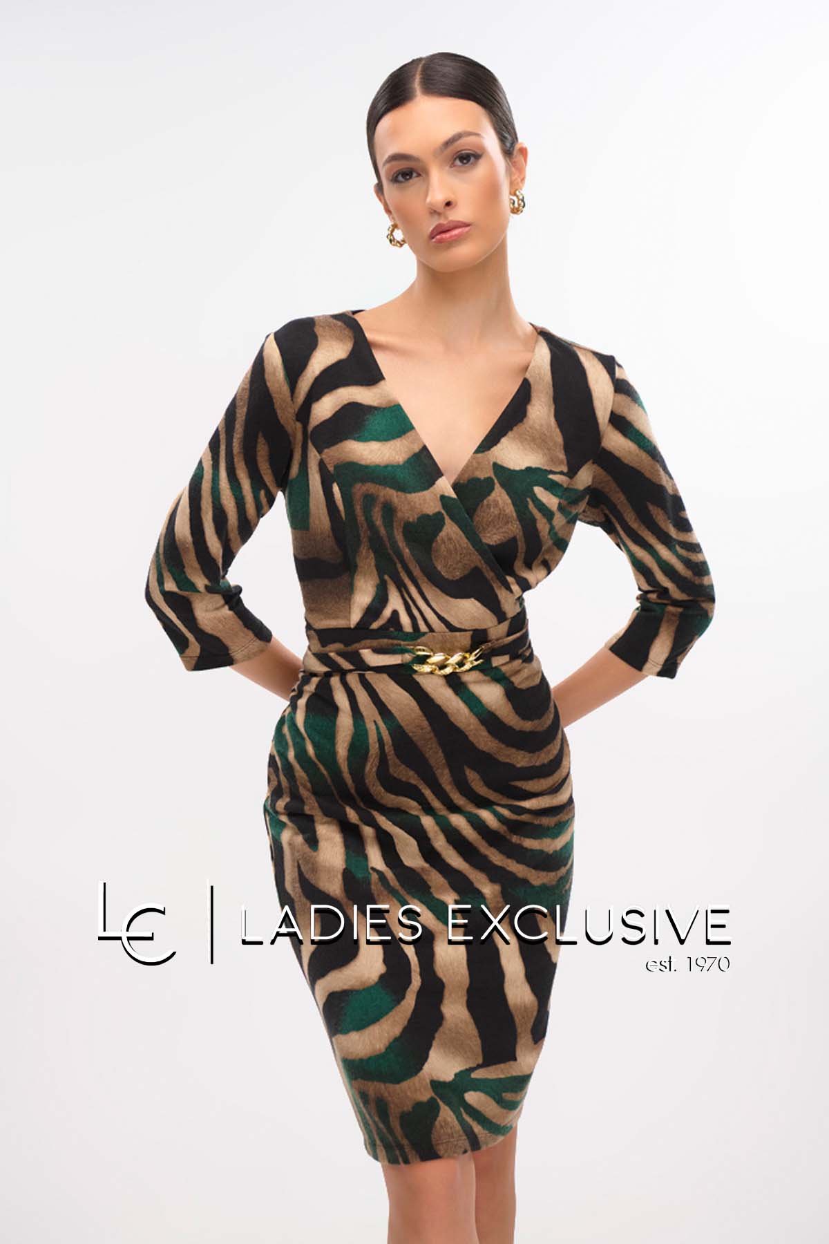 FIBES Φόρεμα σε πράσινες και γήινες αποχρώσεις σε ίσια γραμμή κρουαζέ, με μεταλλική λεπτομέρεια στη μέση.