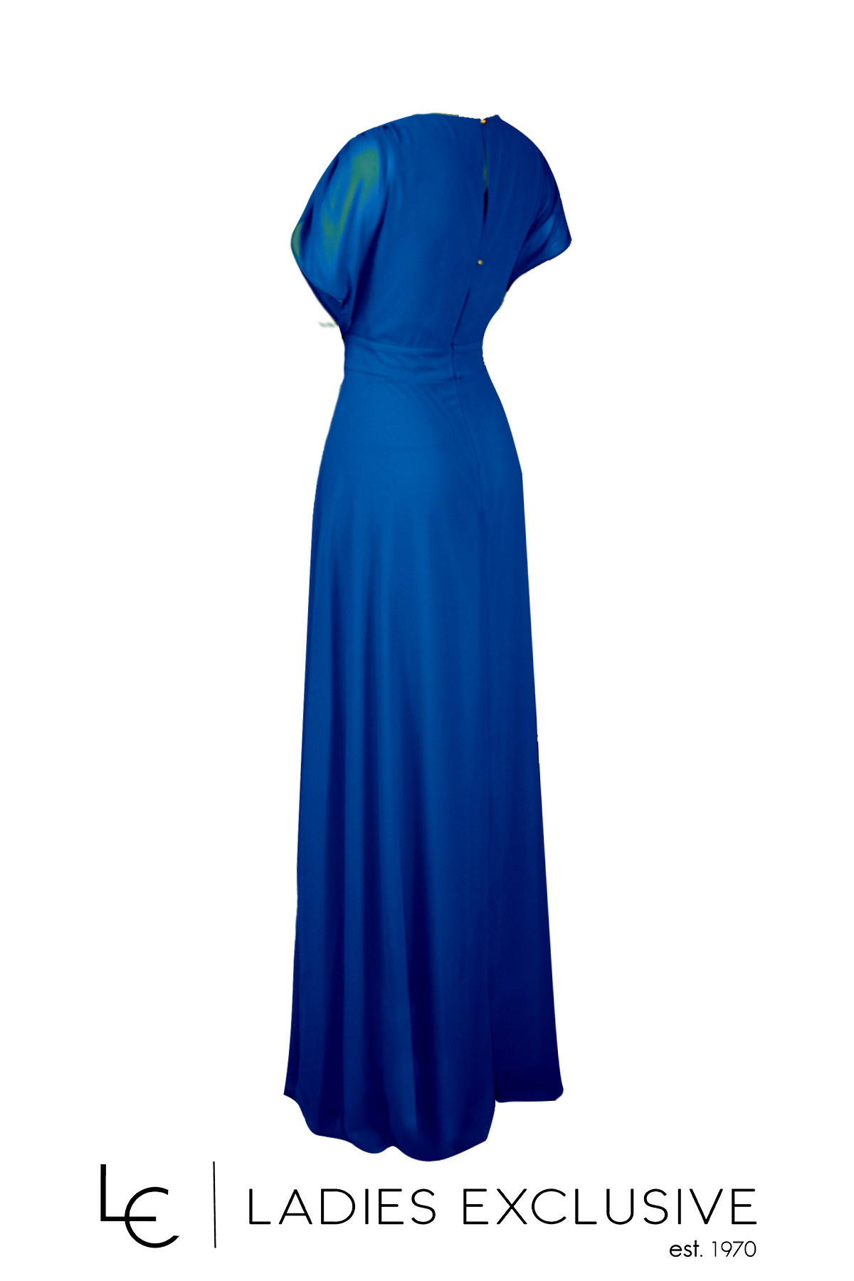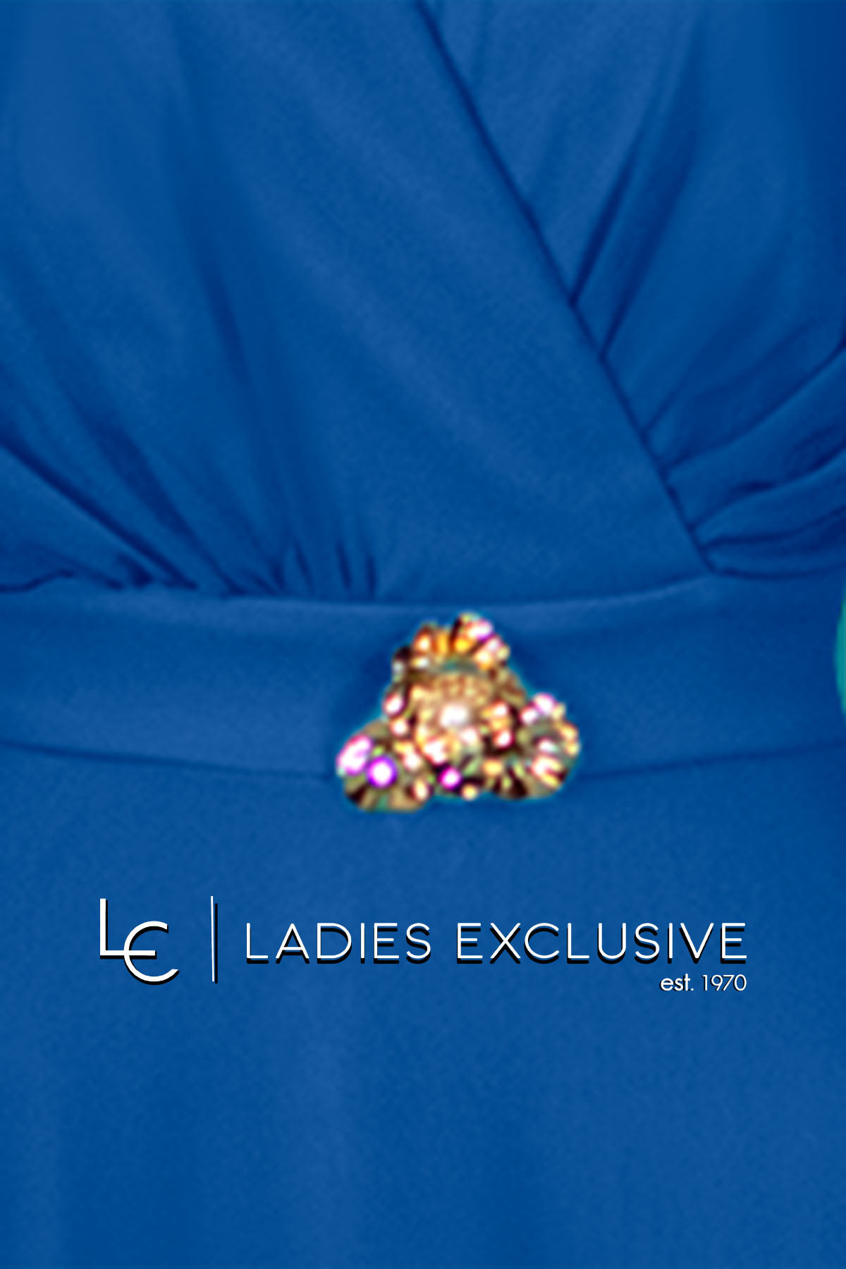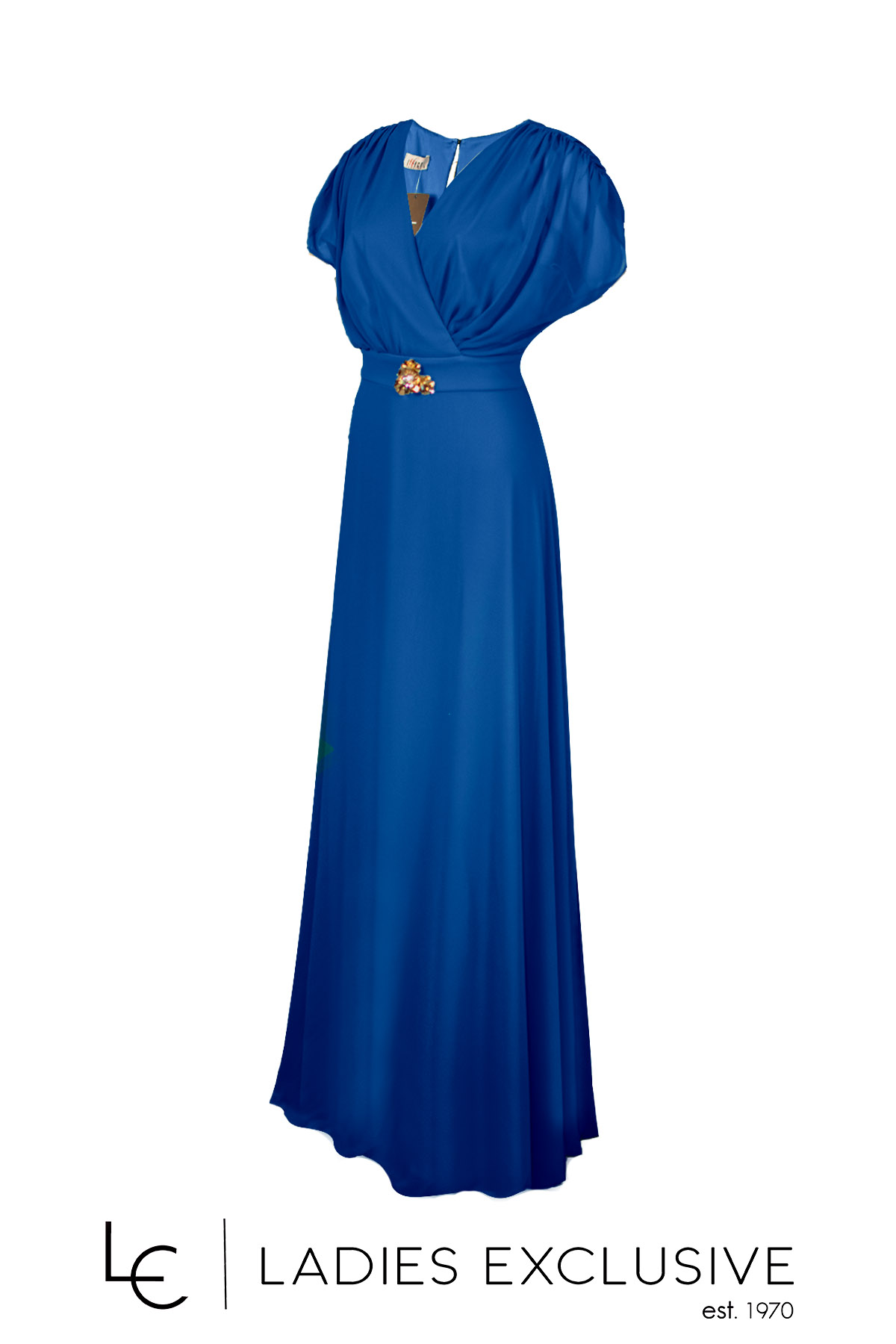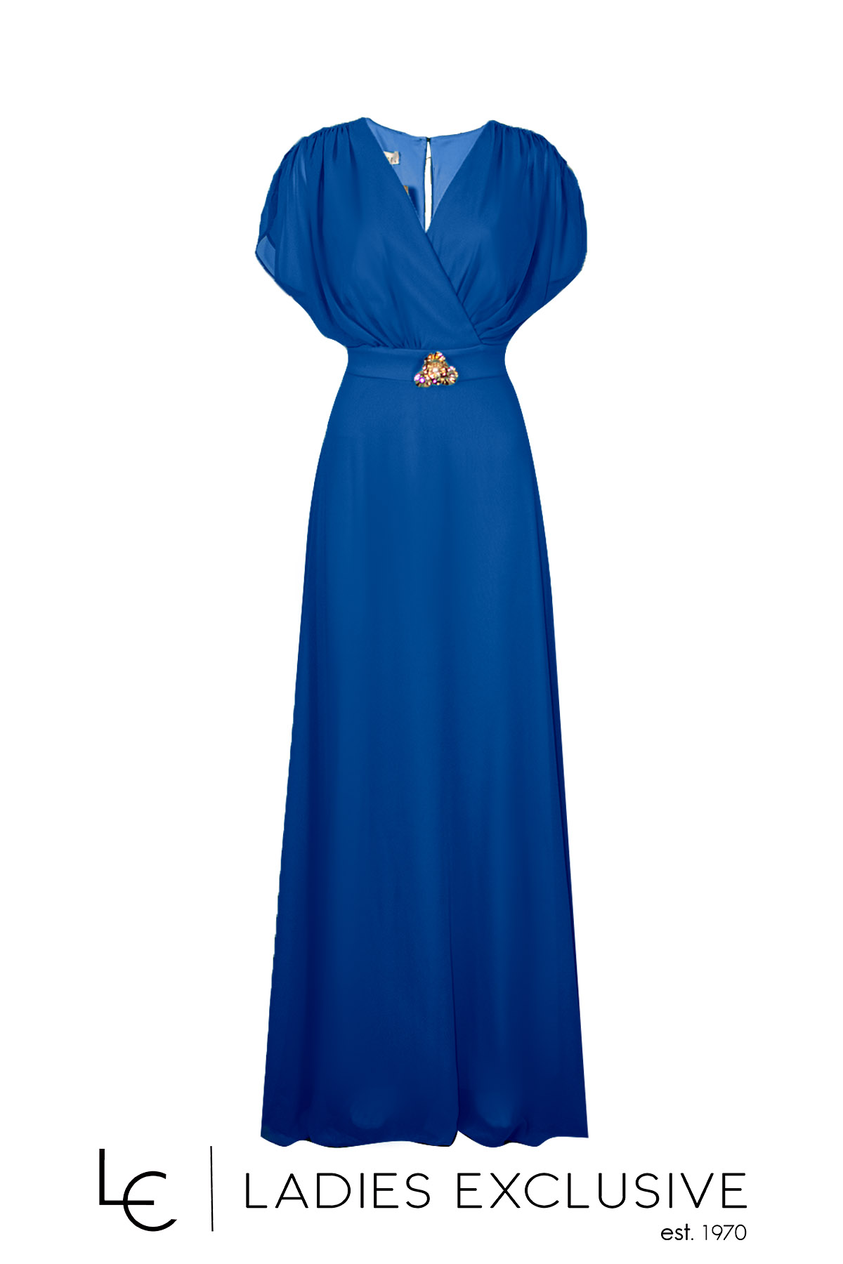 EFFECT Φόρεμα μπλε βραδινό κρουαζέ με μουσελίνα μακρύ με διακοσμητική καρφίτσα στη ζώνη.