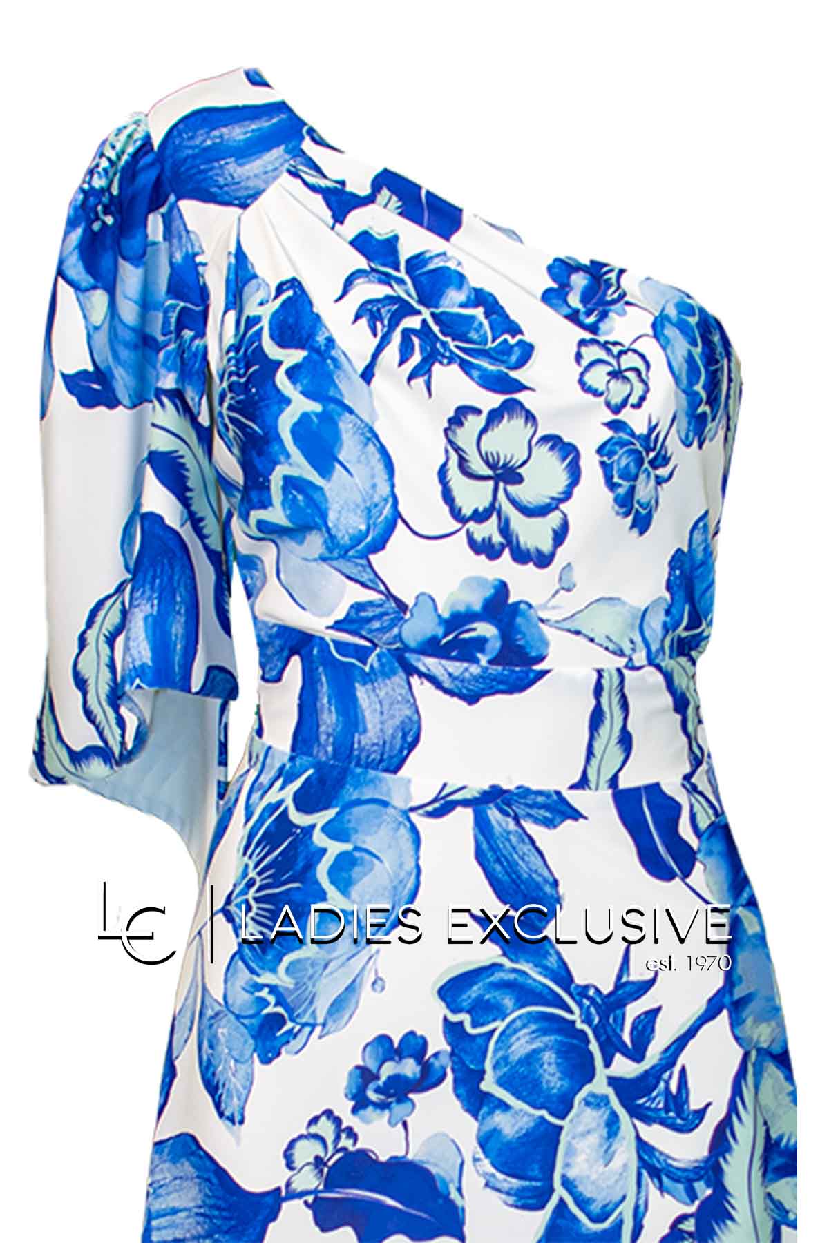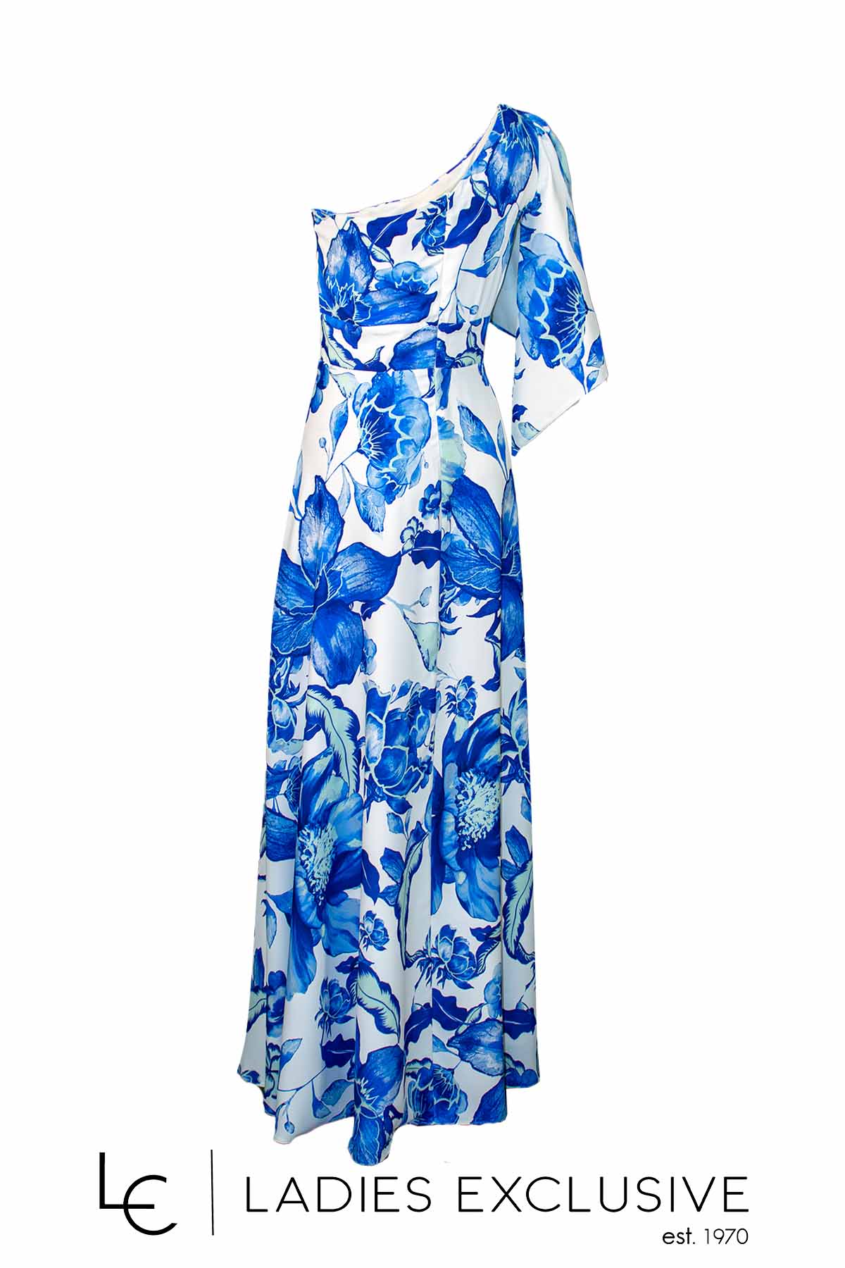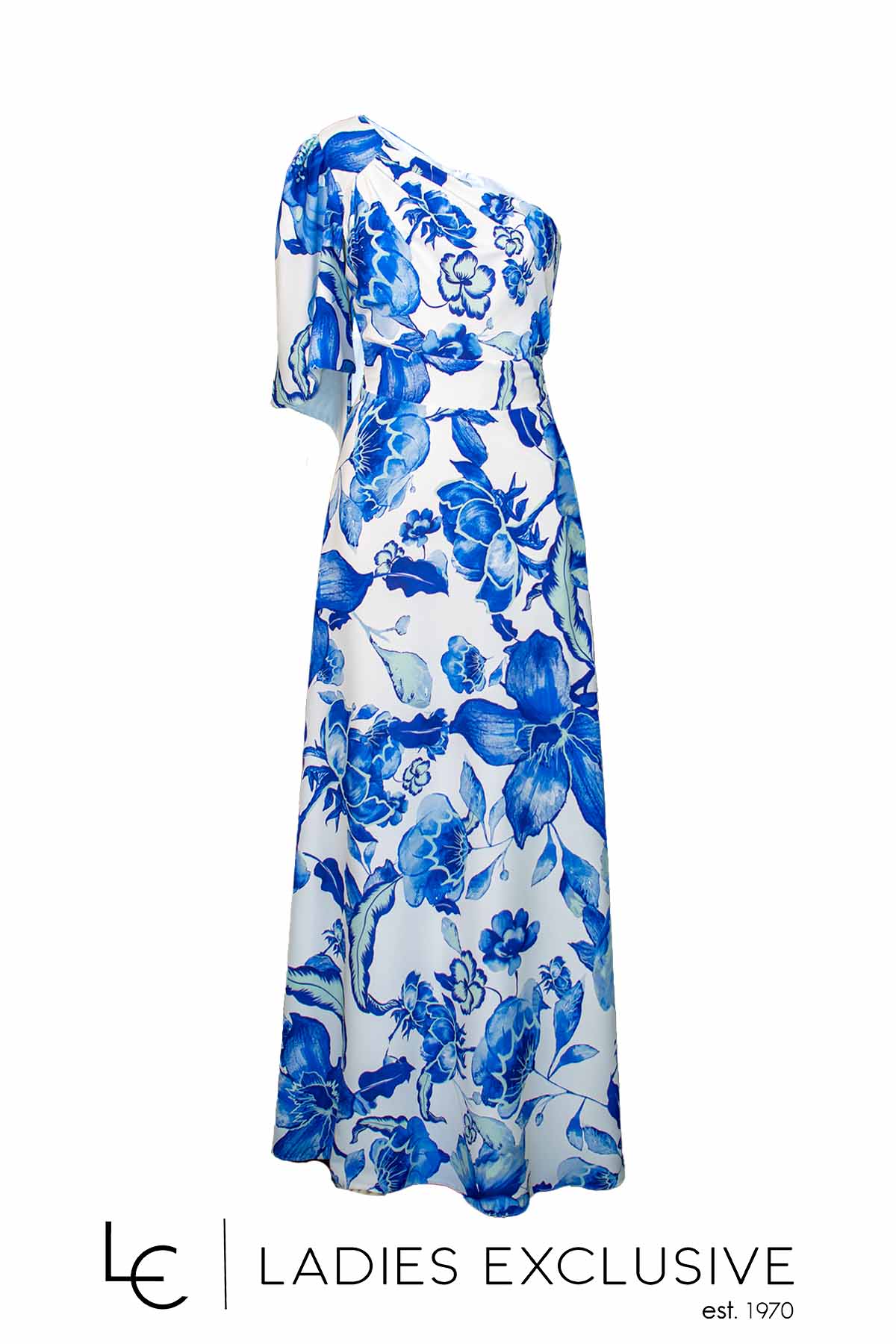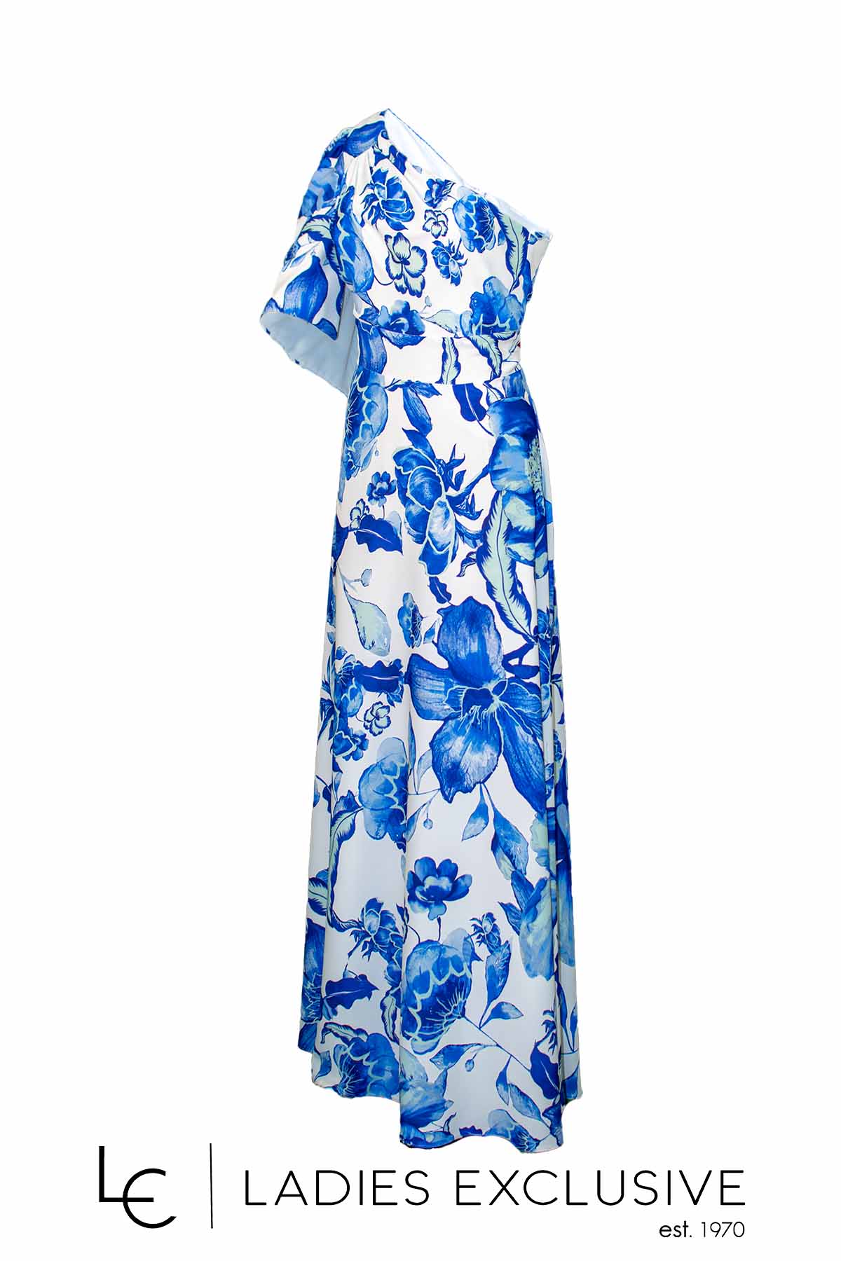 EFFECT Φόρεμα μακρύ μπλε λευκό φλοράλ με έναν ώμο και κλος στο κάτω μέρος.