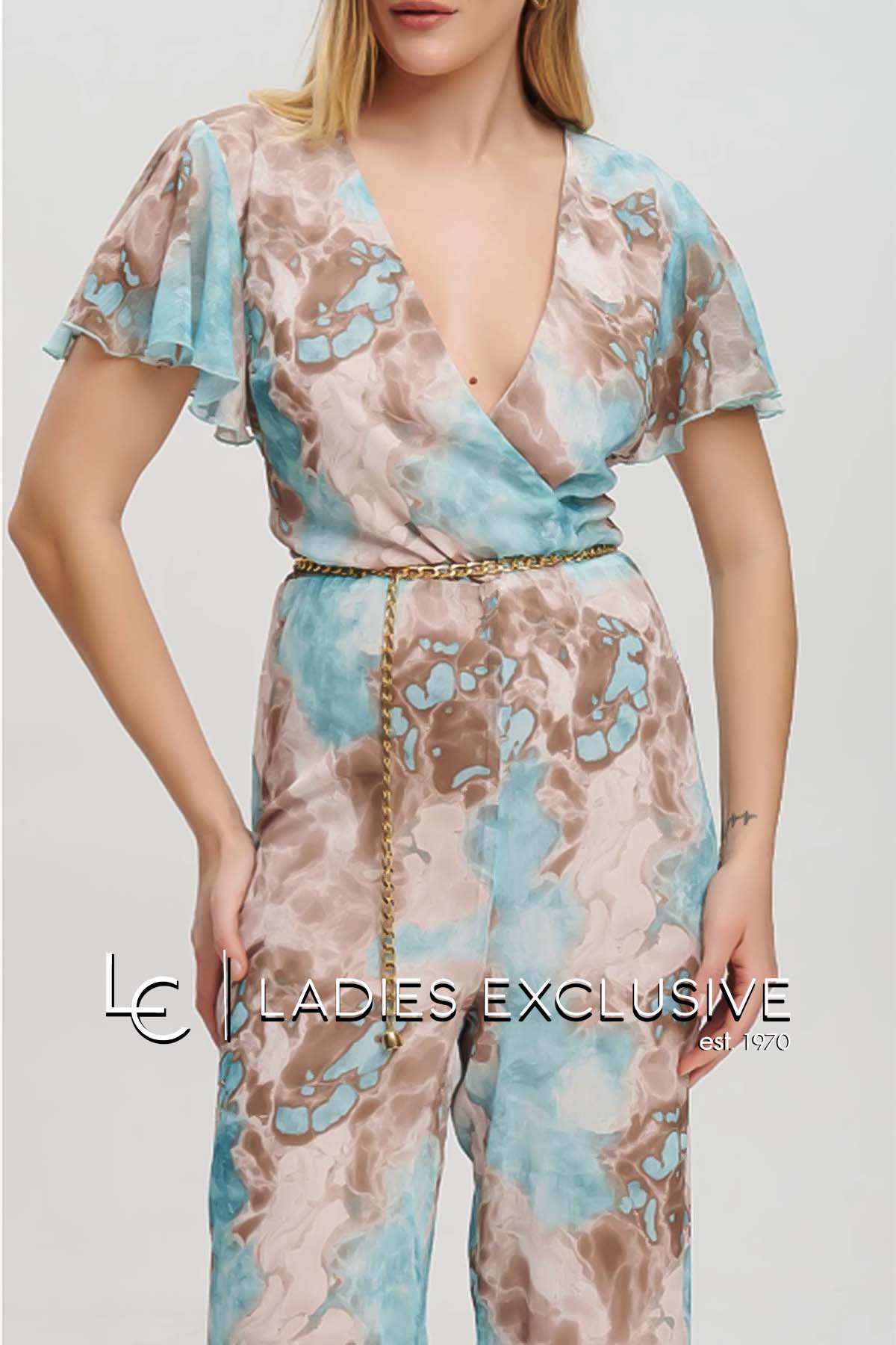 FIBES Φόρμα εμπριμέ ολόσωμη κρουαζέ, με μικρό βολάν στο μανίκι και λάστιχο στη μέση. Διαθέτει ζώνη αλυσίδα.
