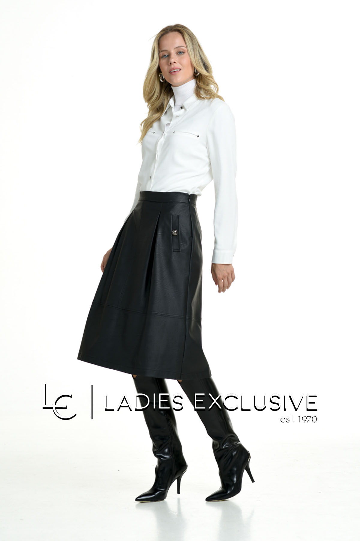 ESTEL Φούστα μαύρη από τεχνόδερμα σε γραμμή A με πιέτες και πλαϊνές τσέπες.