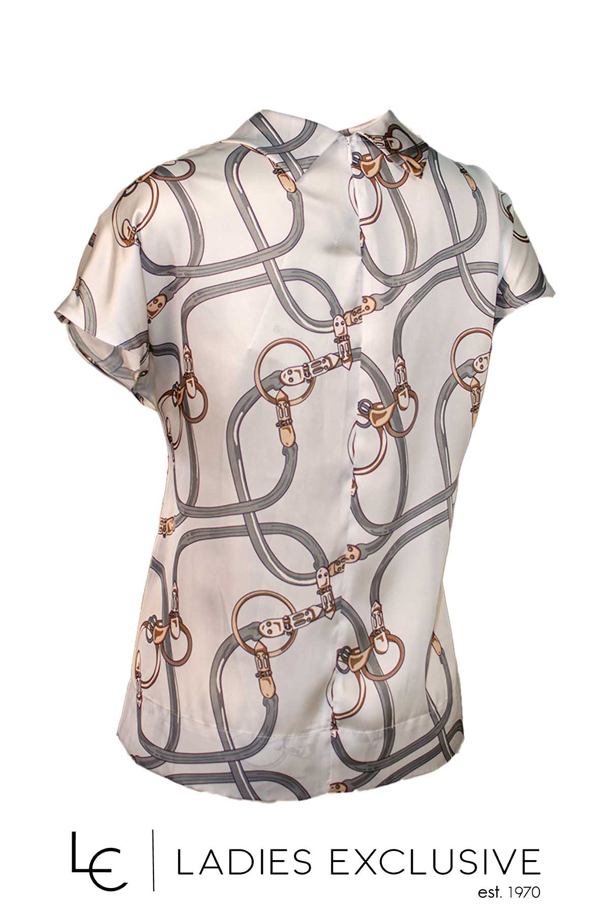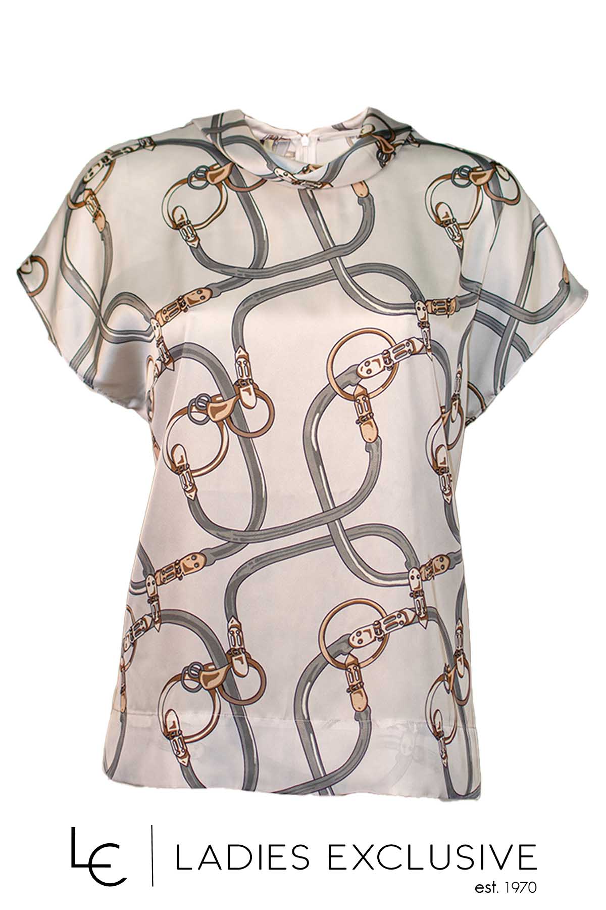 BELLA P. Μπλούζα εκρού κοντομάνικη σατέν με κοφτό μανίκι και γυριστή ψηλή λαιμόκοψη.