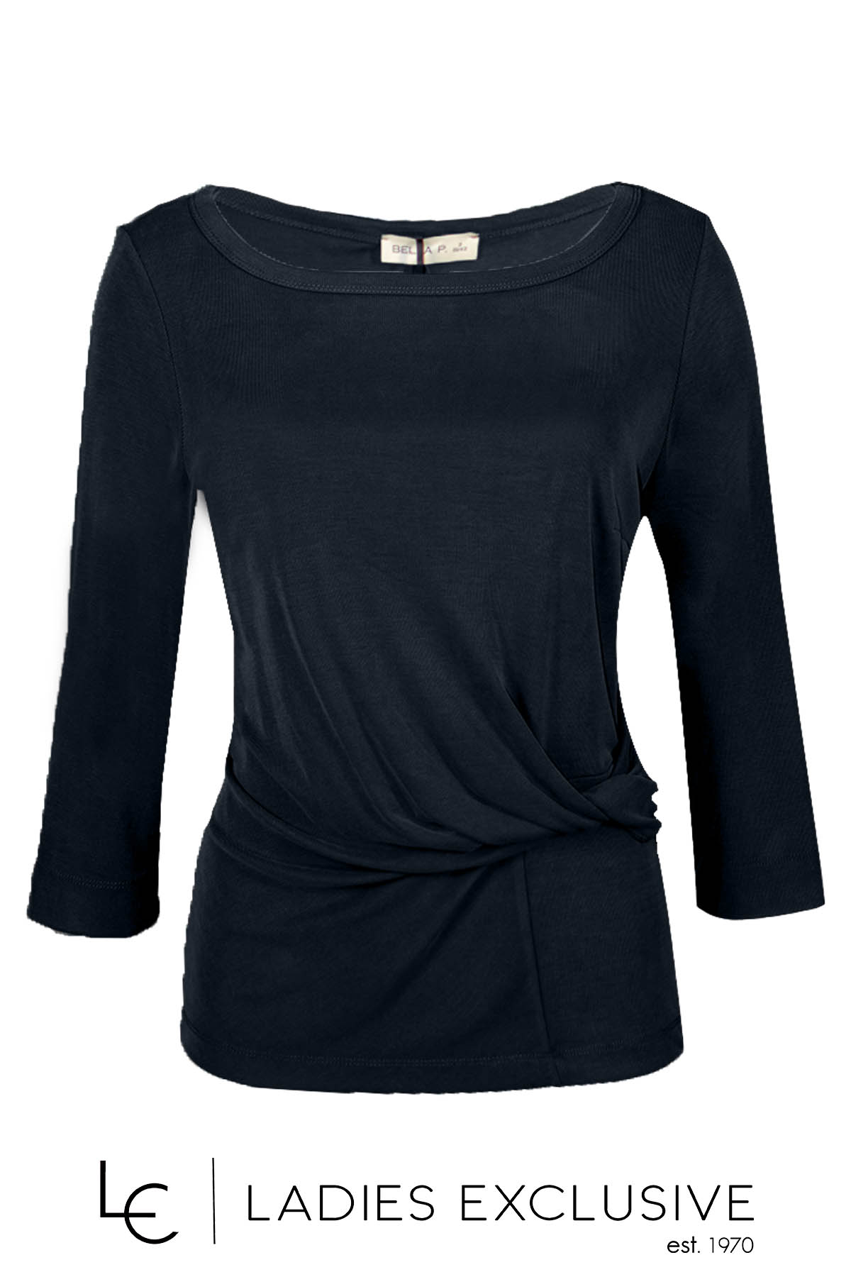 BELLA P. Μπλούζα μαύρη με ιδιαίτερο ντραπέ σχέδιο, μανίκι 3/4 και μεγάλη ανοιχτή λαιμόκοψη.
