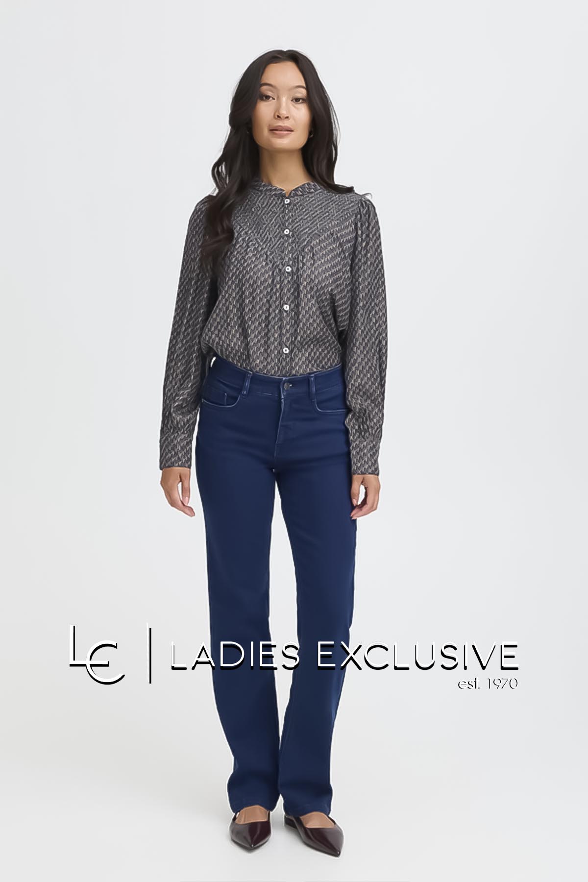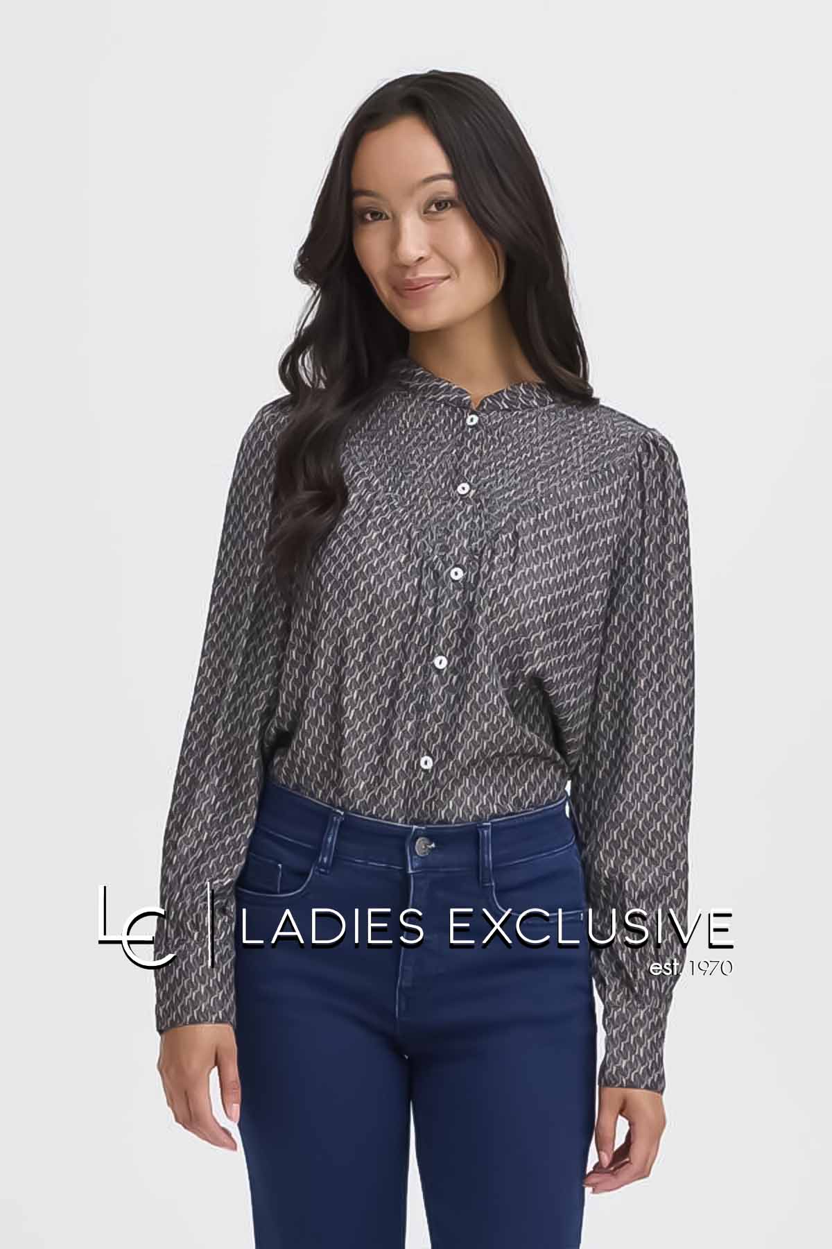 FRANSA Πουκάμισο μπλε με μπεζ σχέδια ριχτό χωρίς πέτο, με σούρα στο πάνω μέρος.