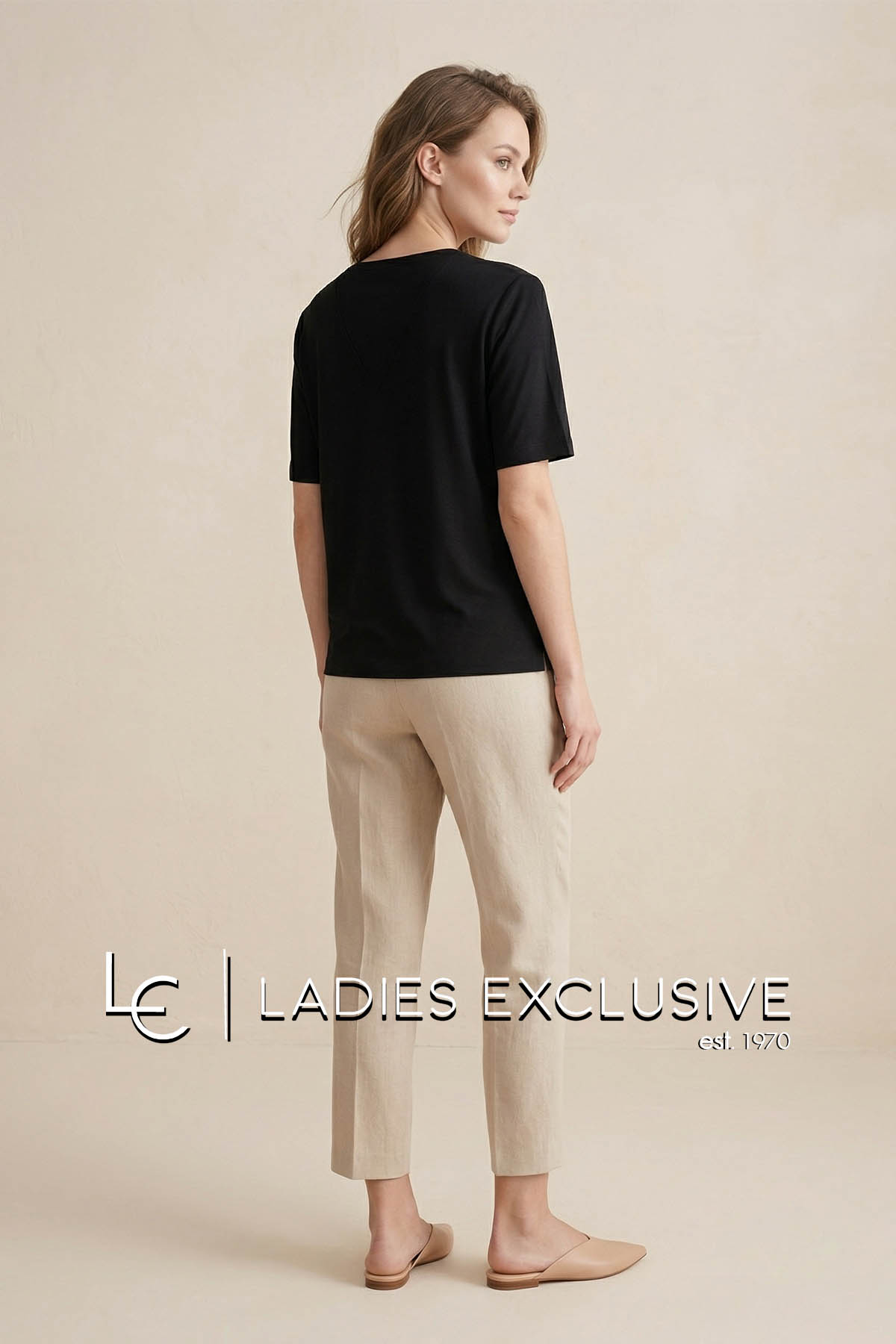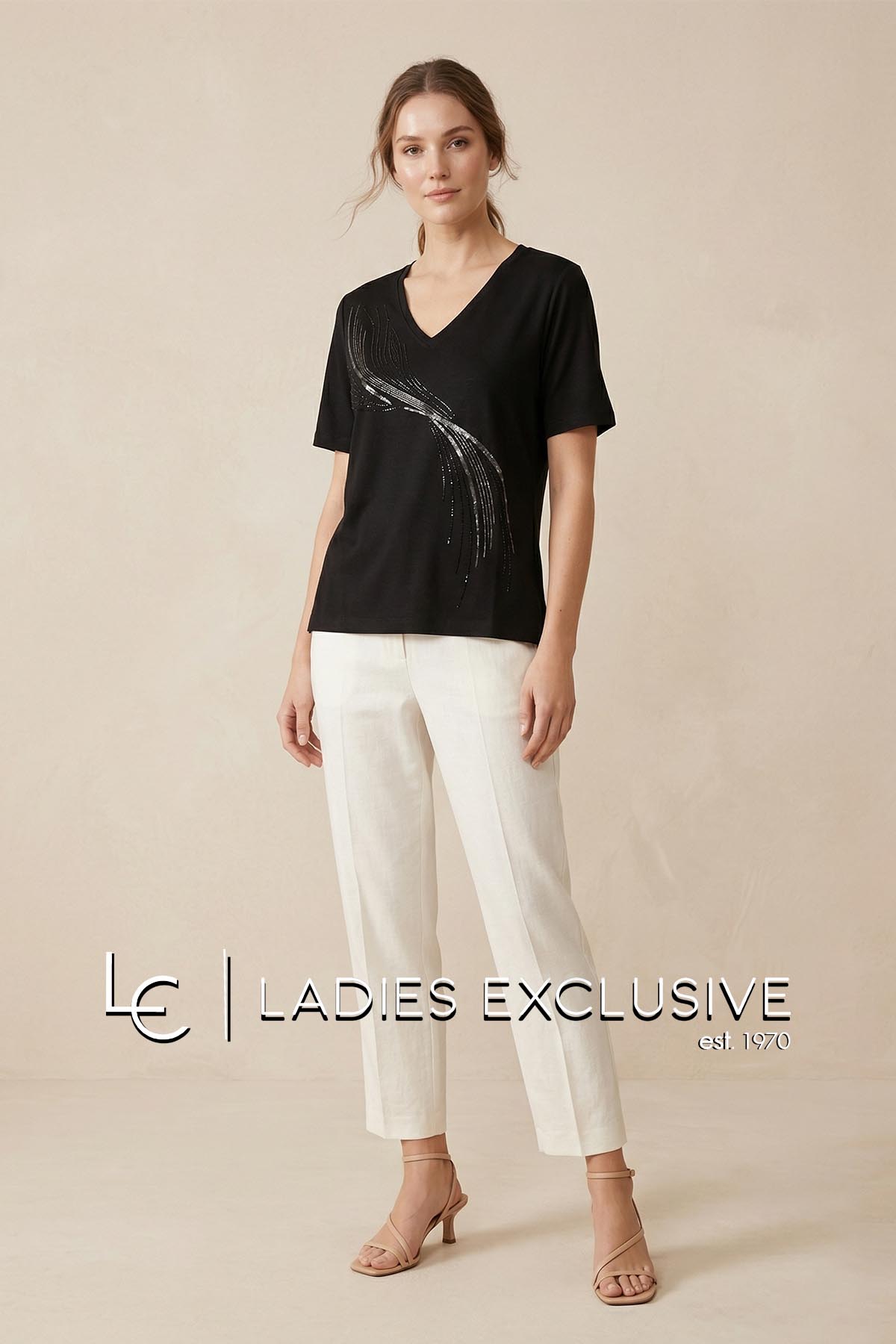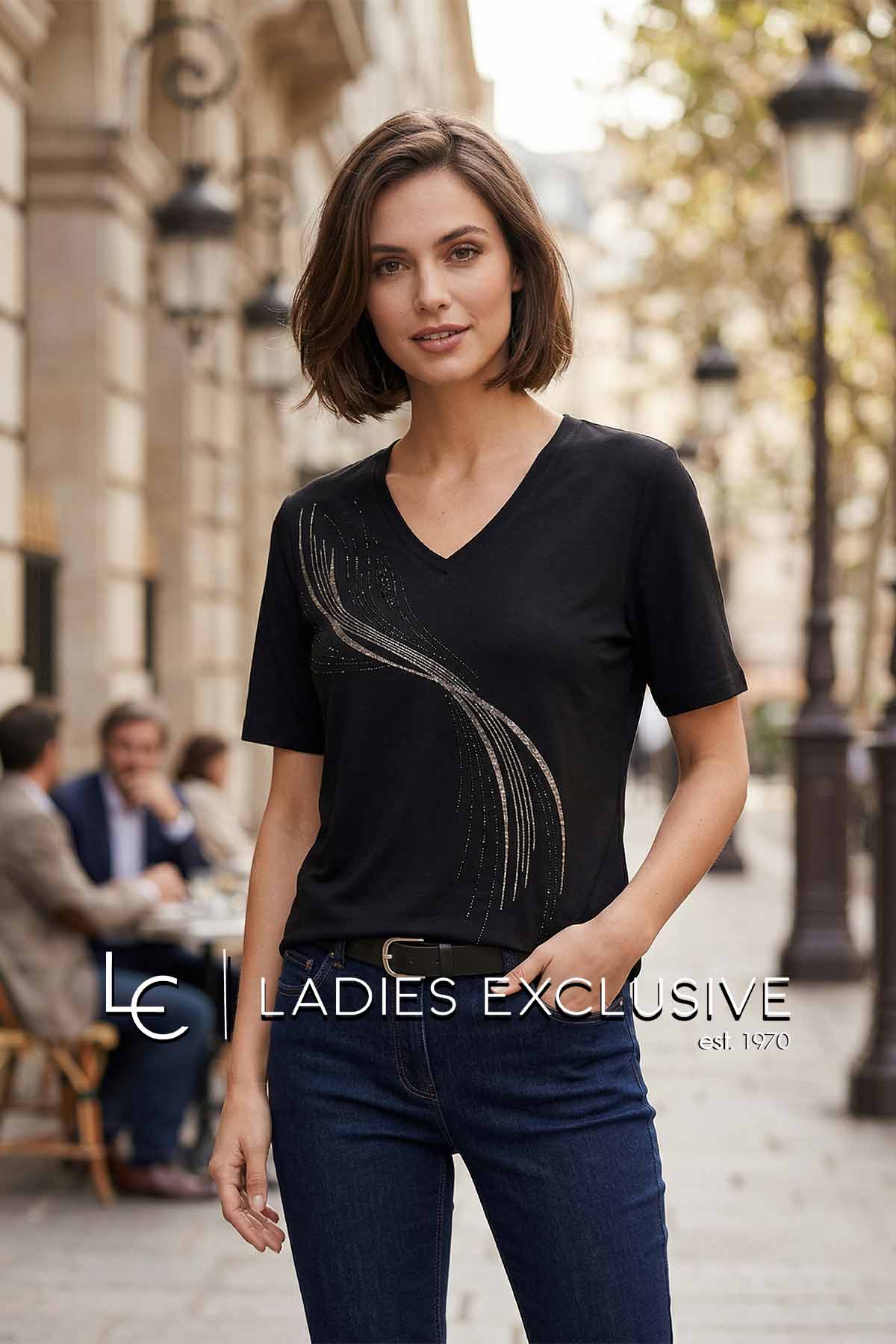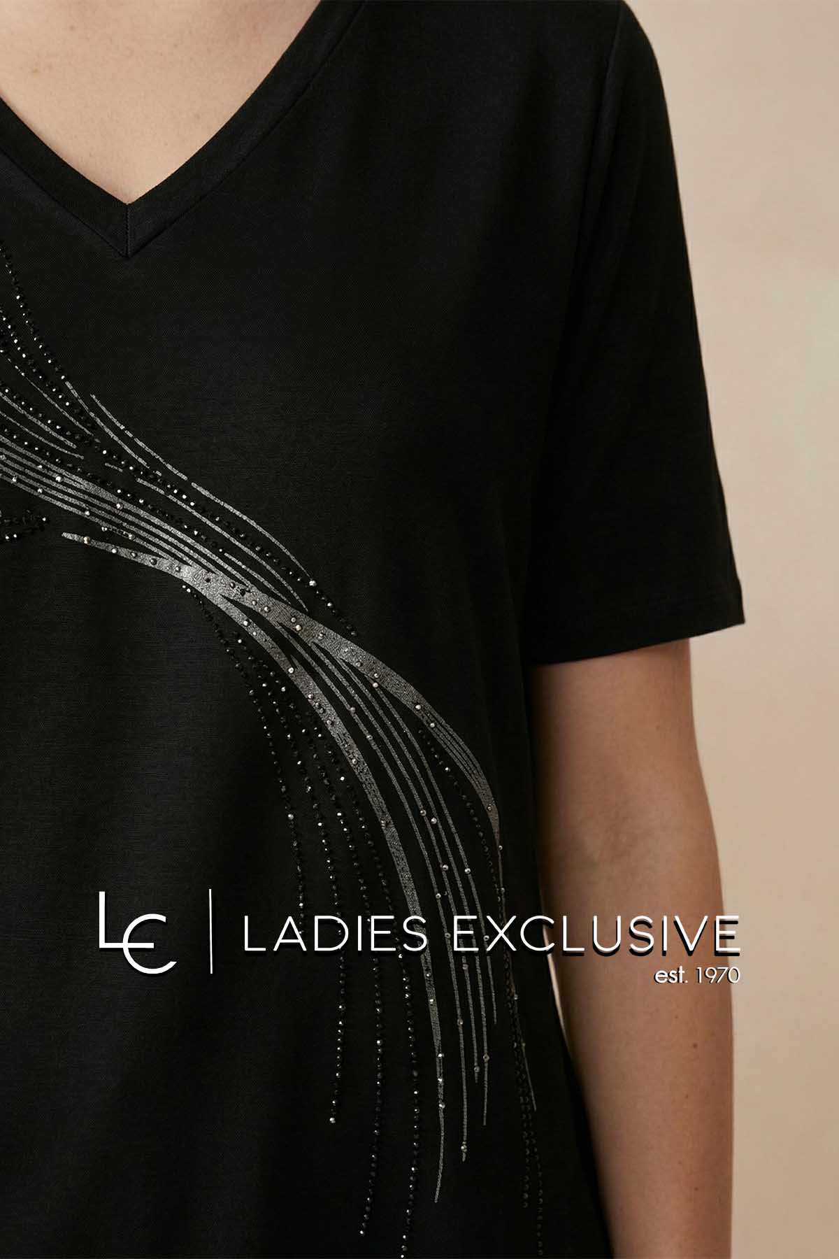 NICOLA Μπλούζα μαύρη κοντομάνικη με άνοιγμα v και στάμπα με στρας.
