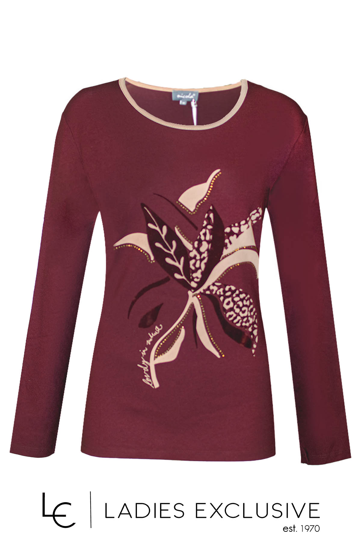 NICOLA Μπλούζα μπορντώ με στάμπα βελουτέ λουλούδι και διακριτικά στρας.