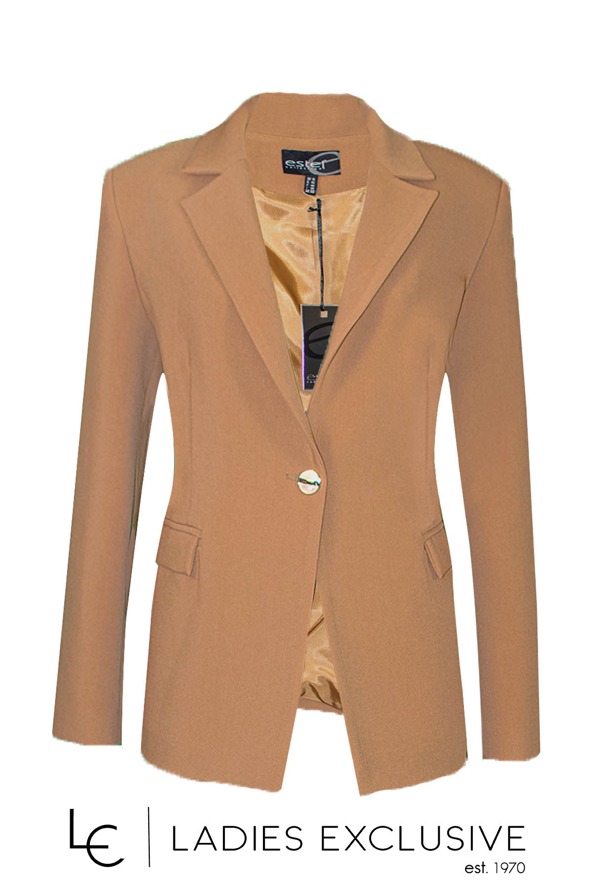ESTEL Σακάκι καμηλό με πέτο γιακά με μονό κουμπί. Γίνεται σετ με το παντελόνι με κωδικό 08505-00.19.