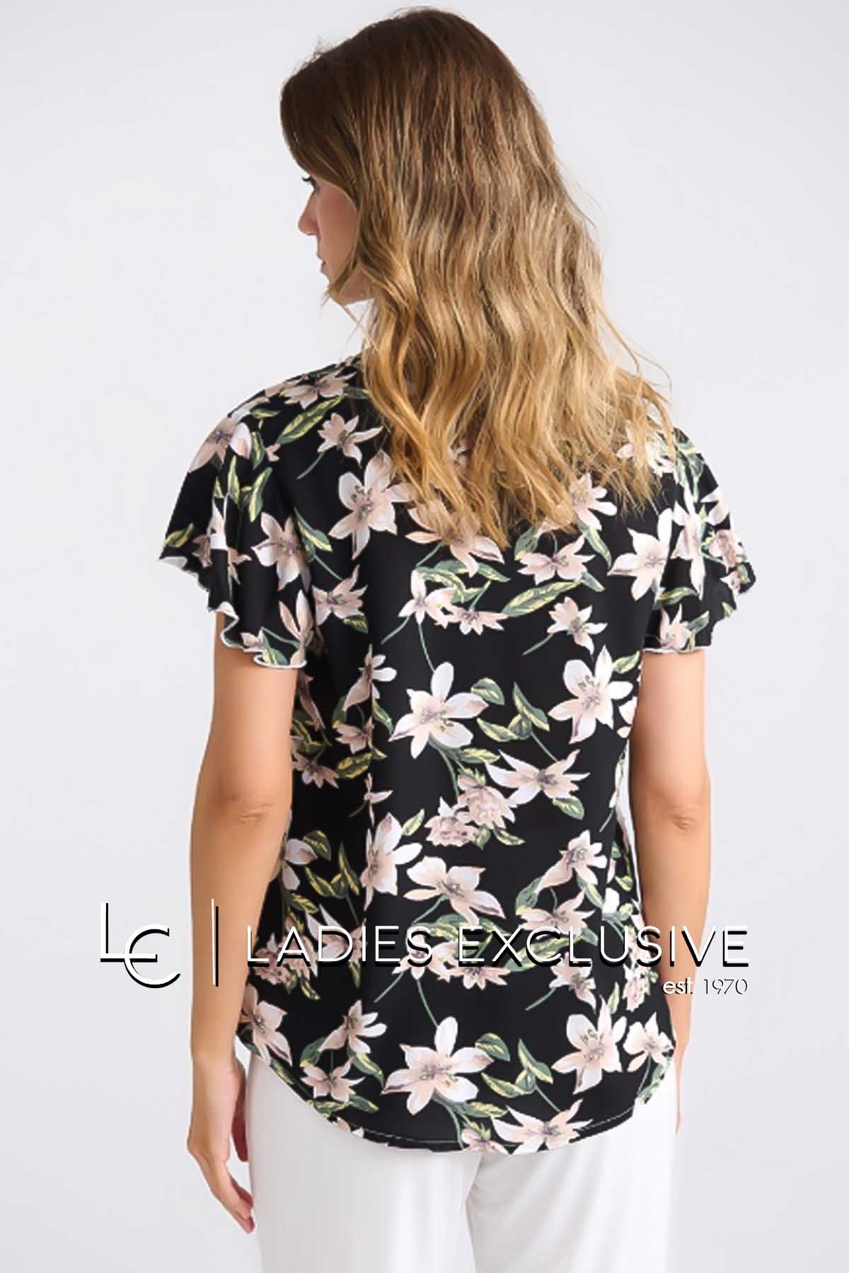 FIBES Μπλούζα μαύρη φλοράλ κοντομάνικη με μανίκι βολάν από βισκόζη.