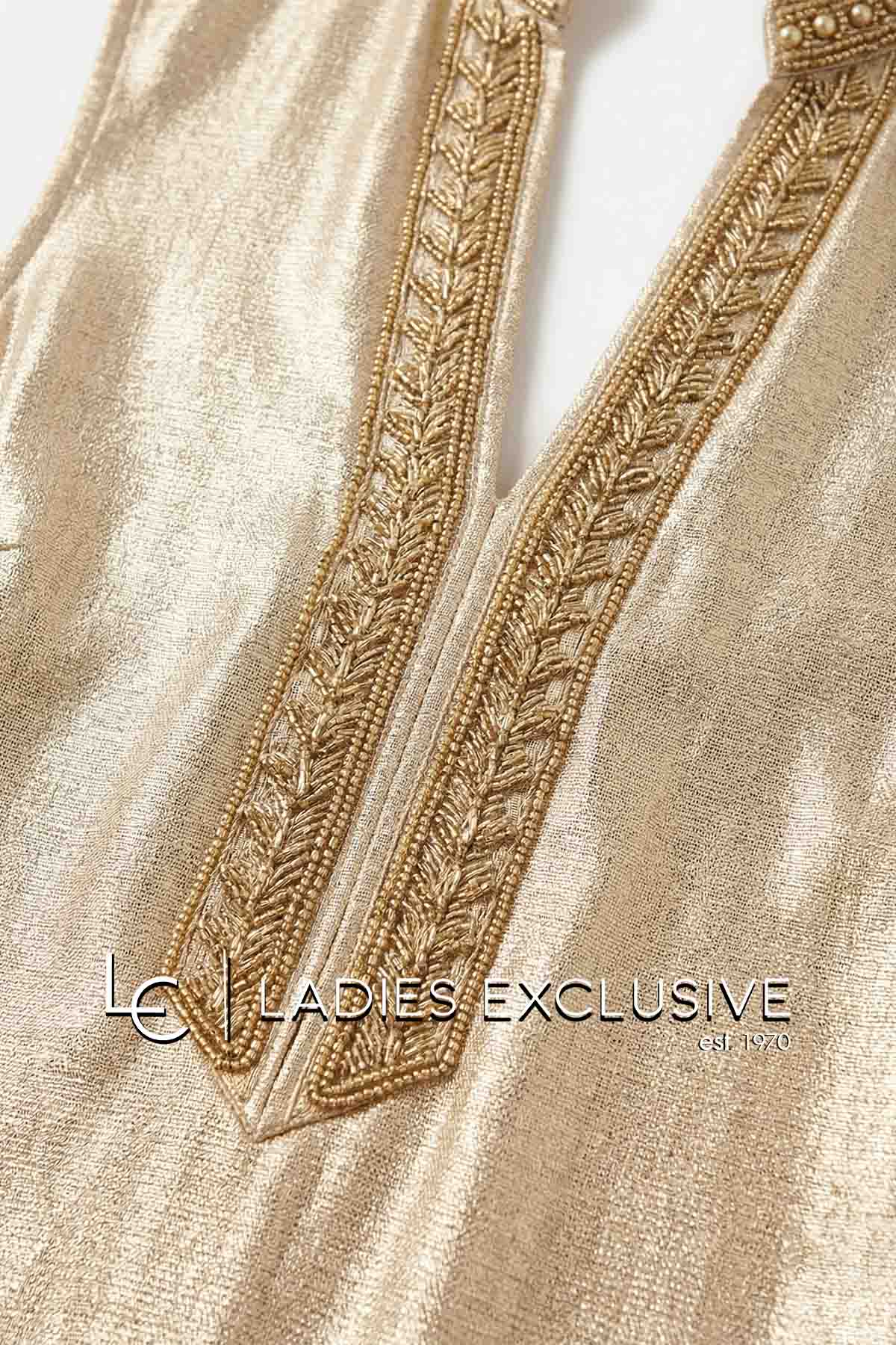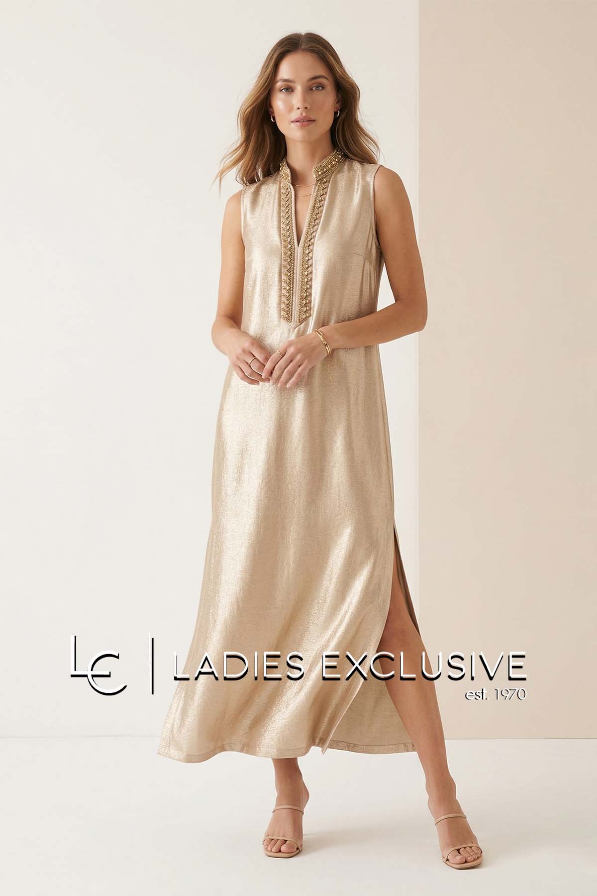 BELLA P. Φόρεμα nude αμάνικο μακρύ με διακοσμητικές πέτρες στο πάνω μέρος και γραμμή A με ανοίγματα στο κάτω.