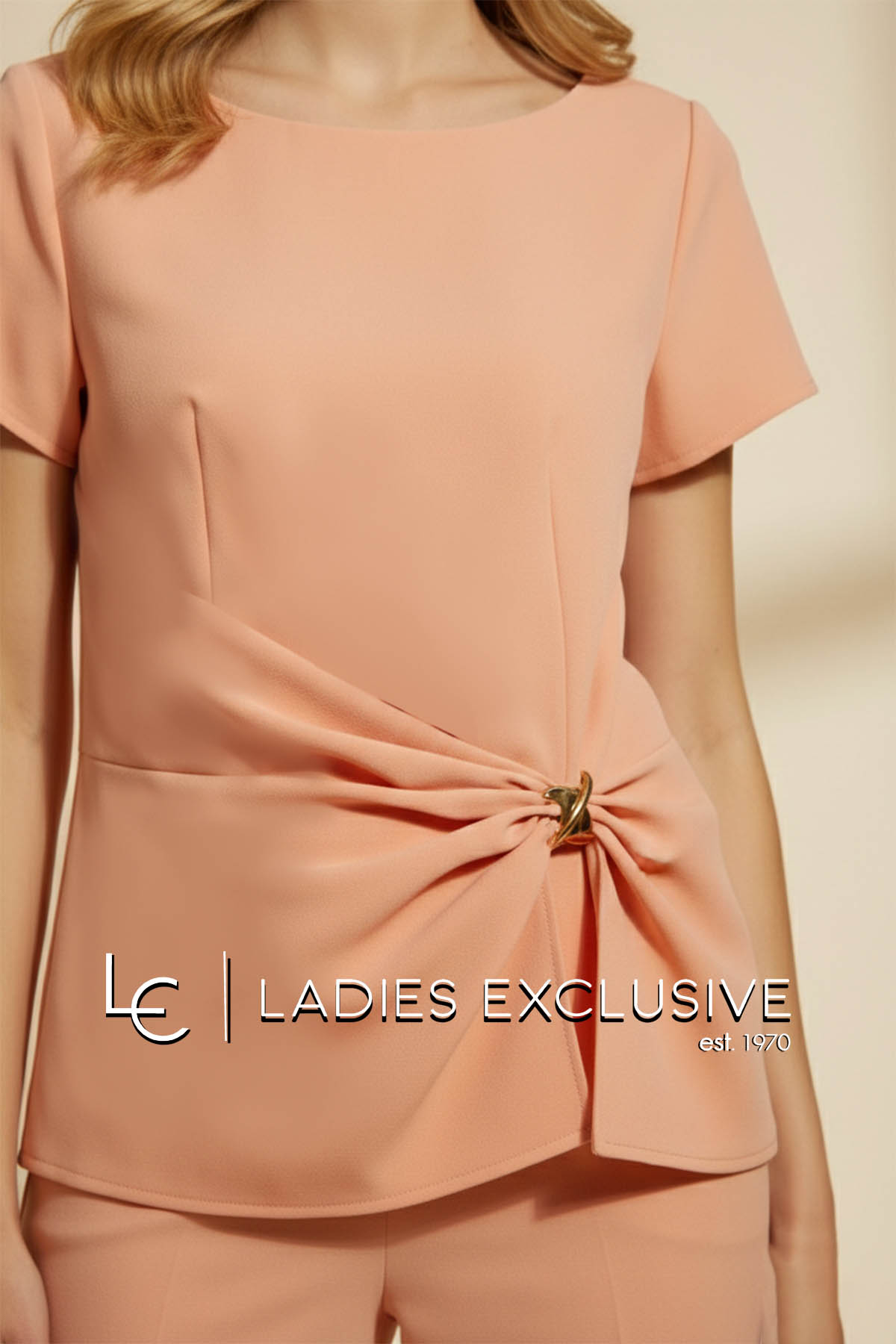 BELLA P. Μπλούζα peach κοντομάνικη κρεπ, με ιδιαίτερο ντραπέ σχέδιο. Γίνεται σετ με την παντελόνα με κωδικό 21261.03105.0121.57.