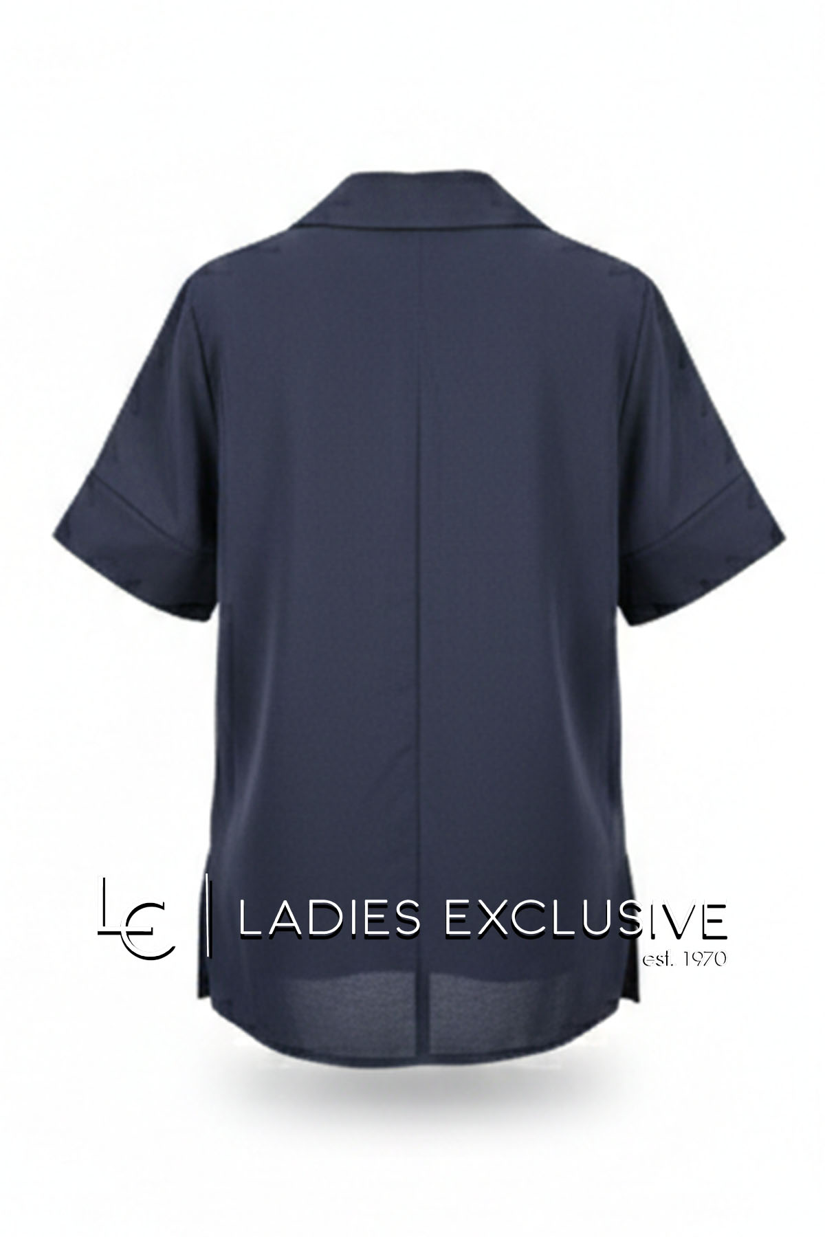 BELLA P. Μπλούζα μπλε κοντομάνικη με πέτο γιακά σε άνετη γραμμή, που κλείνει μπροστά με ιδιαίτερο κουμπί και έχει ανοίγματα στο πλάι.
