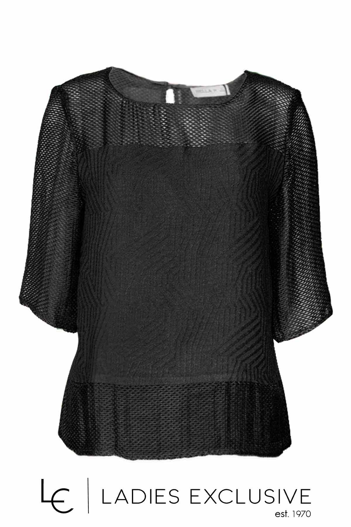 BELLA P. Μπλούζα μαύρη με διαφάνειες, τρυπητή στο πάνω μέρος και στα μανίκια και με ανάγλυφα σχέδια στο υπόλοιπο μέρος. Γίνεται σετ με το παντελόνι με κωδικό 21252.1463.03121.01.