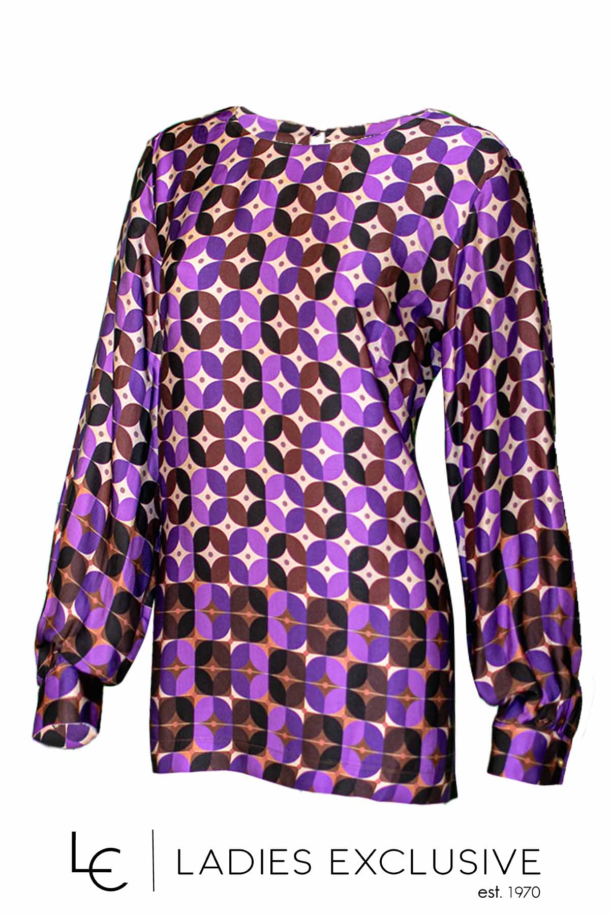 BELLA P. Μπλούζα εμπριμέ σε μωβ αποχρώσεις ριχτή, με φαρδύ μανίκι με μανσέτε και κουμπί και ανοίγματα στο πλάι.