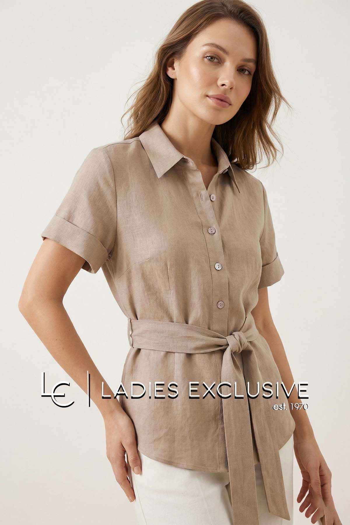 BELLA P. Πουκάμισο μπεζ κοντομάνικο λινό με ζώνη. Γίνεται σετ με το παντελόνι με κωδικό 21261.03135.1704.09.