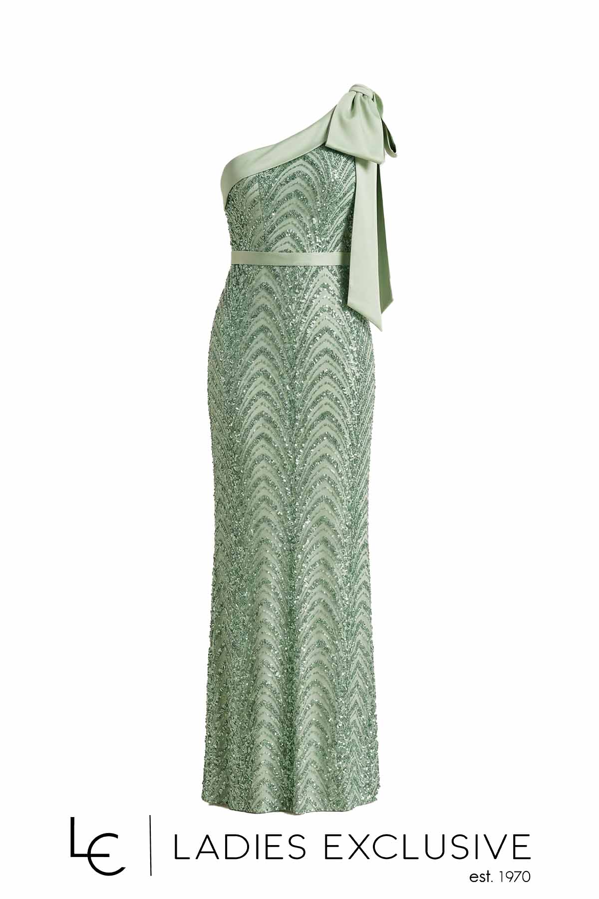 EFFECT Φόρεμα φυστικί βραδινό μακρύ, κεντημένο με παγιέτες και σατέν λεπτομέρειες στο πάνω μέρος και στη μέση. Αφήνει ακάλυπτο τον έναν ώμο και έχει επιπλέον σατέν ύφασμα για τοποθέτηση τιράντας.