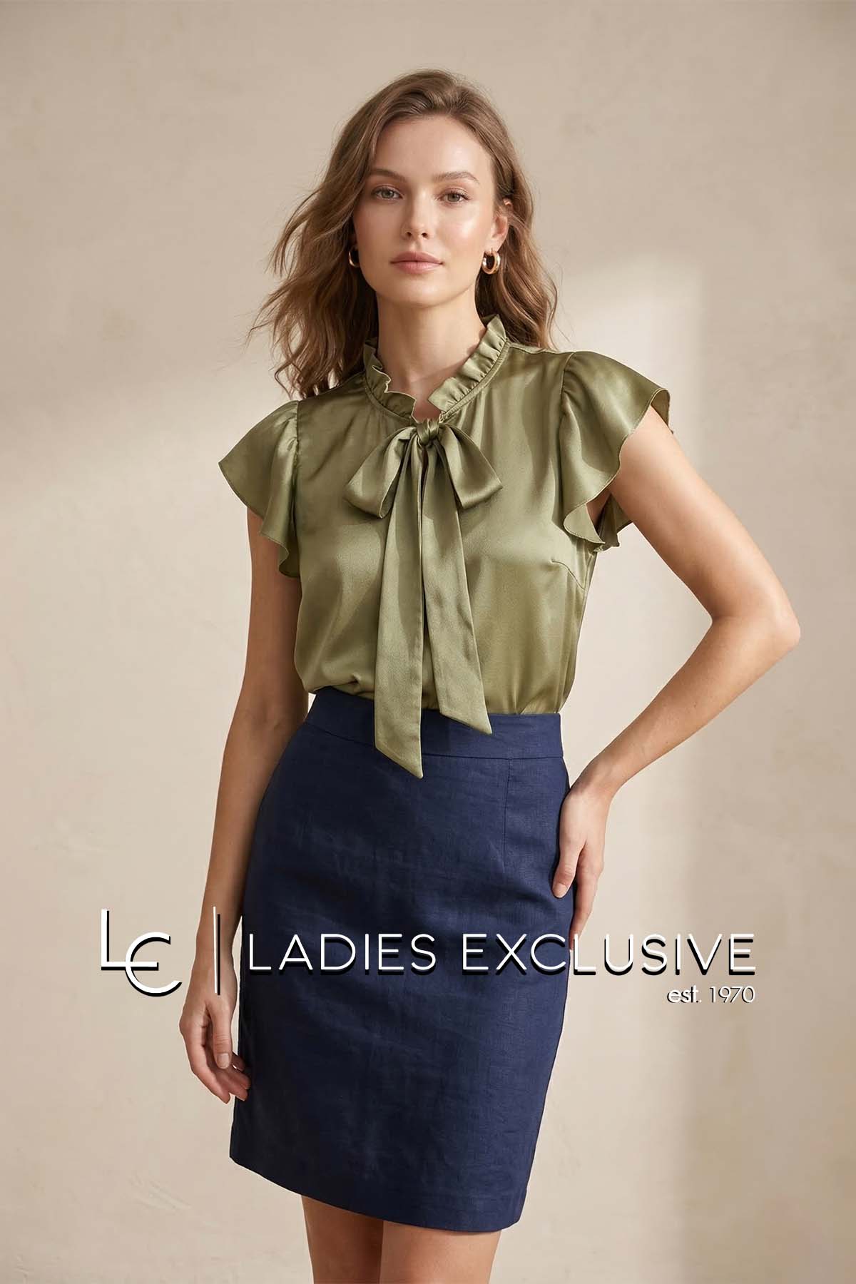 ESTEL Μπλούζα λαδί σατέν με κοφτό μανίκι και δέσιμο στο λαιμό.