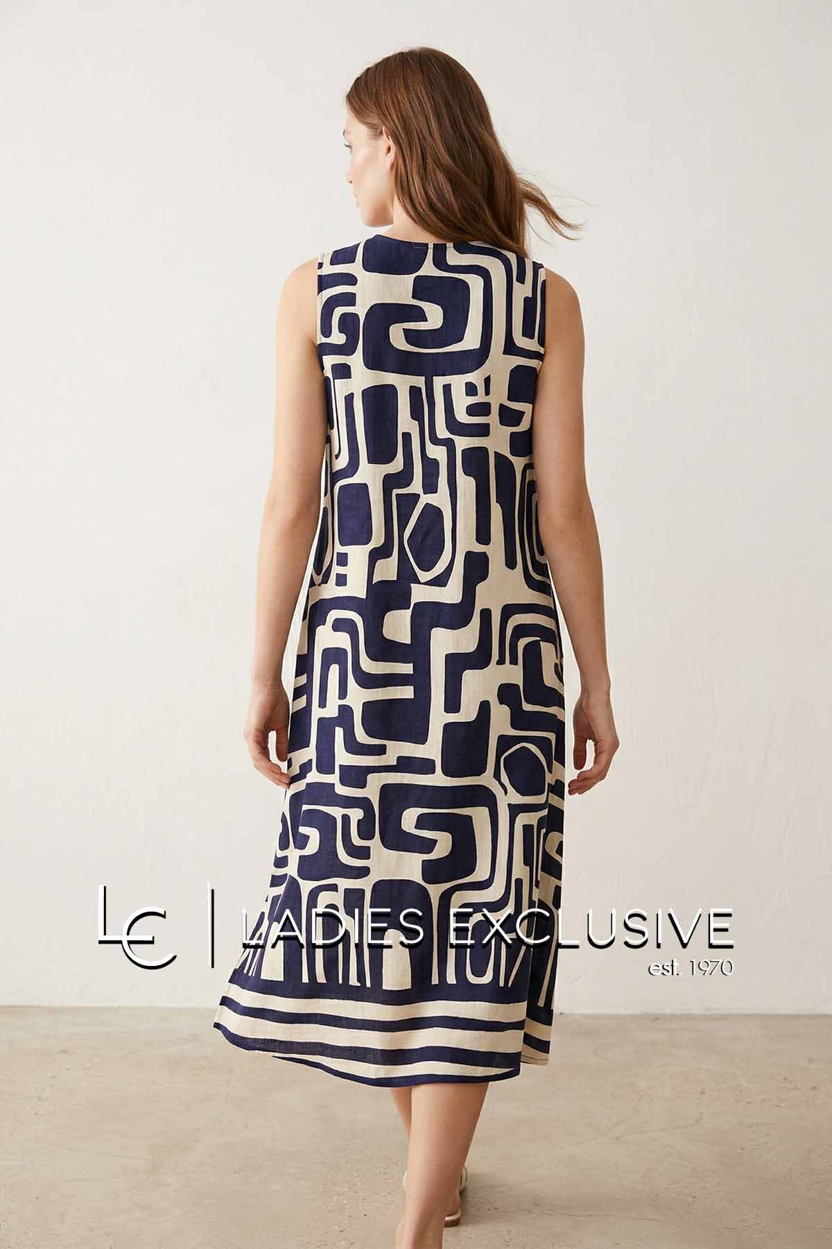 FIBES Φόρεμα μπλε με λευκό αμάνικο σε άνετη γραμμή, με ιδιαίτερη καρφίτσα και μεγάλη πιέτα μπροστά.