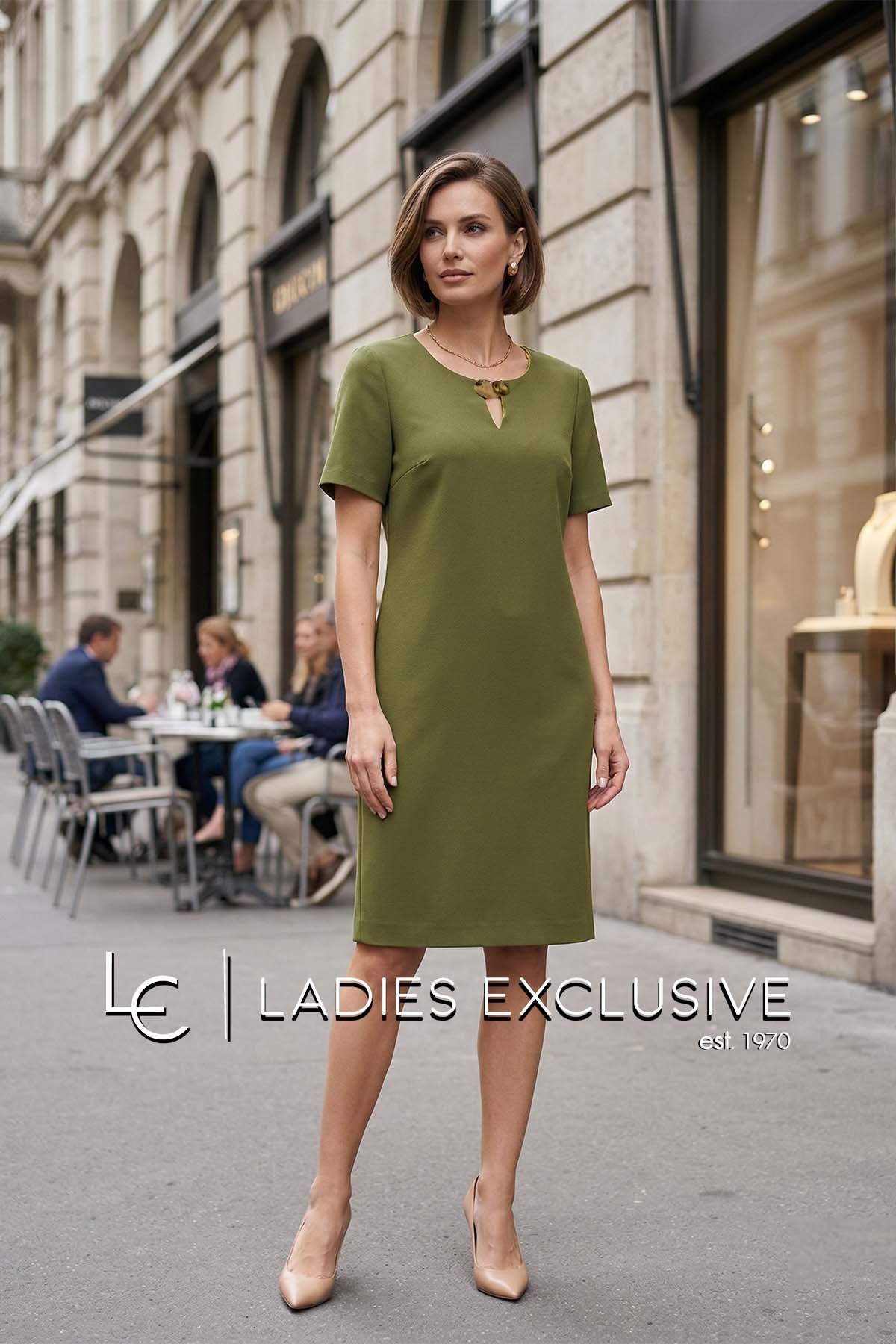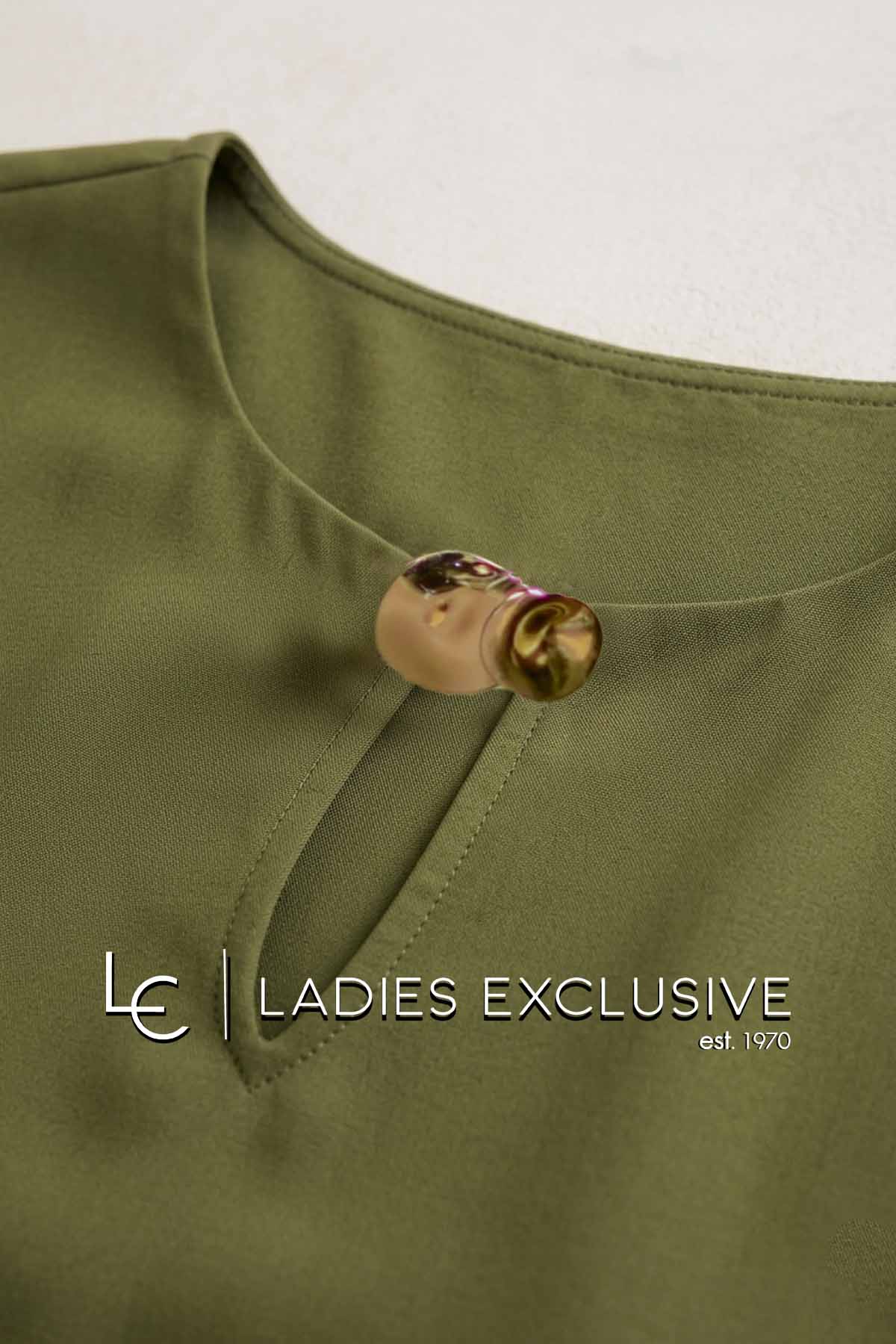 FIBES Φόρεμα χακί κοντομάνικο κρεπ με ιδιαίτερο σχέδιο στη λαιμόκοψη.