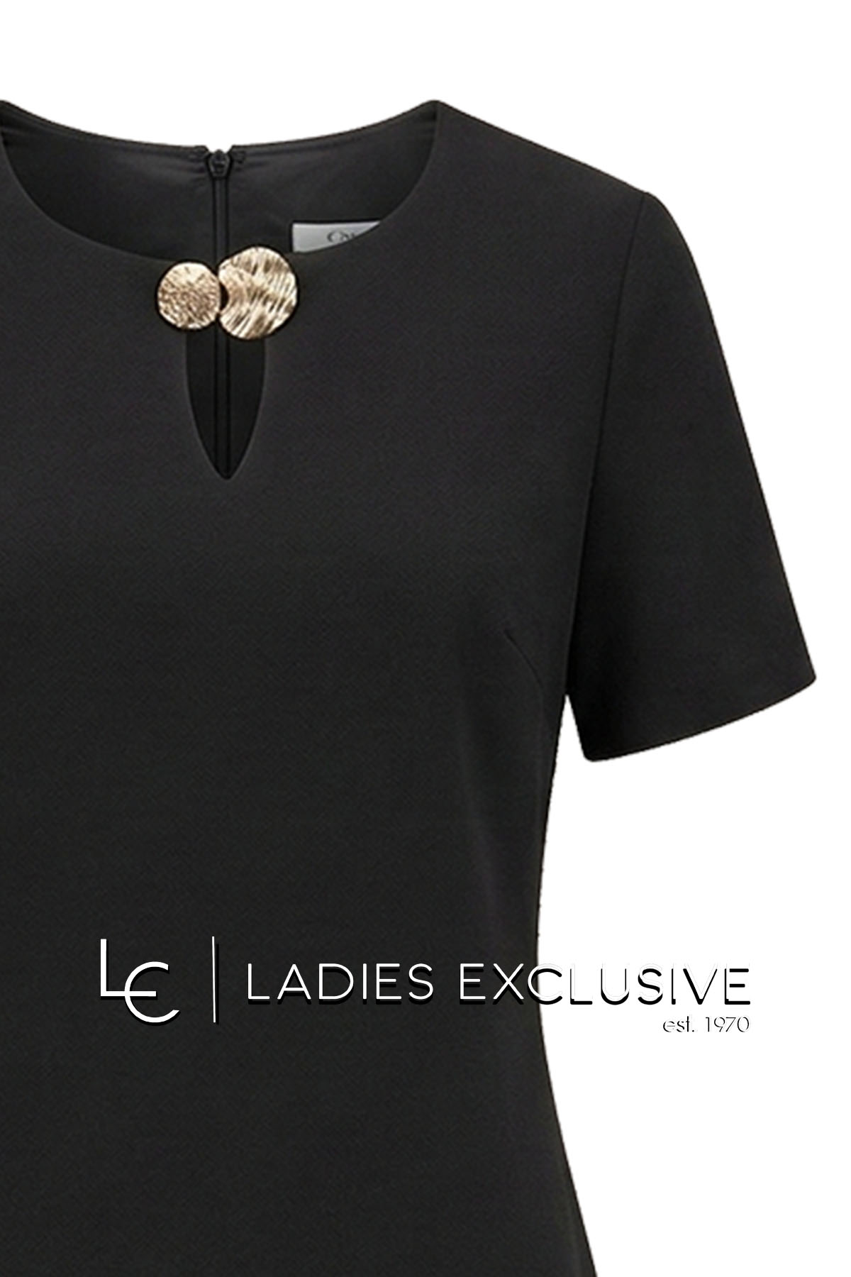 FIBES Φόρεμα μαύρο κρεπ κοντομάνικο σε ίσια γραμμή, με ιδιαίτερο διακοσμητικό στη λαιμόκοψη και άνοιγμα στο κάτω μέρος.