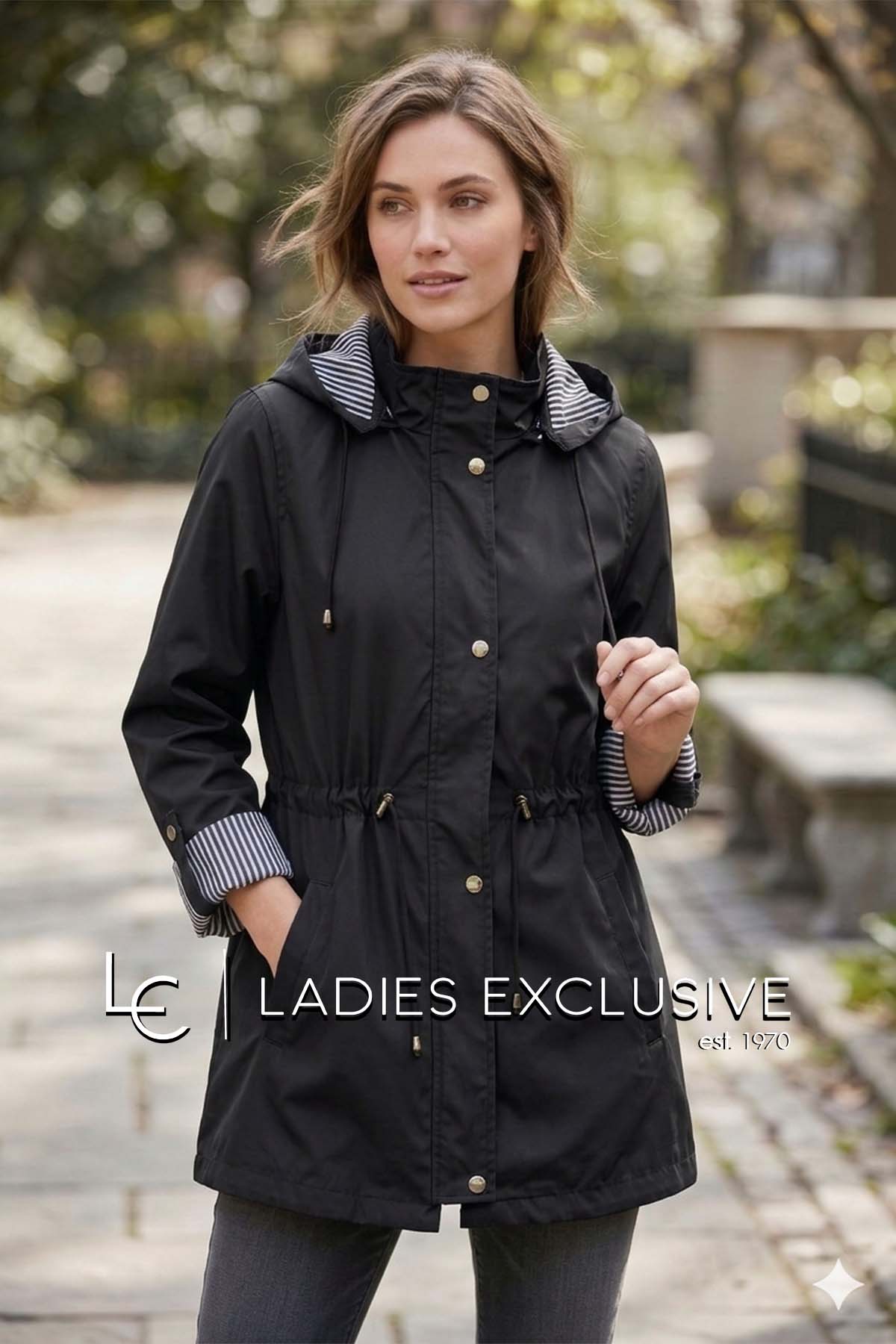 FIBES Μπουφάν μαύρο αντιανεμικό με κουκούλα που αφαιρείται και ελαστικό σούρωμα στη μέση.
