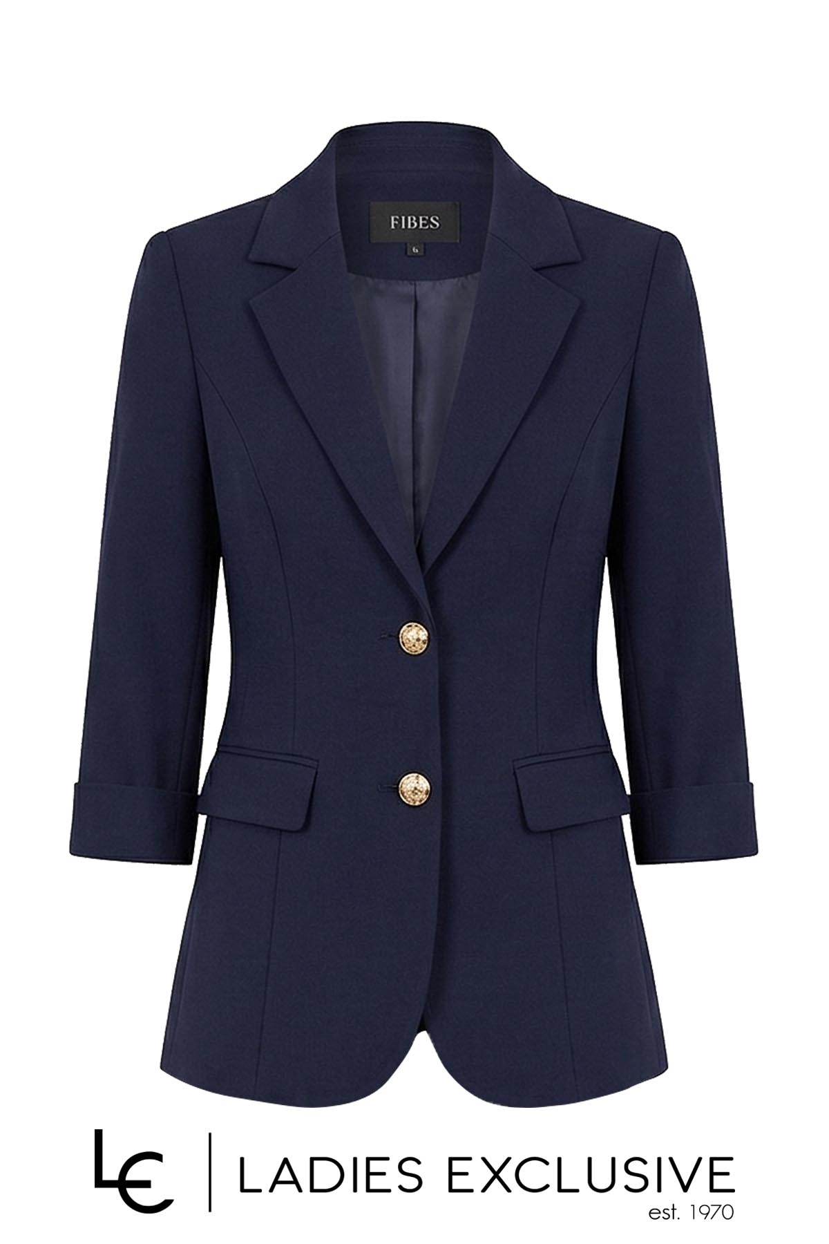 FIBES Σακάκι μπλε κρεπ με μανίκι 3/4 και τσέπες με καπάκια. Γίνεται σετ με το παντελόνι με κωδικό 04-8102.03.