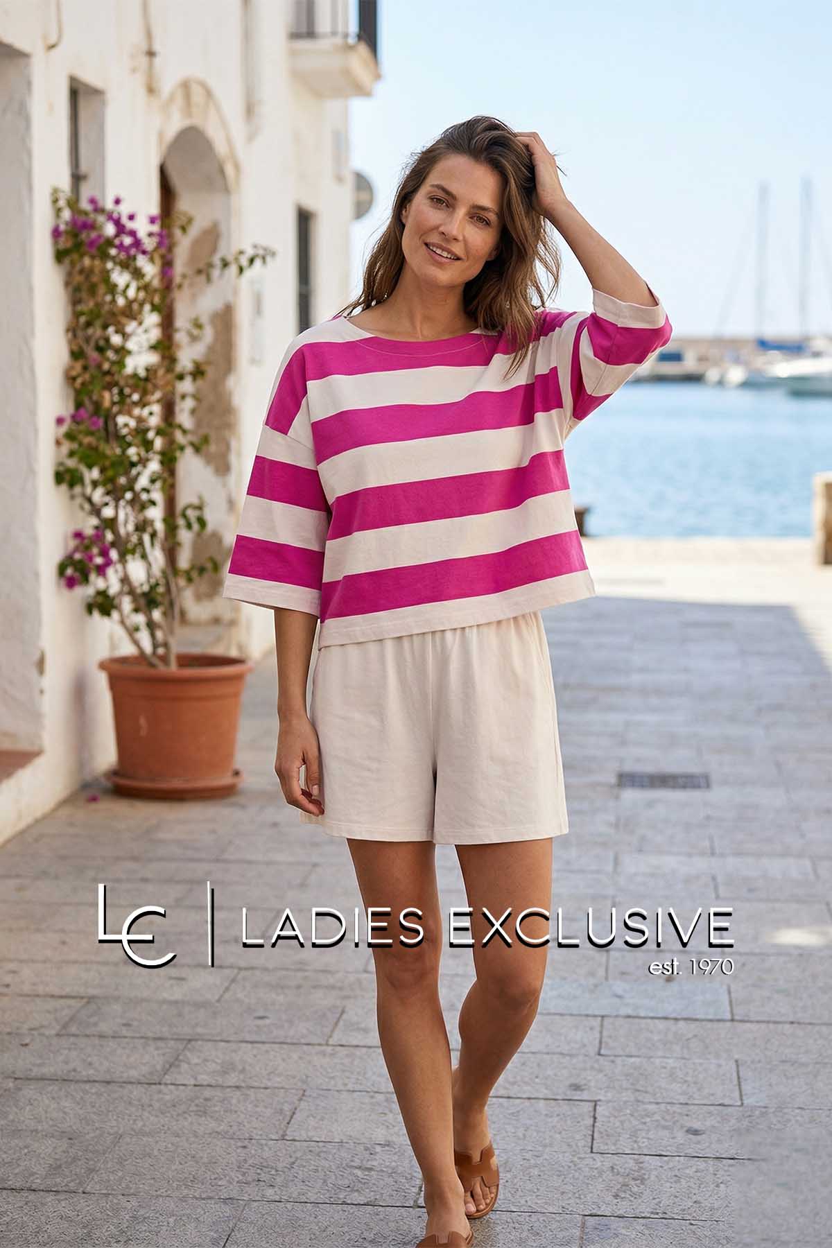 FRANSA Μπλούζα ριγέ φούξια με λευκό με μανίκι 3/4 και μεγάλο χαμόγελο.