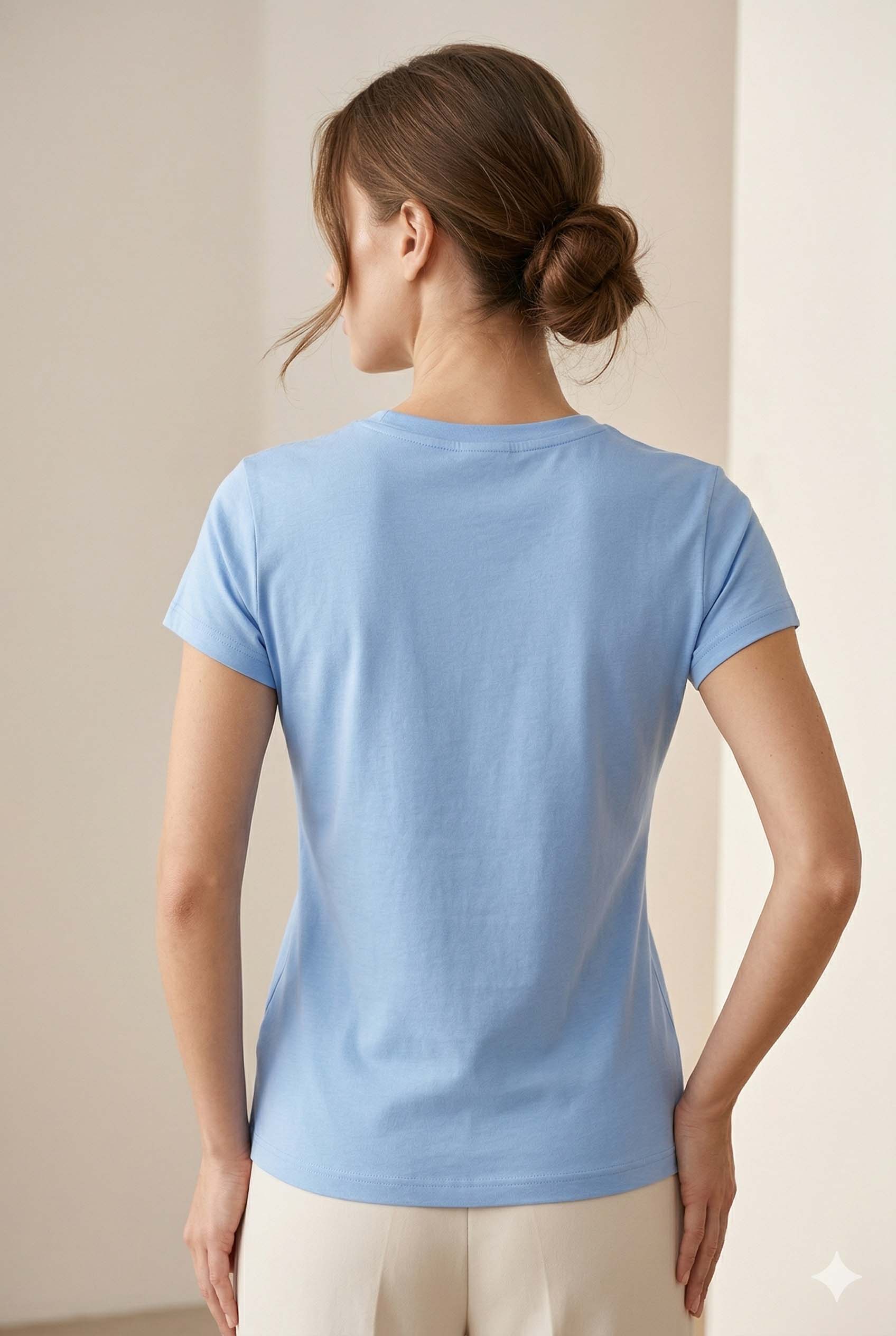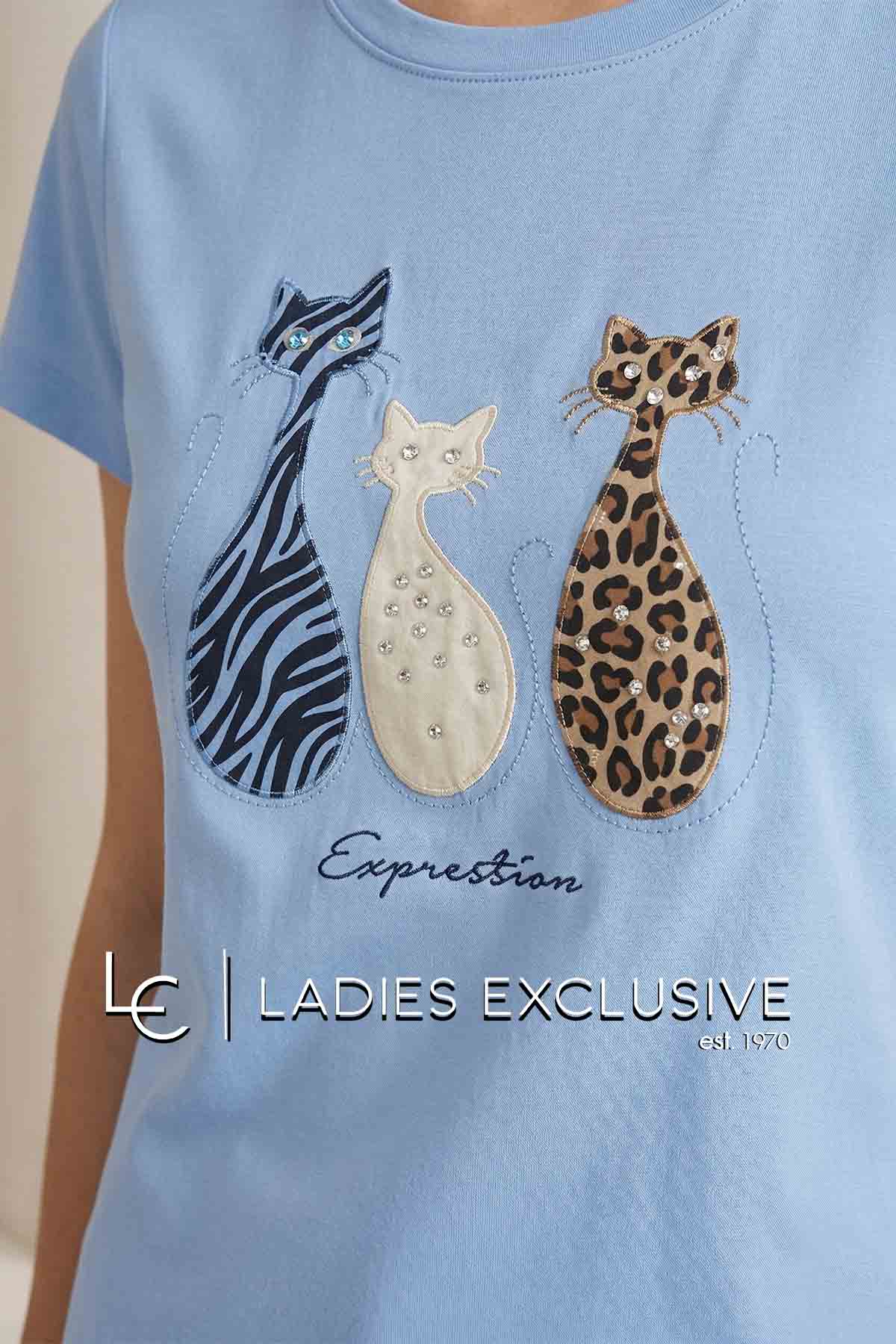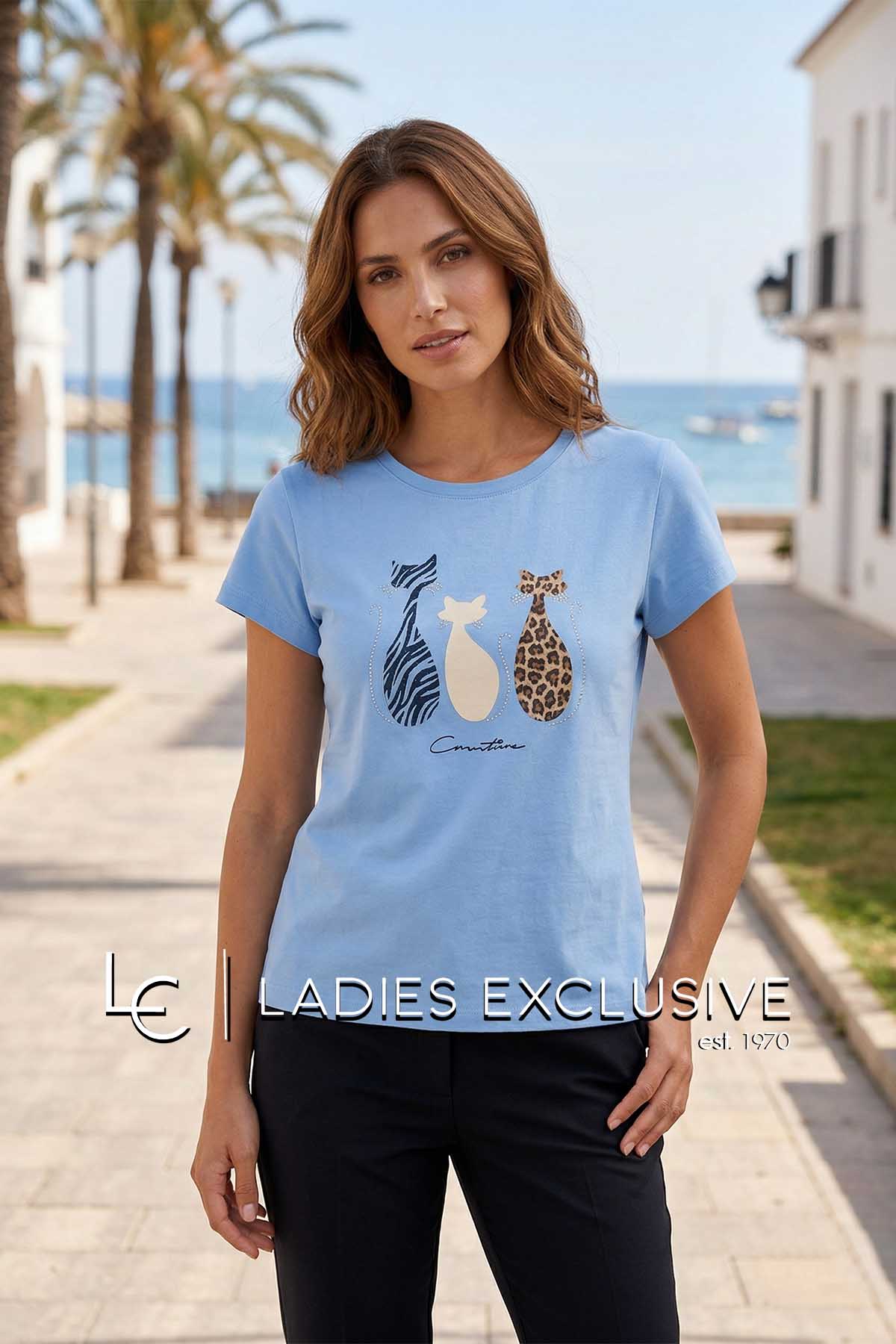 NICOLA Μπλούζα σιέλ κοντομάνικη με στάμπα γάτες και μικρά στρας.