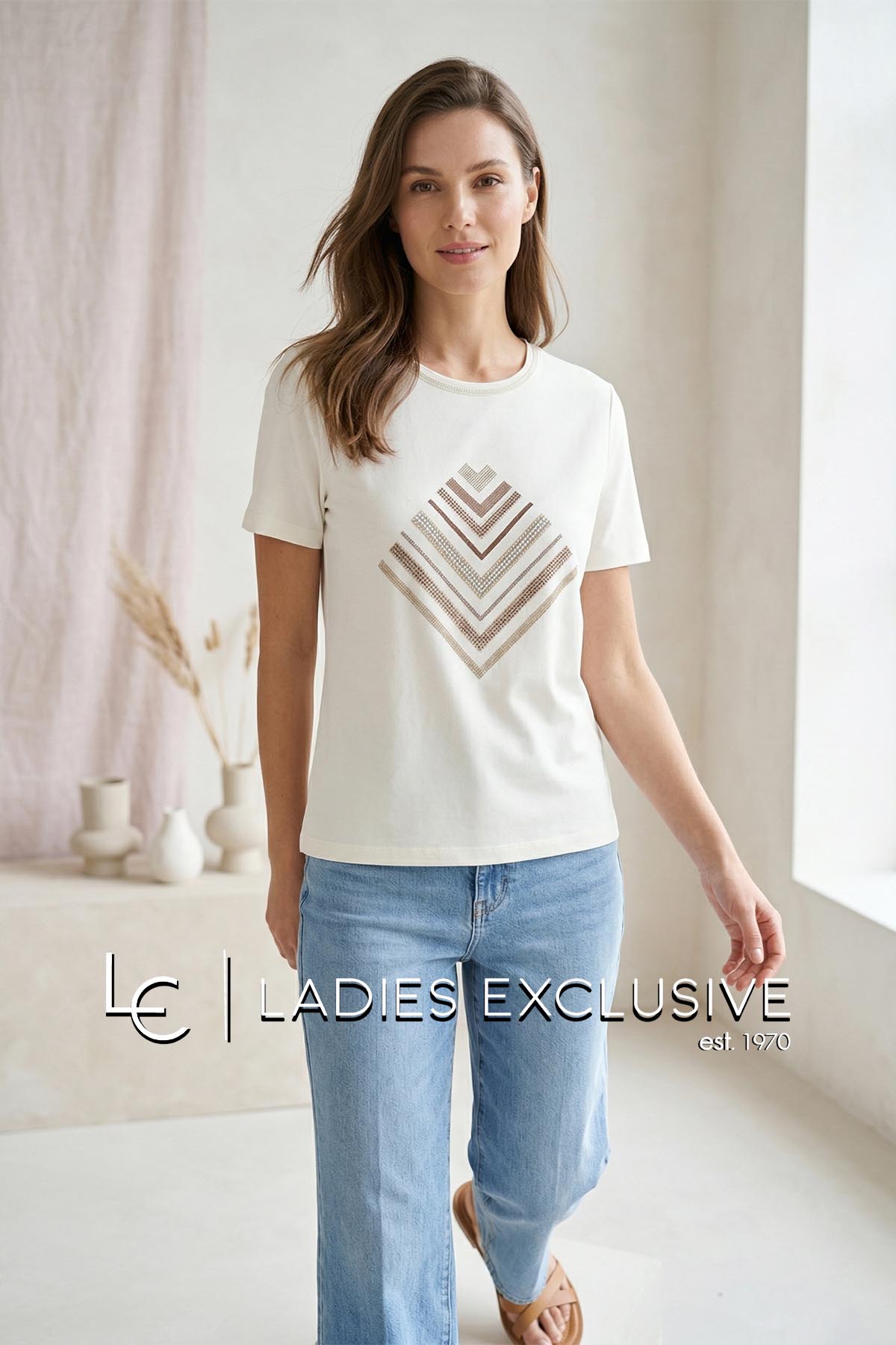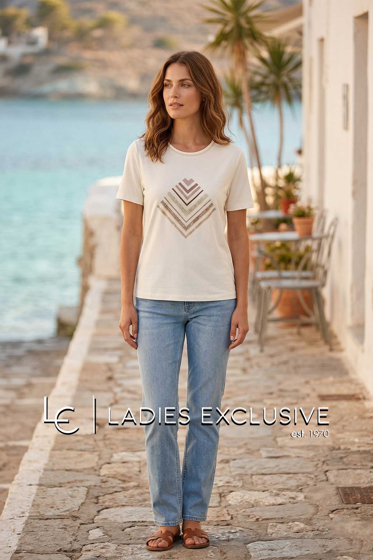 NICOLA Μπλούζα εκρού κοντομάνικη με στάμπα γεωμετρικό σχήμα και στρας.