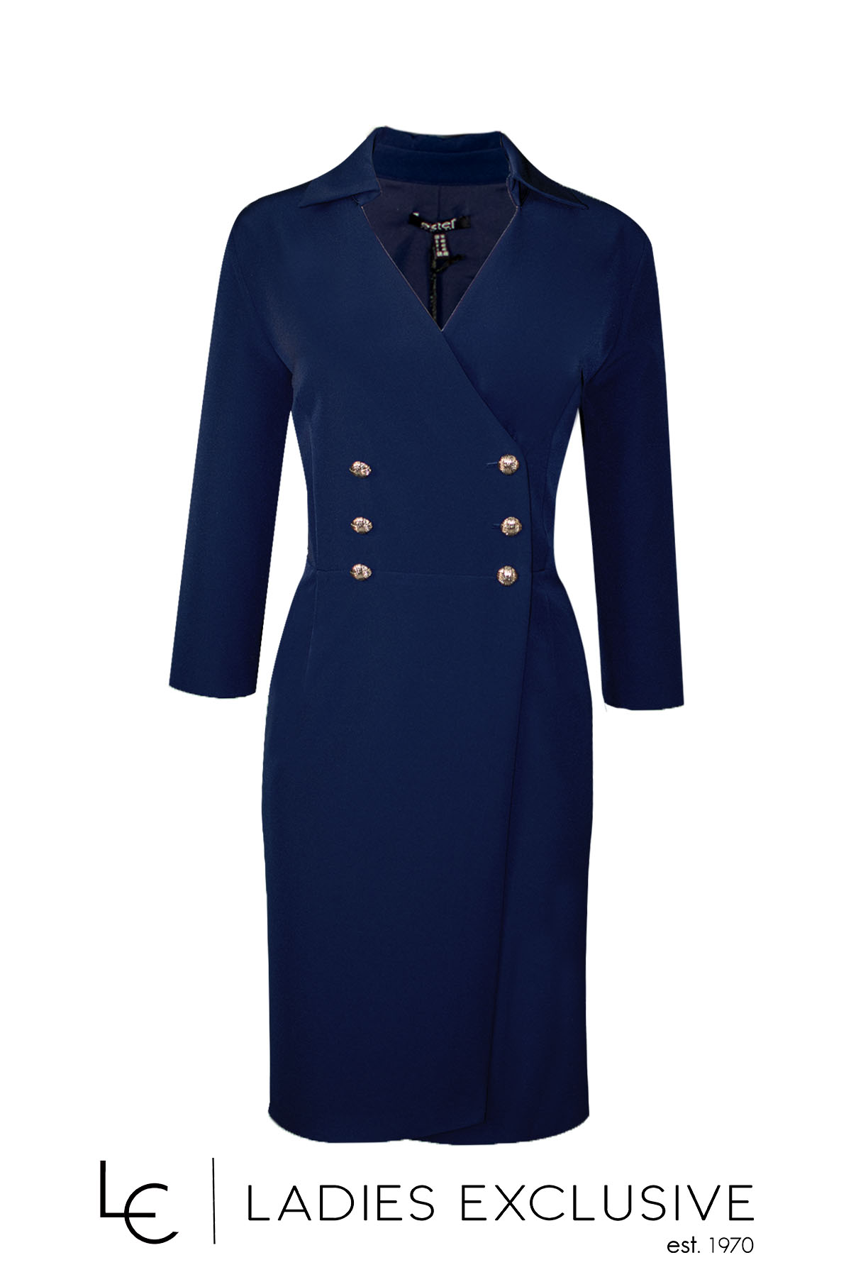 ESTEL Φόρεμα μπλε κρεπ κρουαζέ με πέτο γιακά και χρυσά κουμπιά.