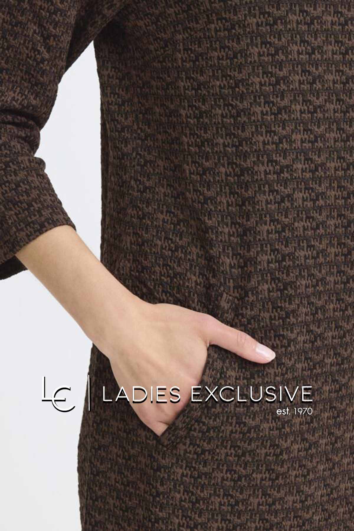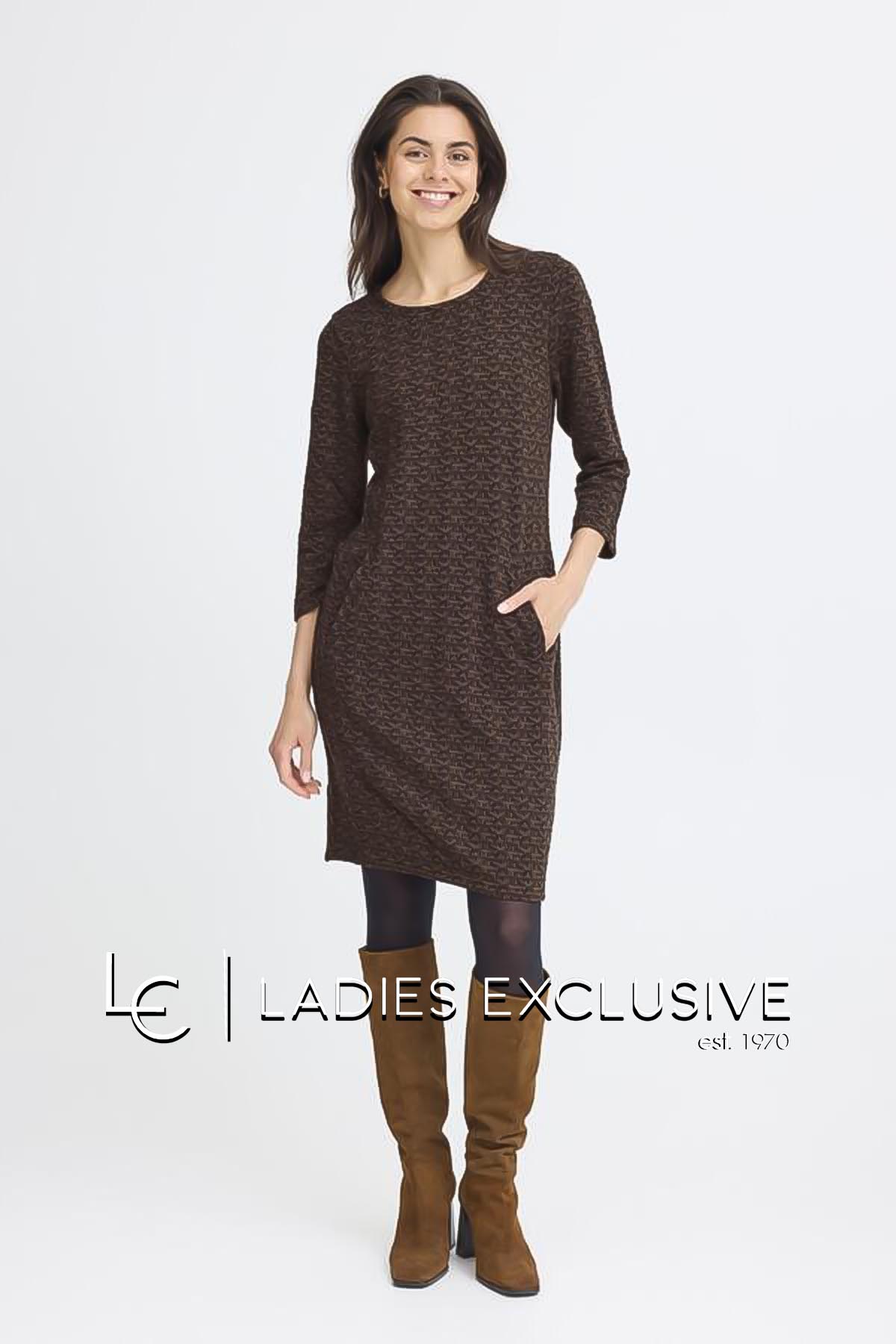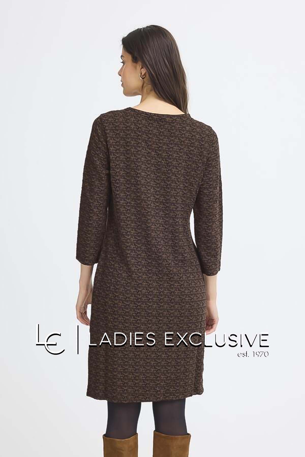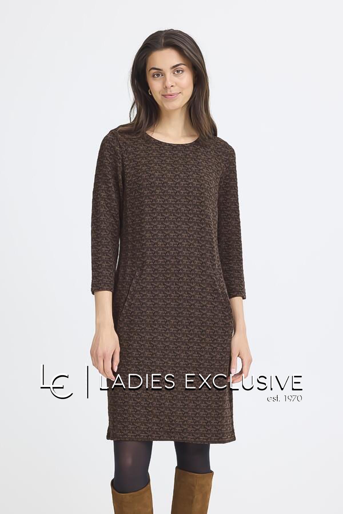 FRANSA Φόρεμα καφέ πλεκτό ζακάρ με πλαϊνες τσέπες.