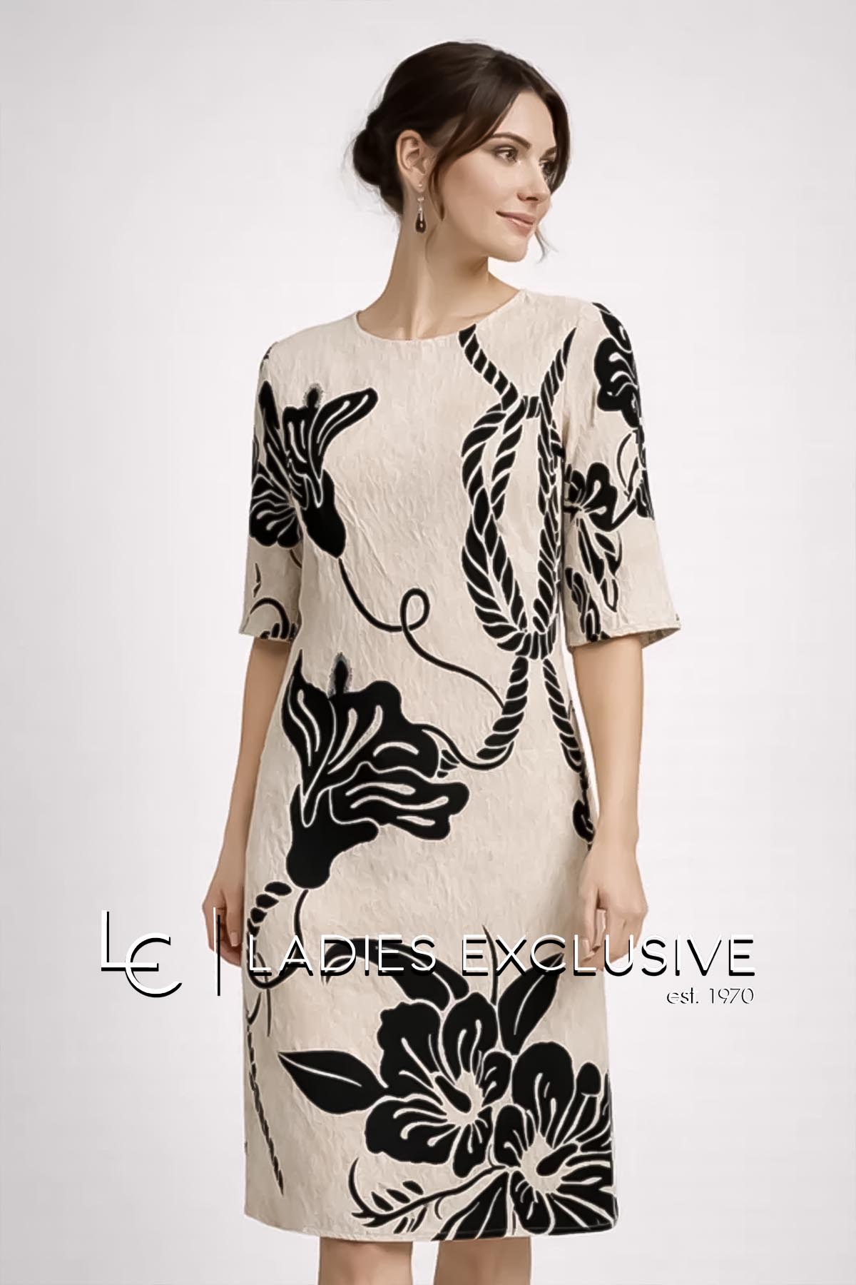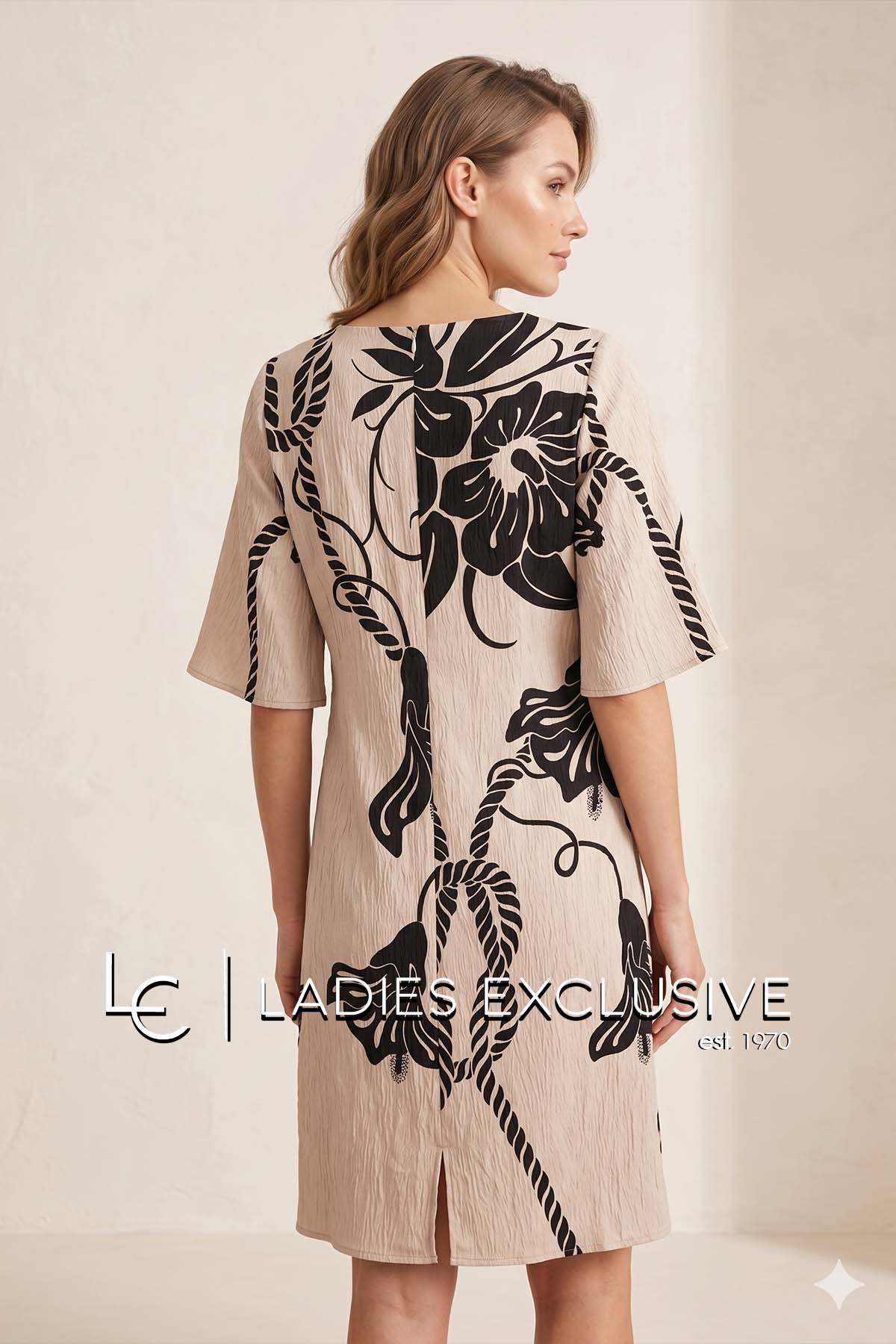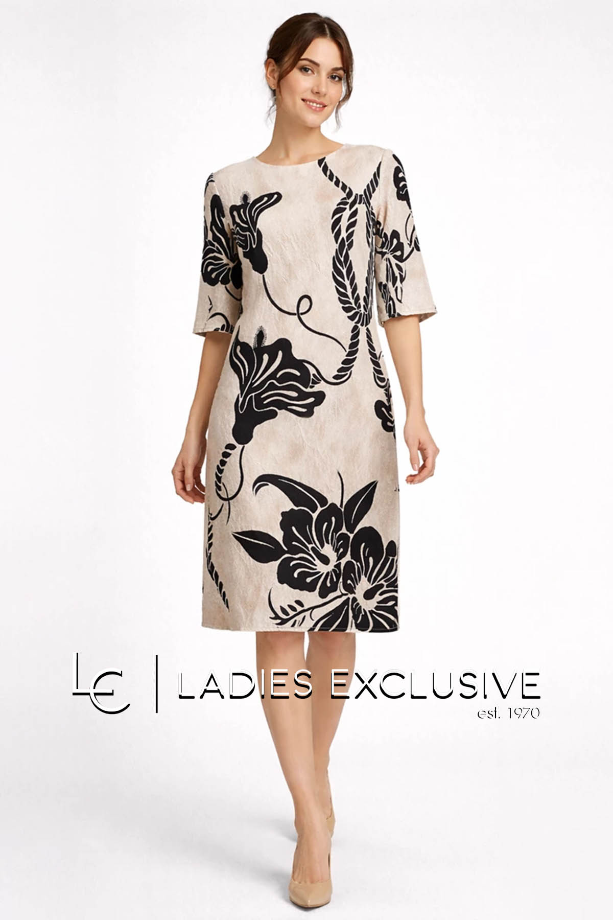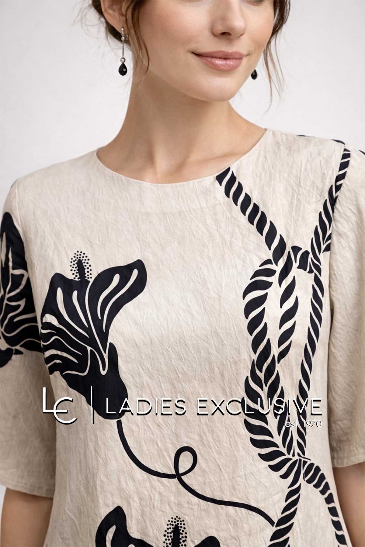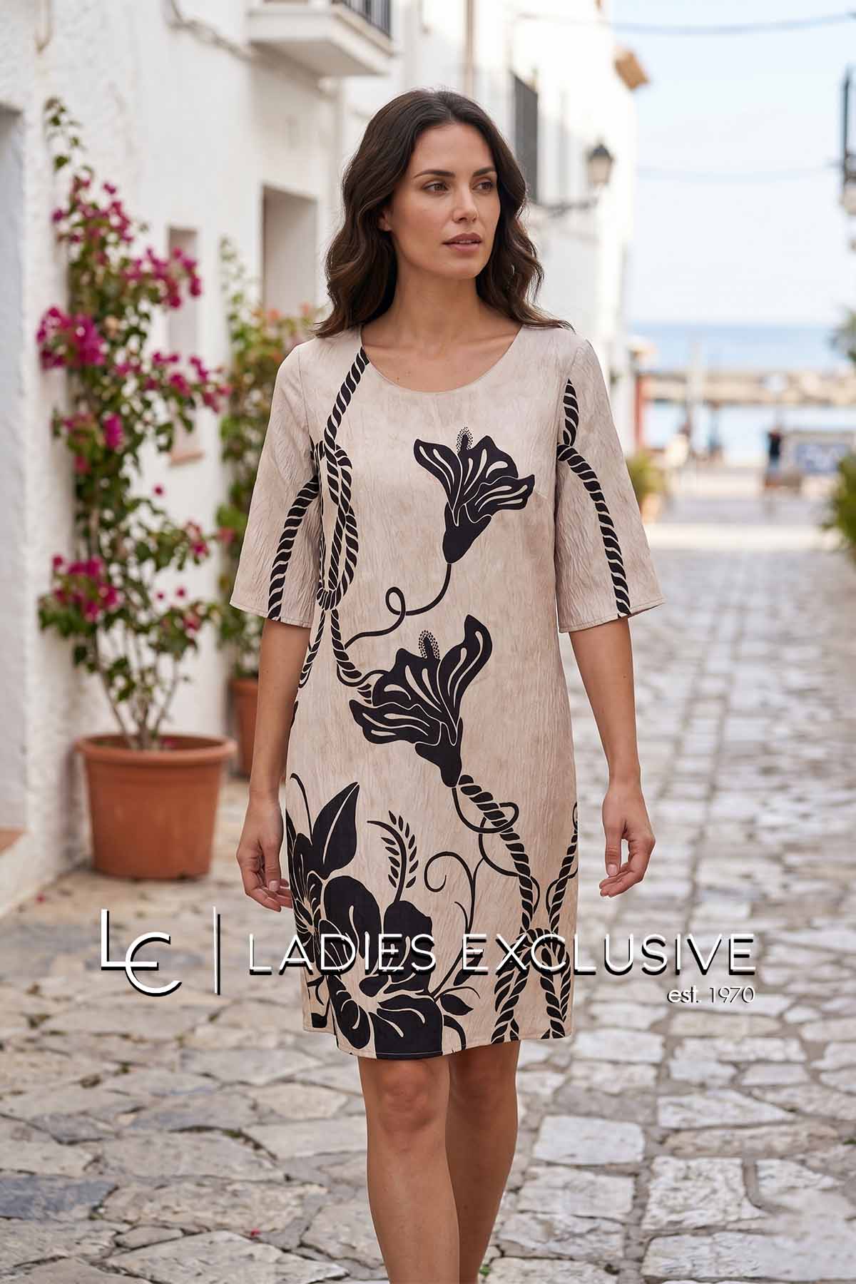 WEFTS Φόρεμα μπεζ με μαύρα σχέδια σε άνετη γραμμή με μανίκι 3/4.