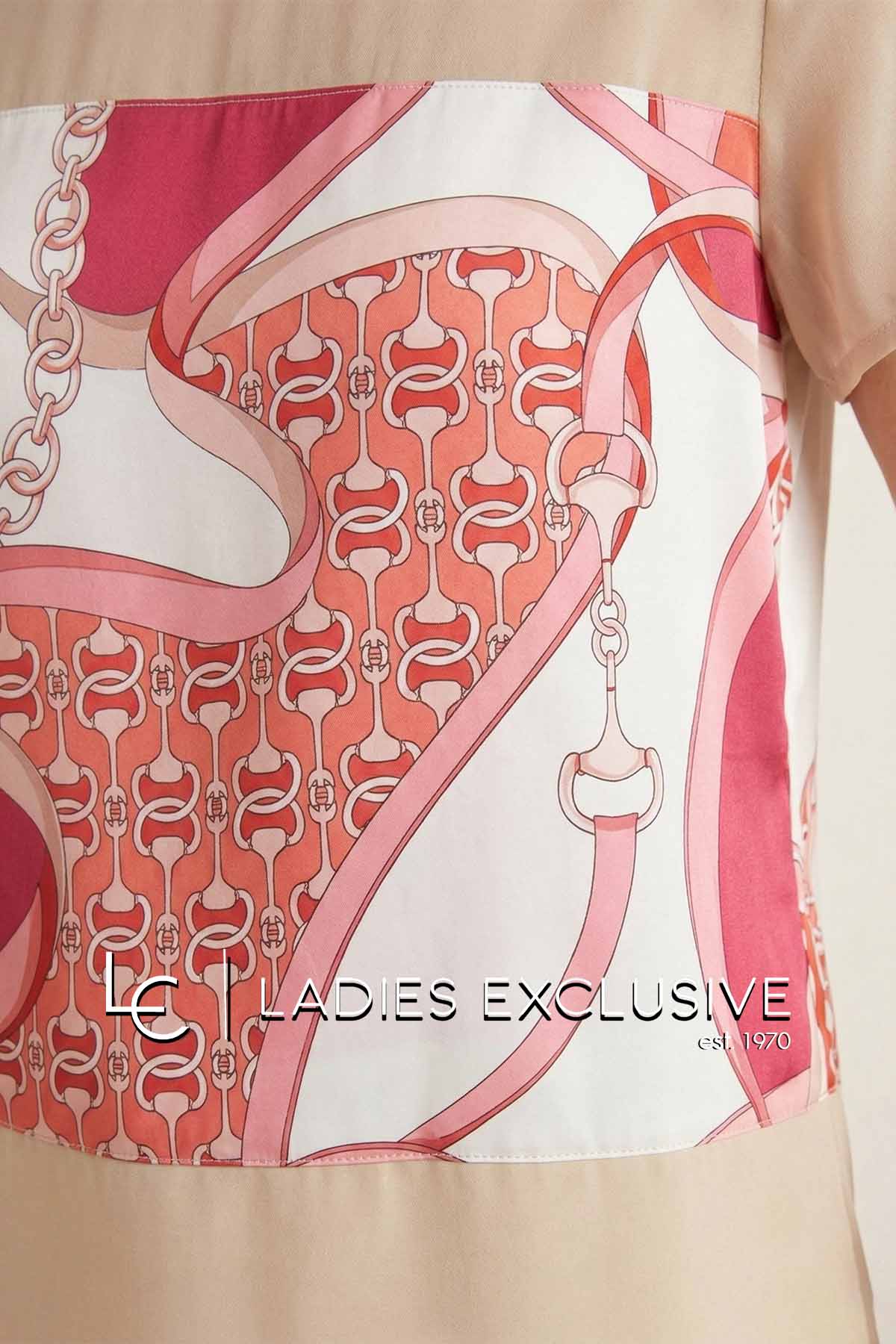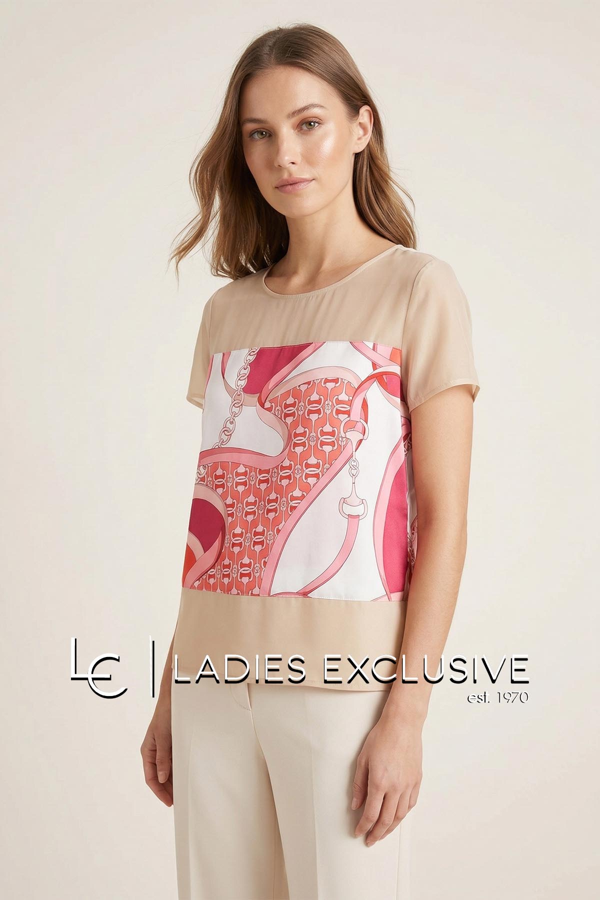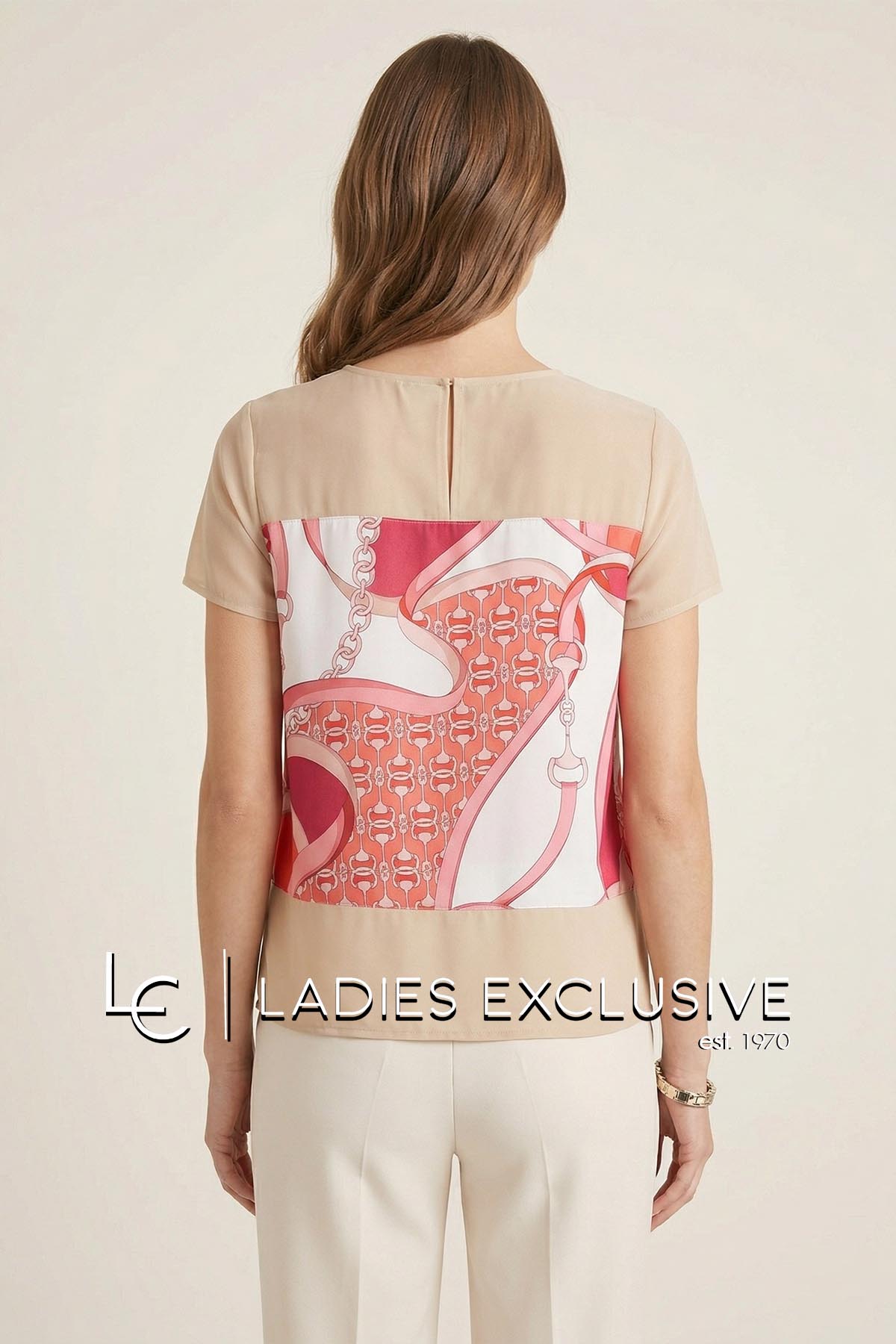 BELLA P. Μπλούζα κοντομάνικη σατέν με σχέδιο κόκκινες αλυσίδες και διαφάνεια στο πάνω μέρος και στα μανίκια.