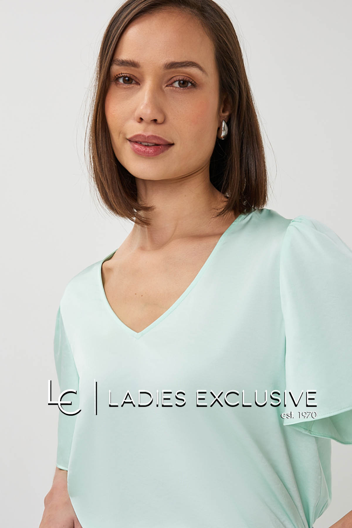 ESQUALO Μπλούζα μέντα κοντομάνικη σατέν με άνοιγμα v και μανίκι καμπάνα.