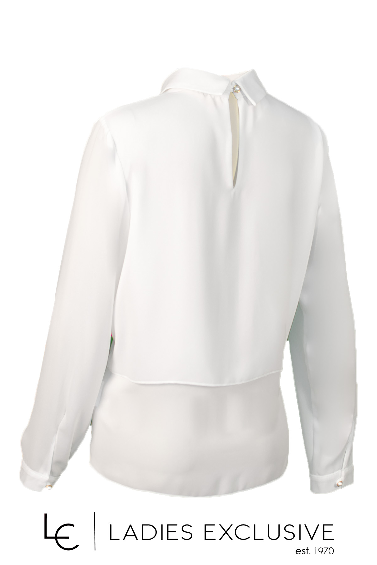 ESTEL Μπλούζα λευκή ριχτή με γιακά και δεύτερο ύφασμα που πέφτει αέρινο στο μπροστινό σημείο.
