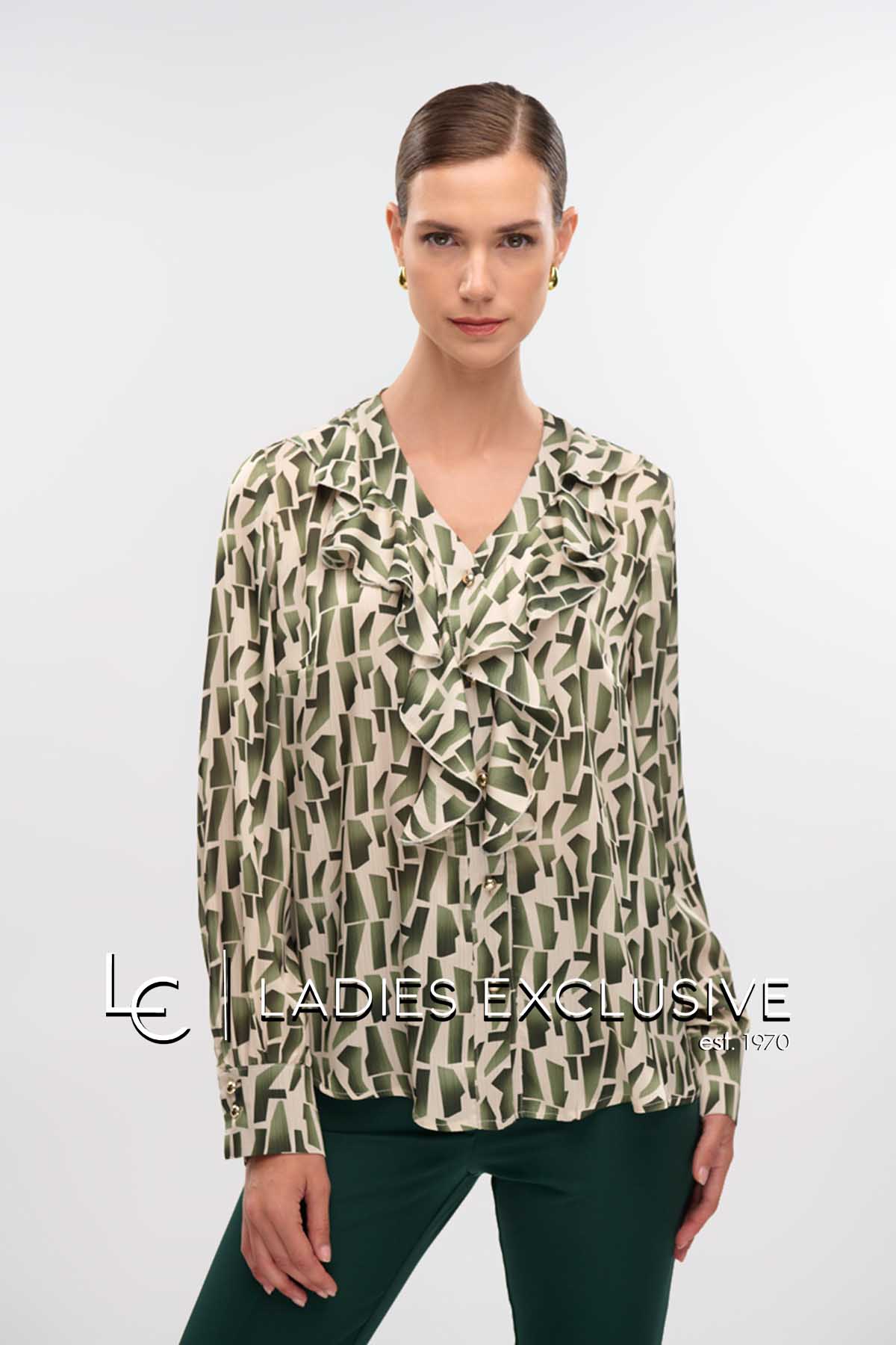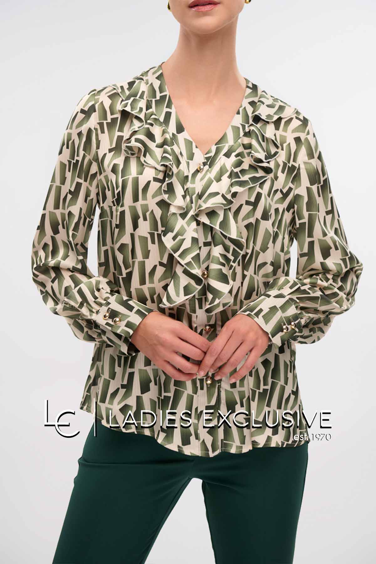FIBES Πουκάμισο πράσινο σατέν με άνοιγμα v και βολάν.