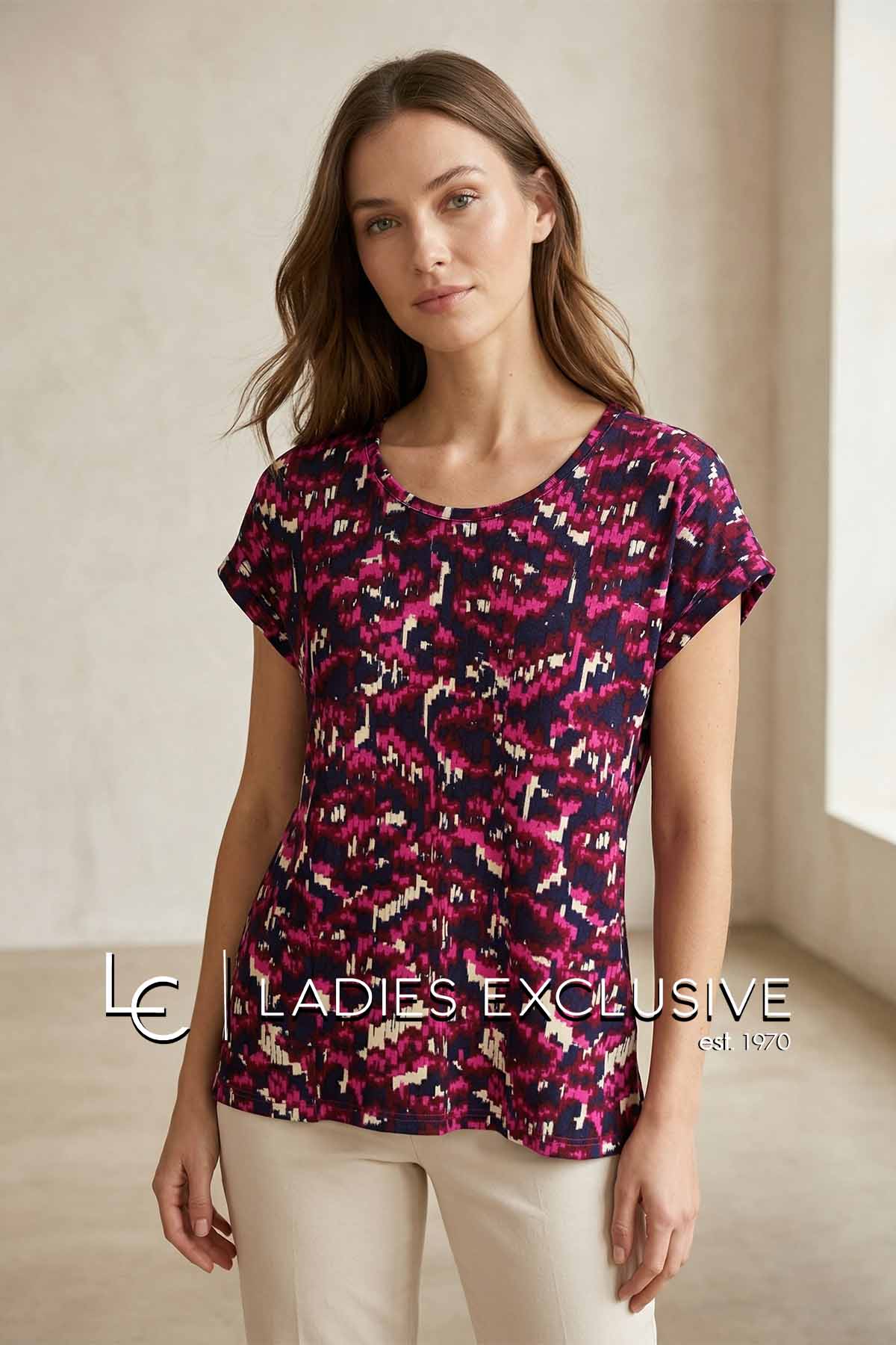 FRANSA Μπλούζα κοντομάνικη εμπριμέ σε αποχρώσεις φούξια.