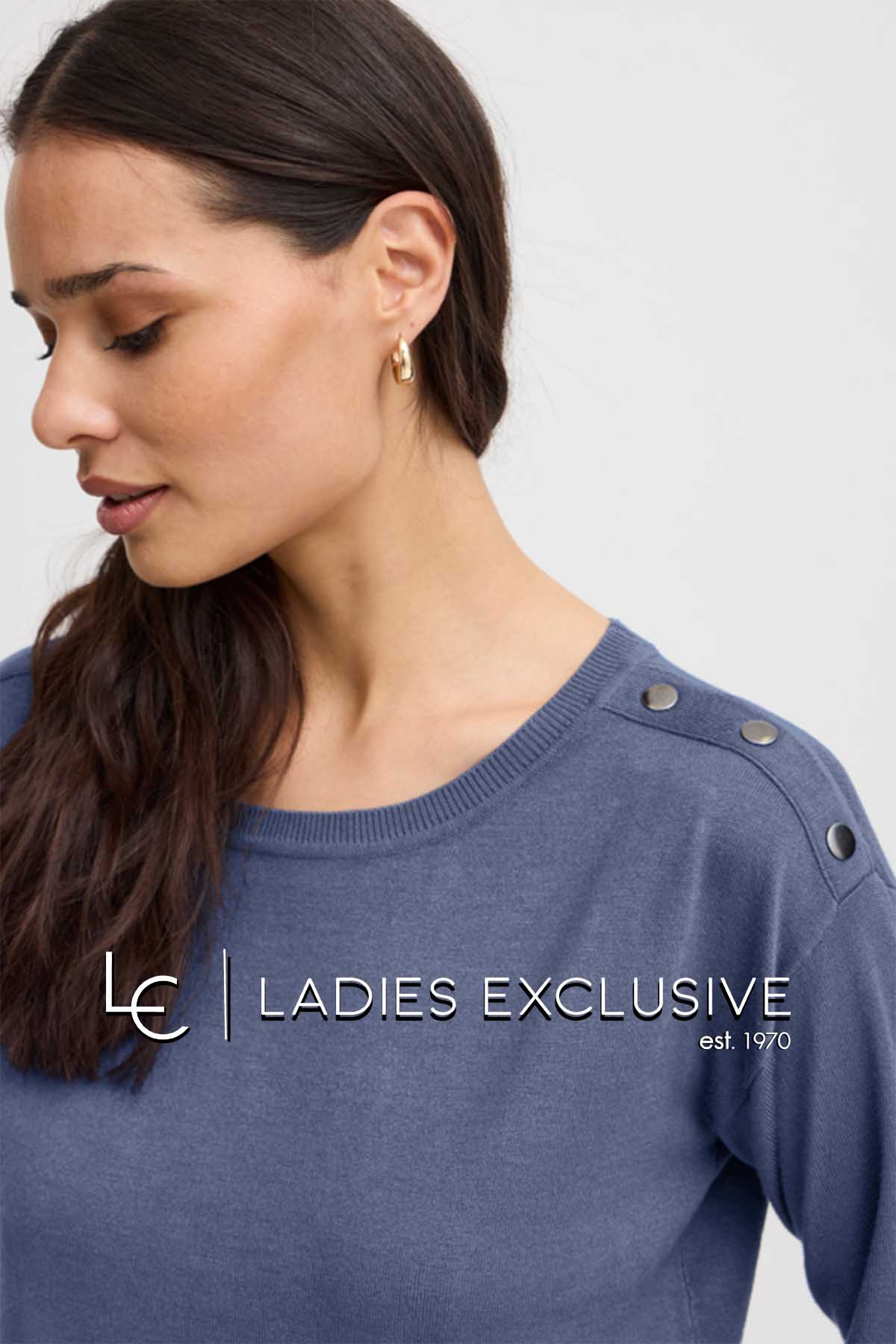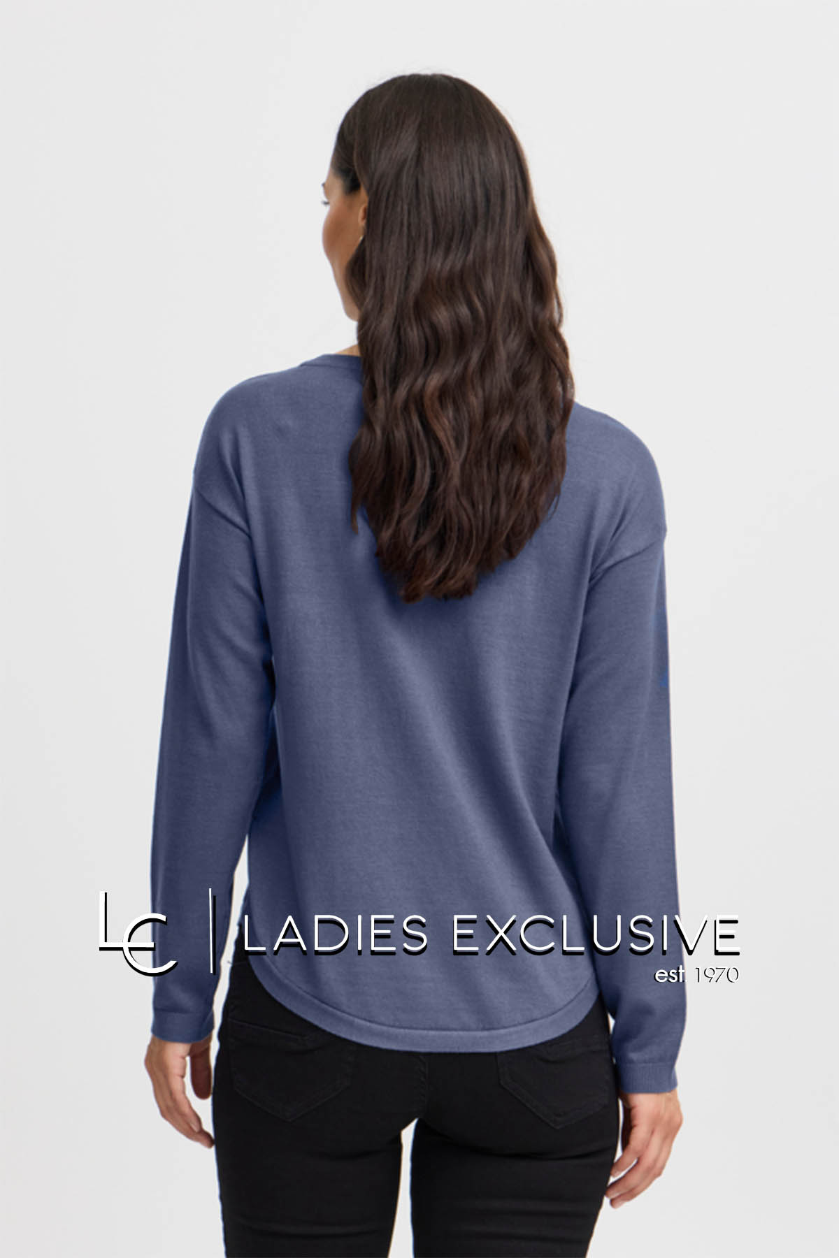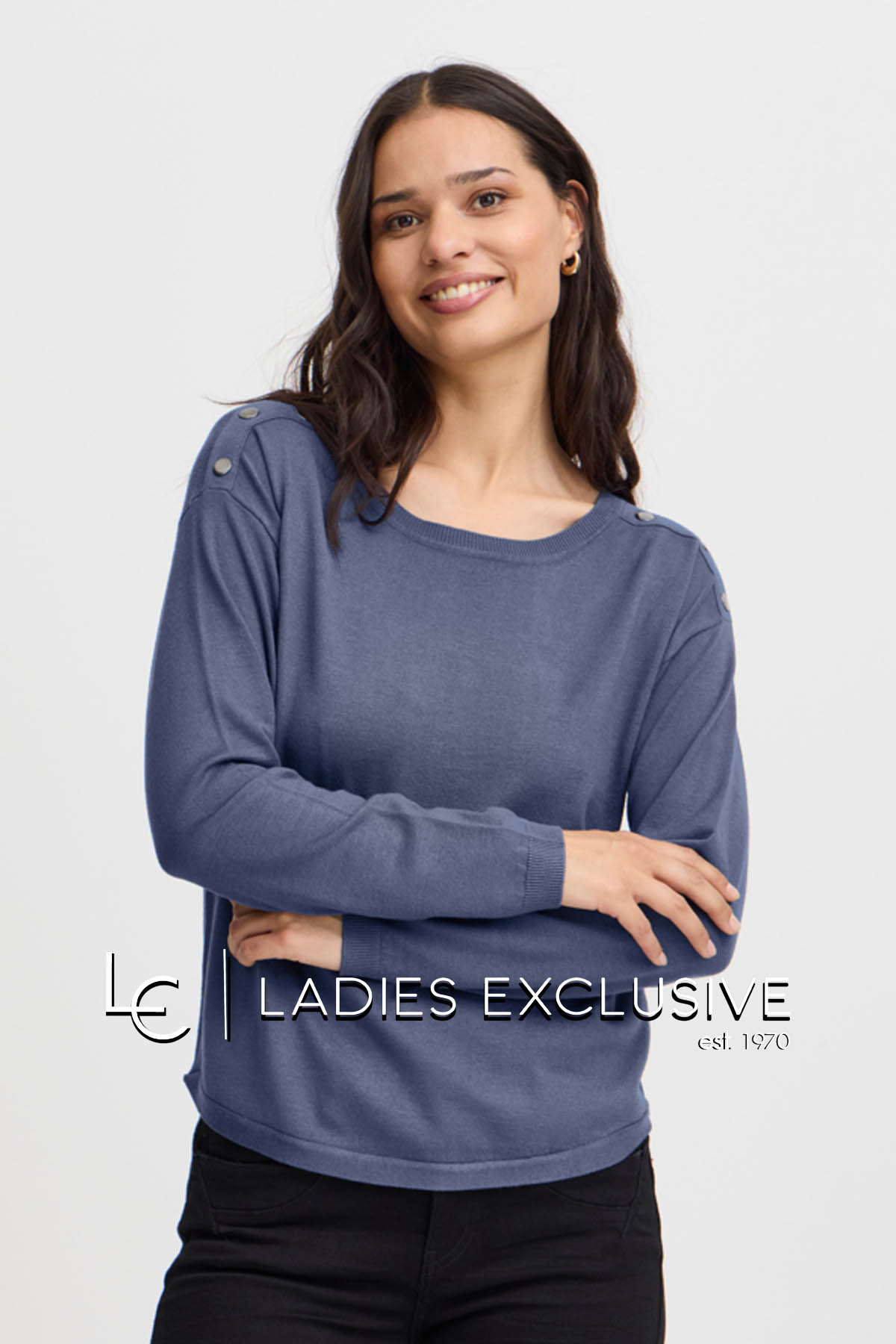 FRANSA Μπλούζα μπλε πλεκτή λεπτή από βισκόζη σε άνετη γραμμή, με στρογγυλή λαιμόκοψη και διακοσμητικά τρουκς στους ώμους.