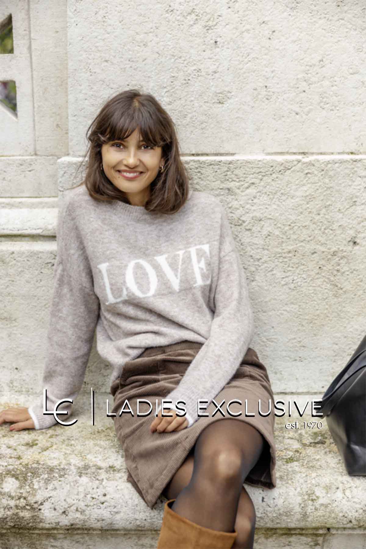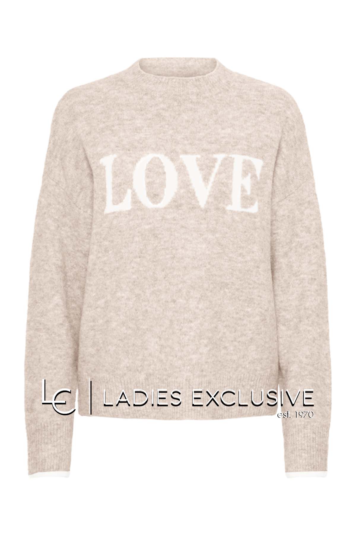 FRANSA Πουλόβερ μπεζ με λογότυπο LOVE και στρογγυλή λαιμόκοψη.