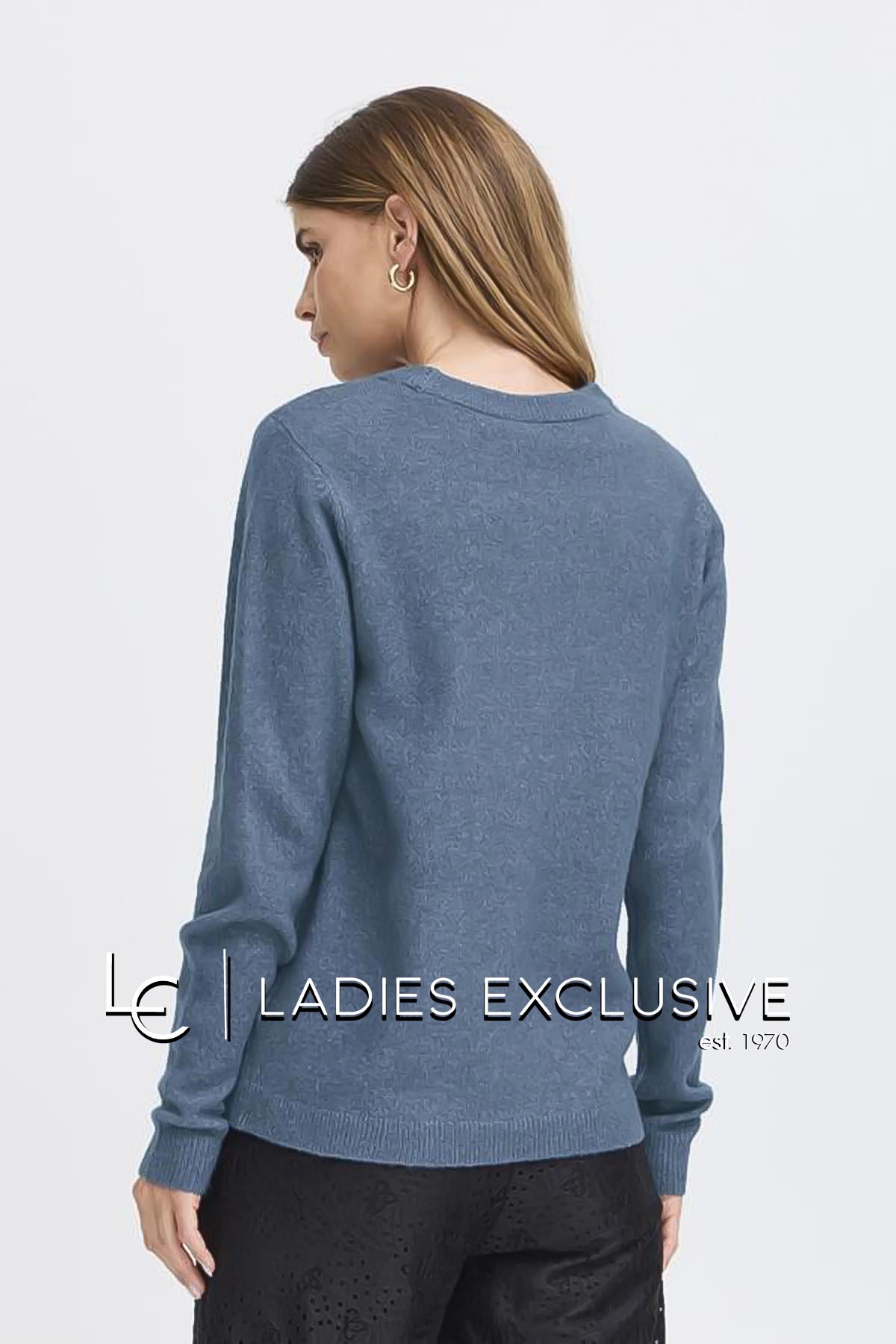 FRANSA Πουλόβερ σιέλ πλεκτό σε άνετη γραμμή με στρογγύλή λαιμόκοψη.