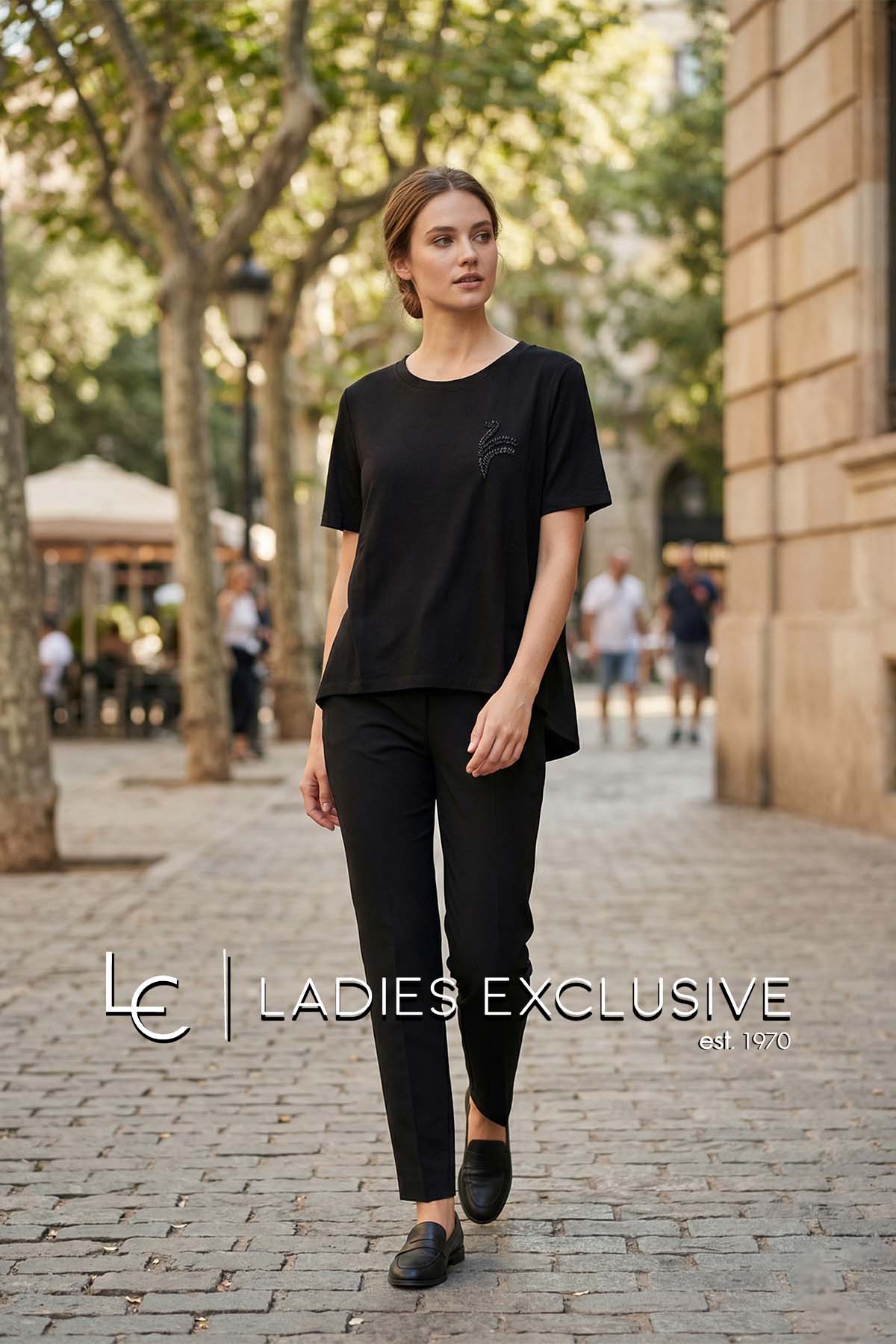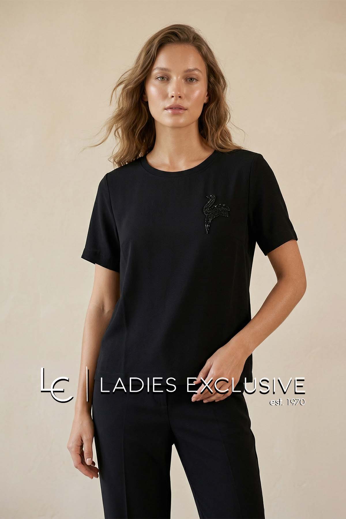 NICOLA Μπλούζα μαύρη κοντομάνικη με κύκνο με μικρές πέτρες και λεπτομέρειες δερματίνης.