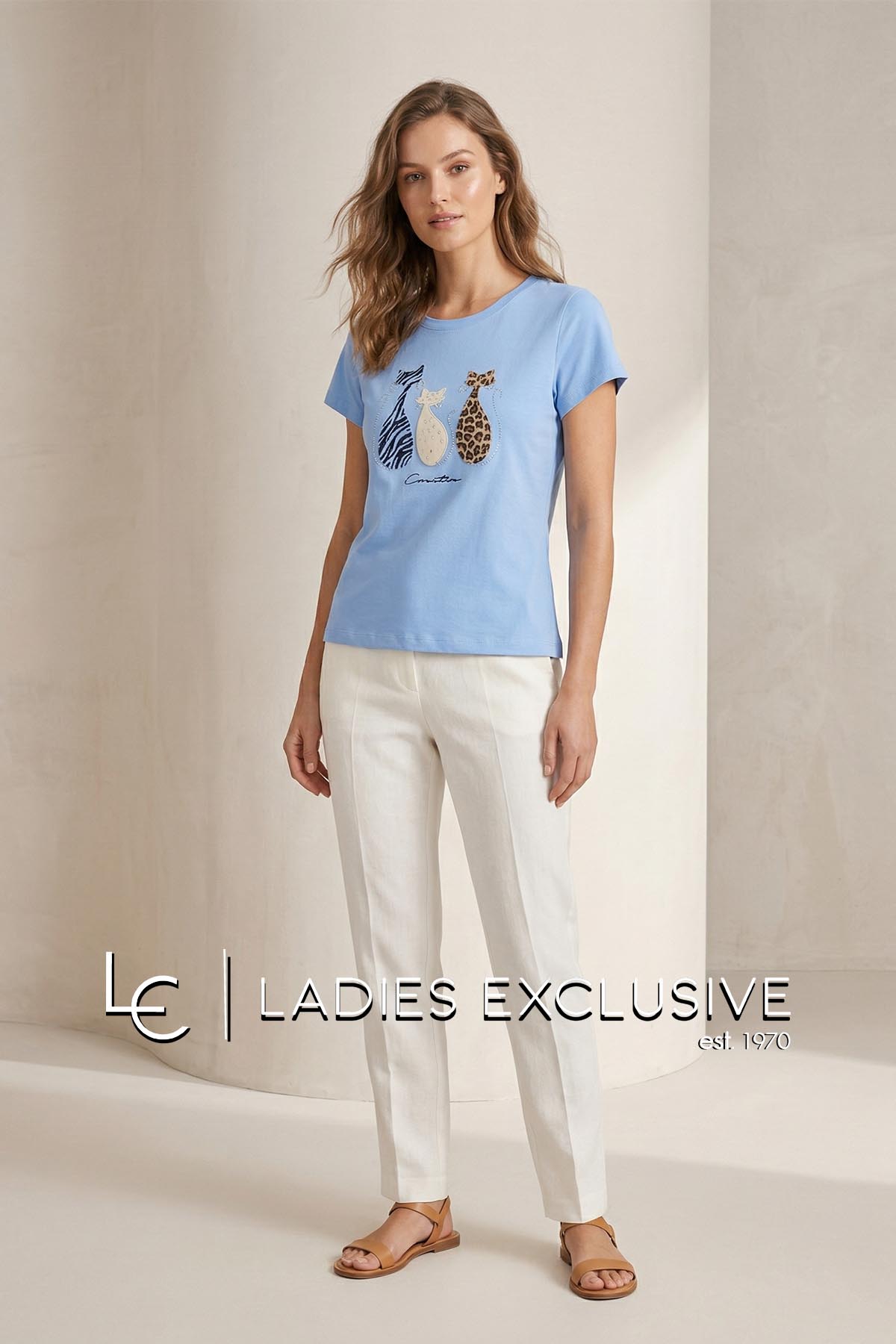 NICOLA Μπλούζα σιέλ κοντομάνικη με στάμπα γάτες και μικρά στρας.