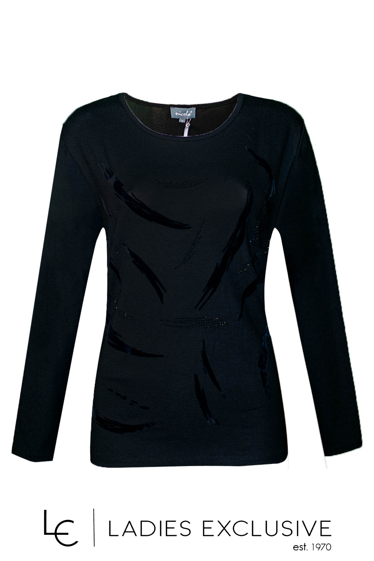NICOLA Μπλούζα μαύρη από βισκόζη με βελουτέ στάμπα και στρας.