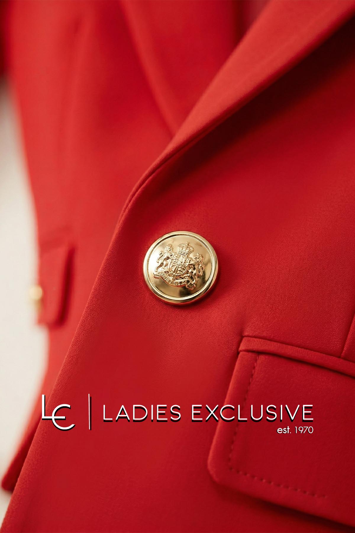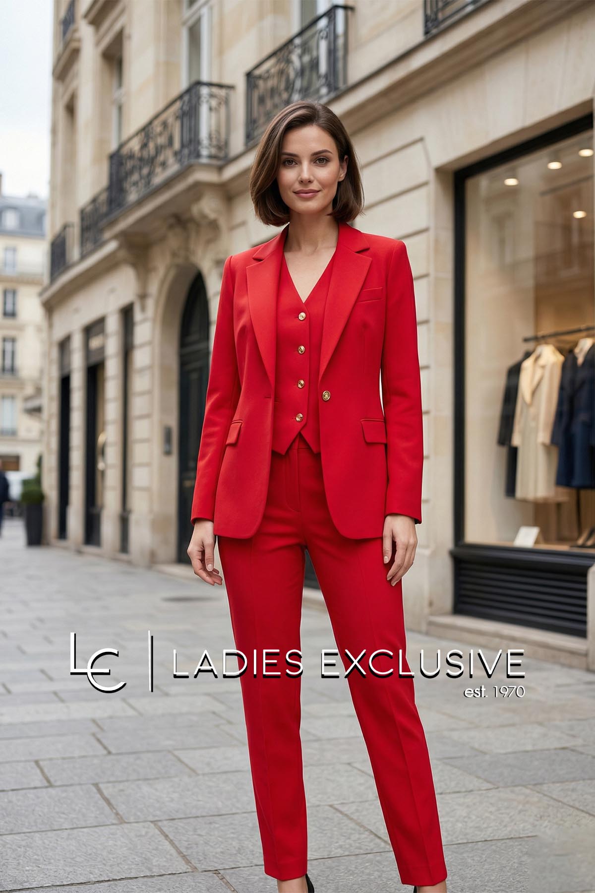 ESTEL Σακάκι κόκκινο κρεπ με μονό κουμπί και τσέπες με καπάκια. Γίνεται σετ με το παντελόνι με κωδικό 08710-00.02 και με το γιλέκο με κωδικό 08702-00.02.