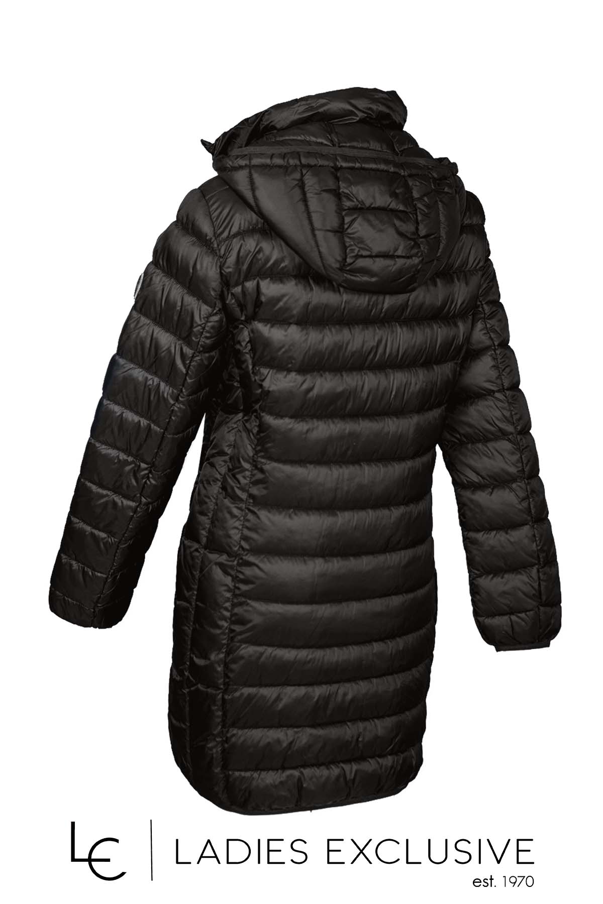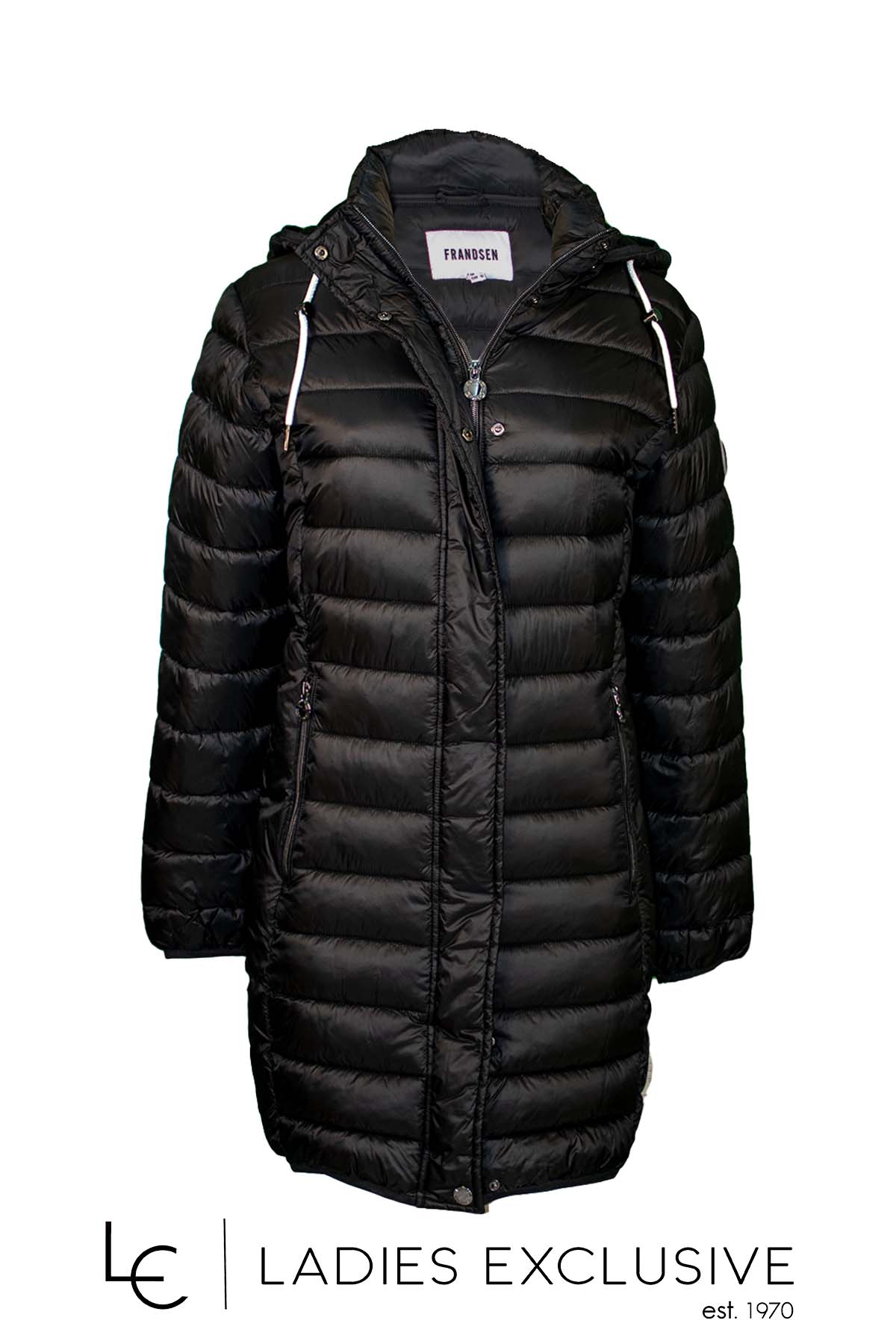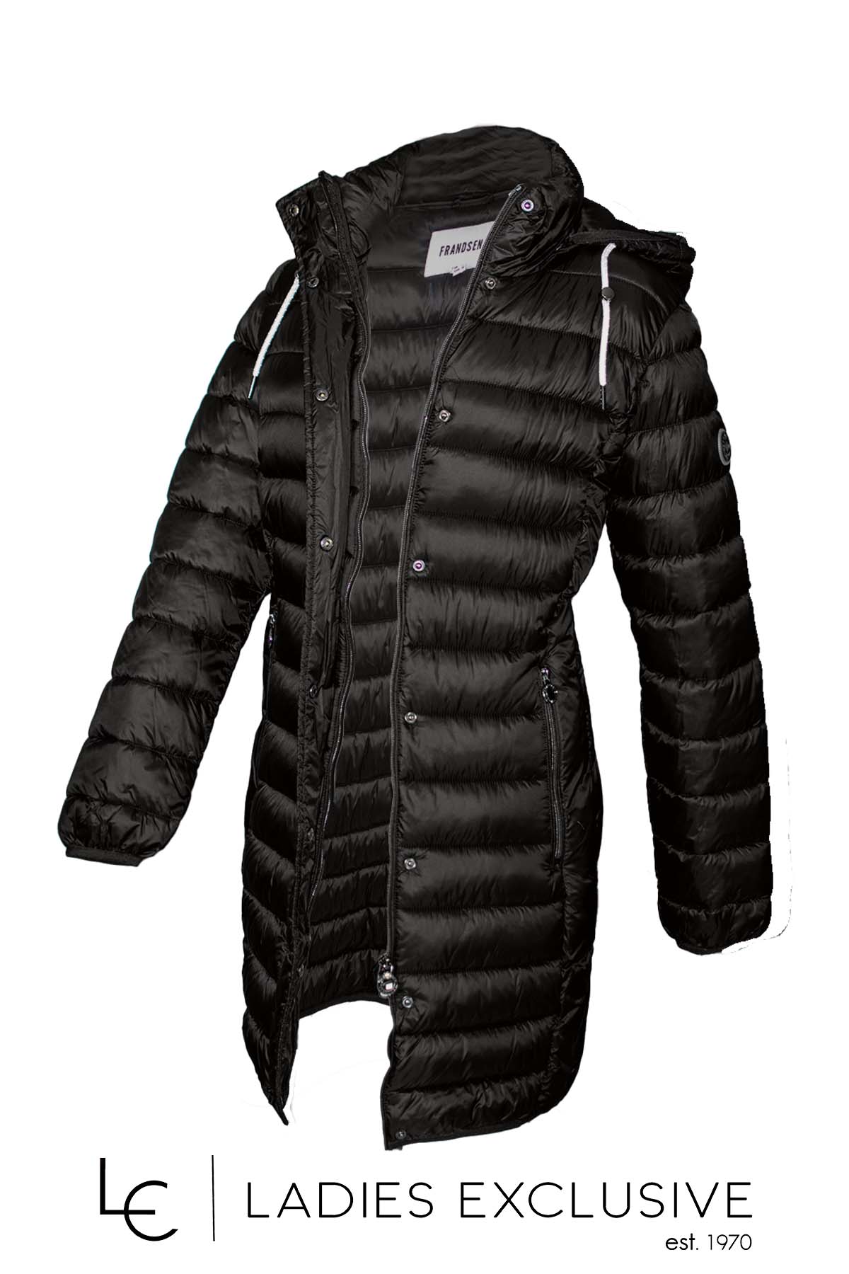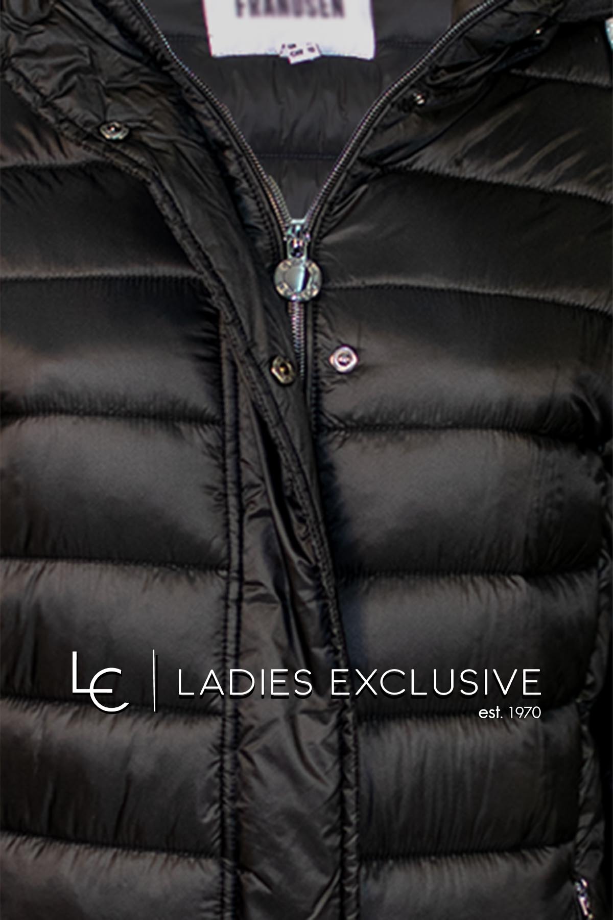FRANDSEN Μπουφάν μαύρο καπιτονέ μακρύ με κουκούλα που αφαιρείται.