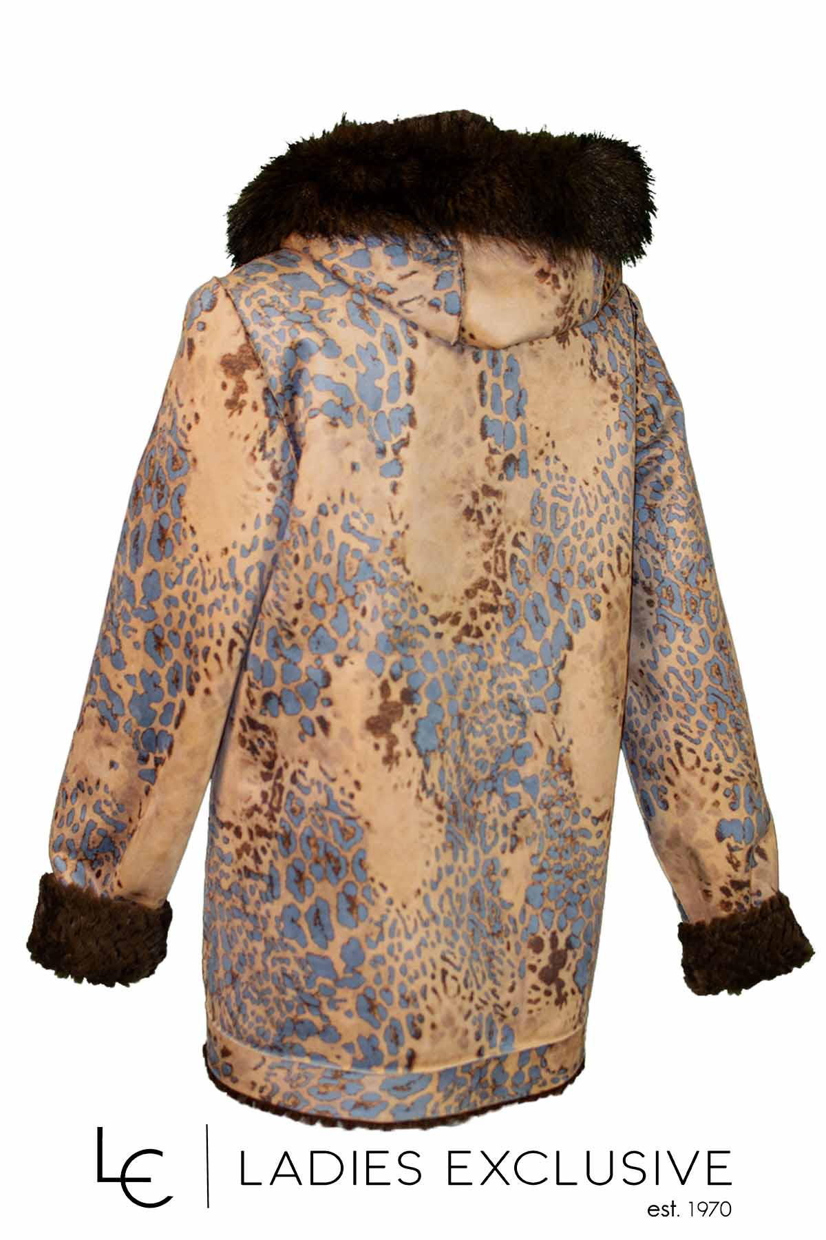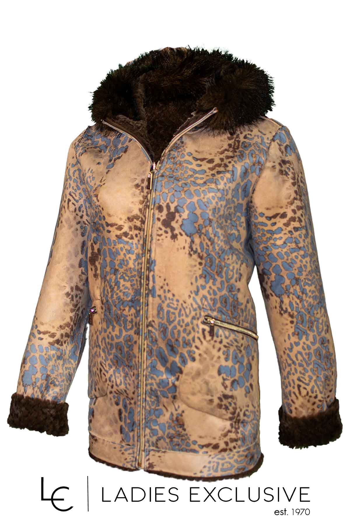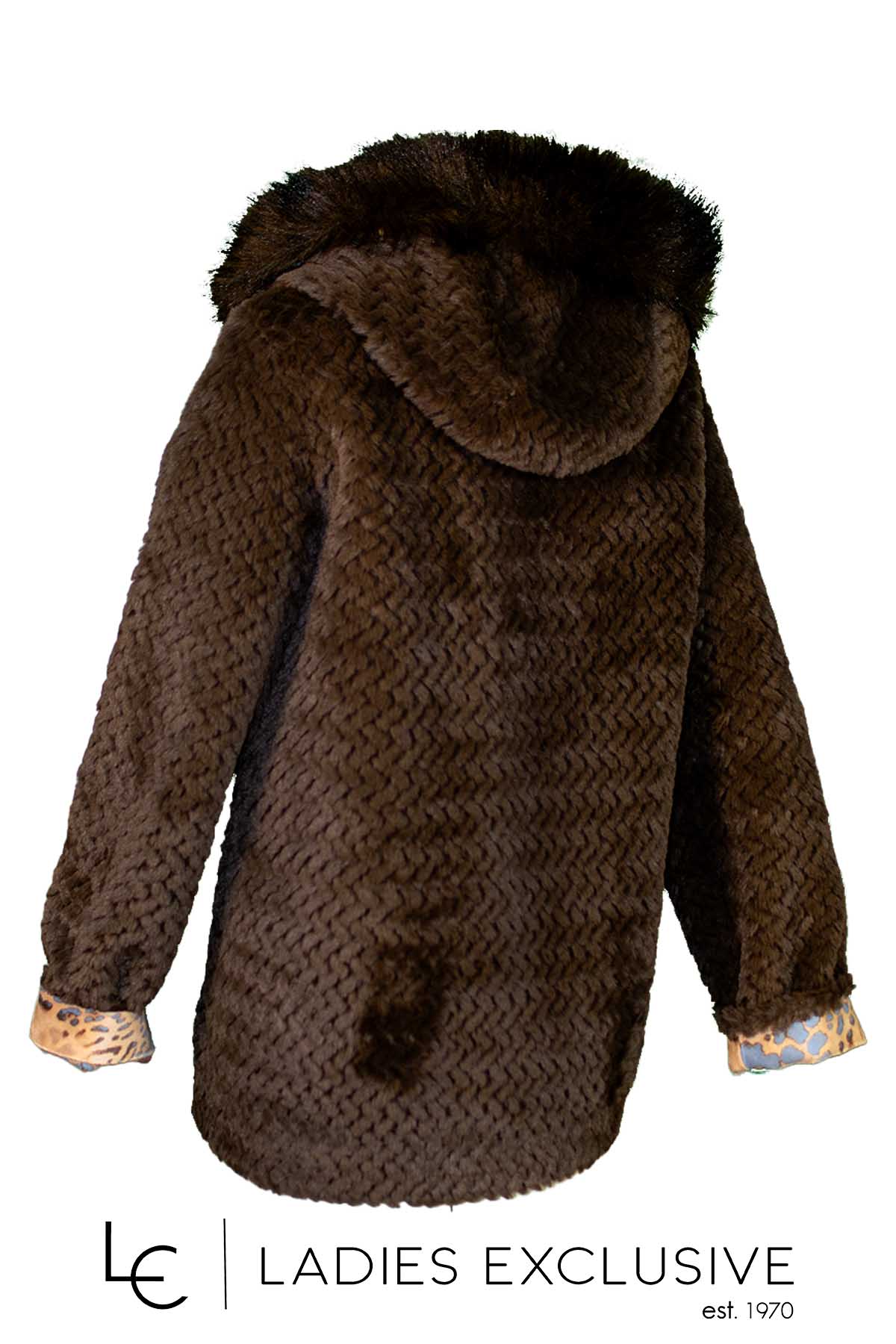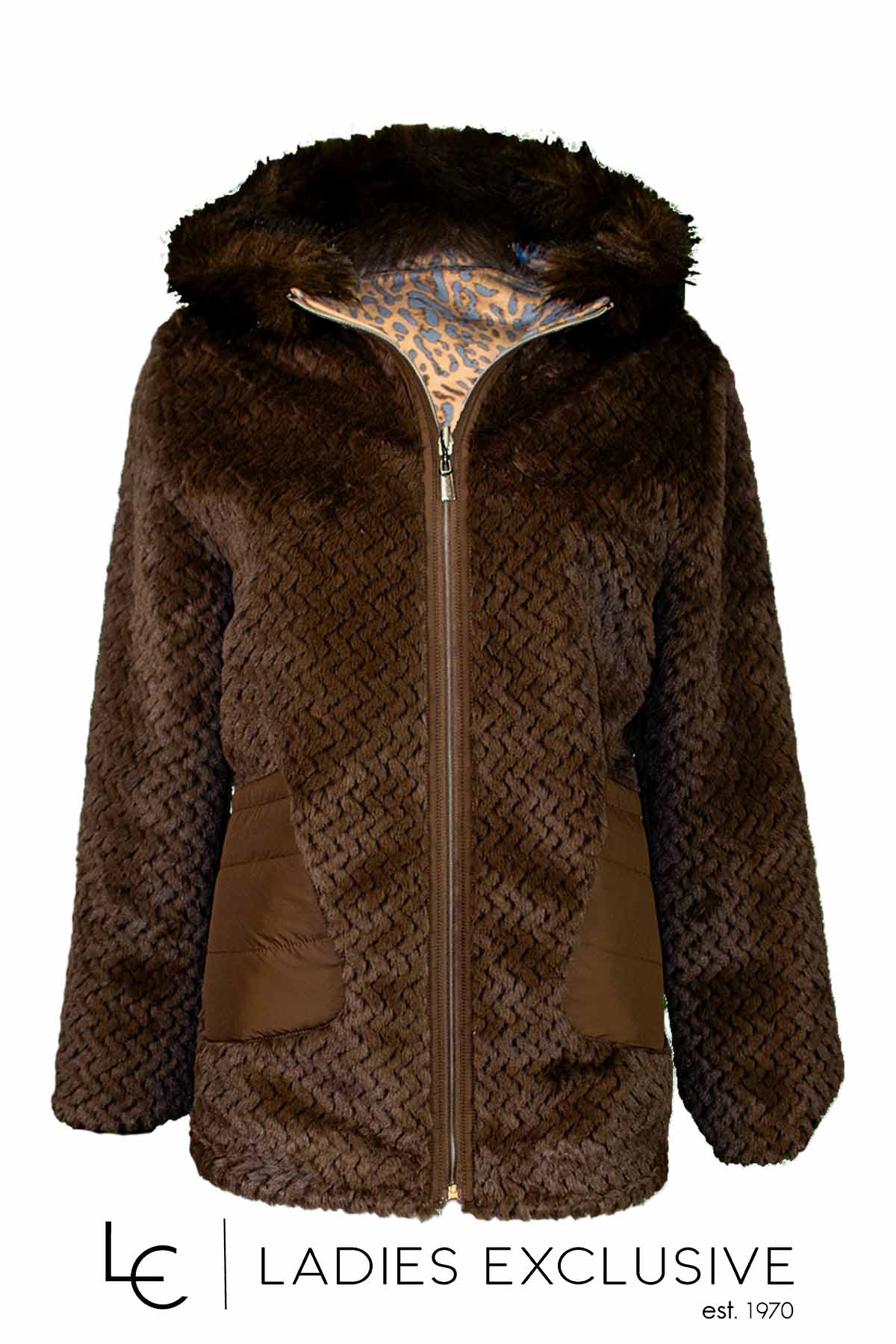 REVER Μπουφάν διπλής όψης με κουκούλα. Από την μια πλευρά εμπριμέ σουέντ και από την άλλη καφέ οικολογική φούνα.