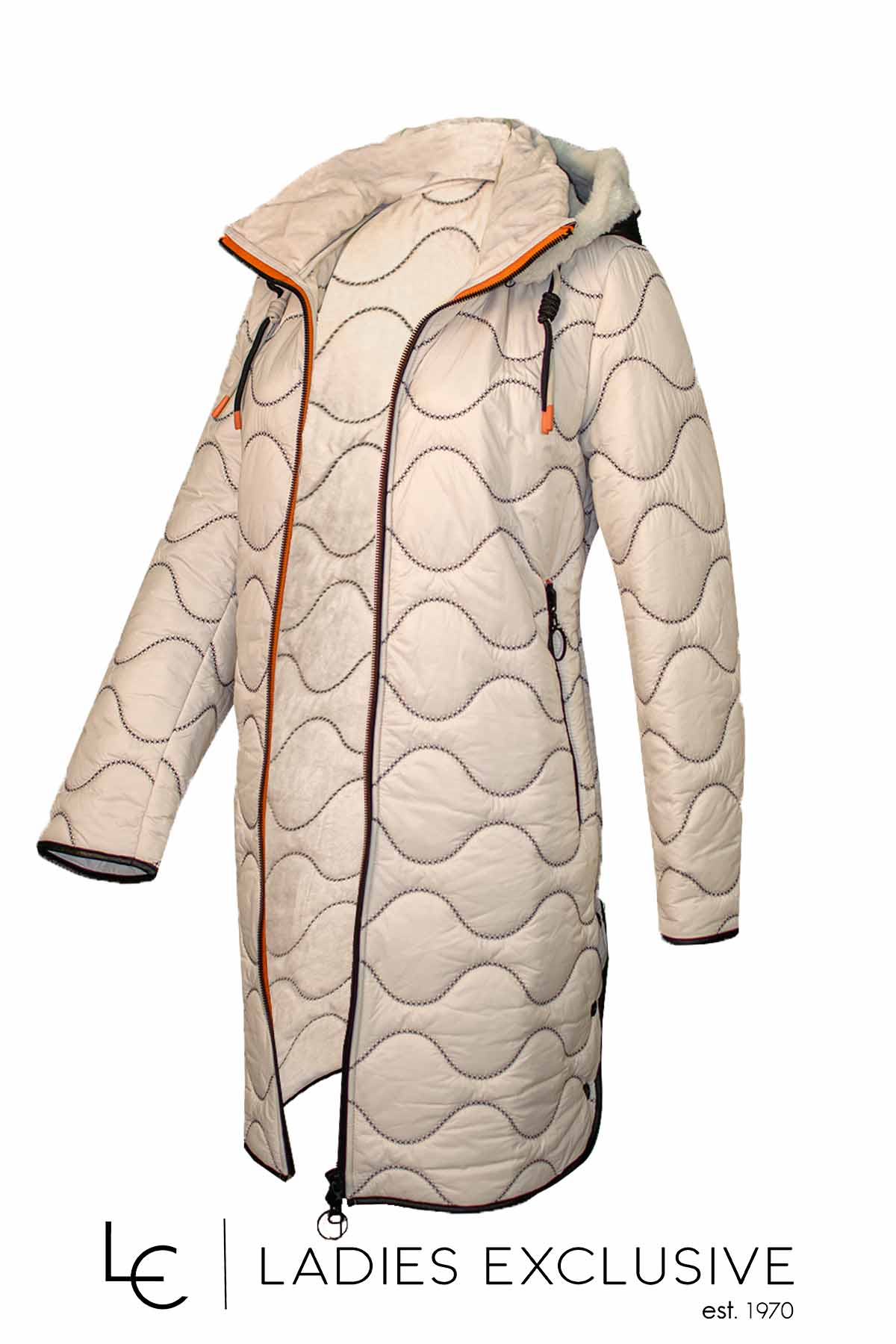 REVER Μπουφάν λευκό καπιτονέ με εξωτερικά μαύρα γαζιά και κουκούλα που αφαιρείται. Εσωτερικά έχει επένδυση γούνα.