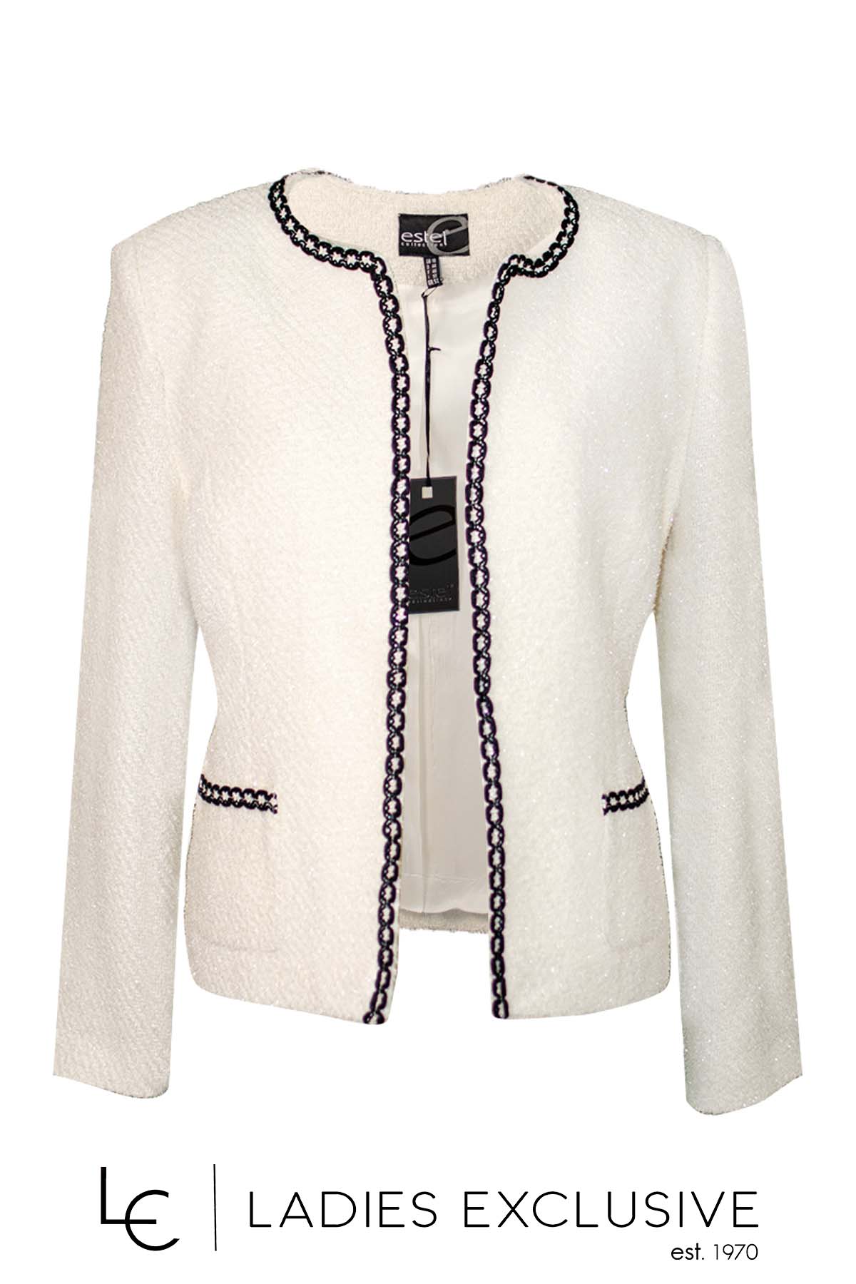 ESTEL Σακάκι εκρού μπουκλέ με λεπτομέρεια μαύρη τρέσα. ΔΙΝΕΤΑΙ ΜΟΝΟ ΣΑΝ ΣΕΤ με το φόρεμα με κωδικό 08553-00.24.